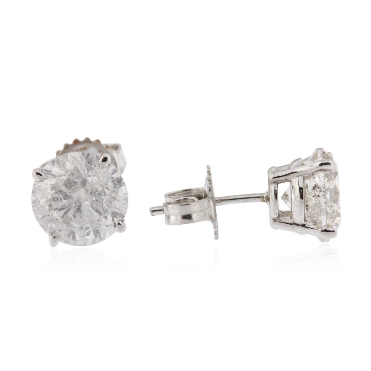 One electronically tested 14KT white gold Ladies cast stud earrings with friction posts with a bright polish finish. Condition is new. Identified with markings of "14K". Containing: One prong set round brilliant cut diamond, measuring 8.10 - 8.00 x 5.12mm (depth est.) approximate weight of 2.02ct. Clarity: I-3. Color: G, Cut is Good. One prong set round brilliant cut diamond, measuring 8.10 - 8.10 x 5.19mm (depth est.) approximate weight of 2.08ct. Clarity: I-3. Color: J, Cut is Good. Total Weight of Diamonds 4.10ct. Total Weight of Earrings 2.00 grams. GGL Appraised at $20,270.00.