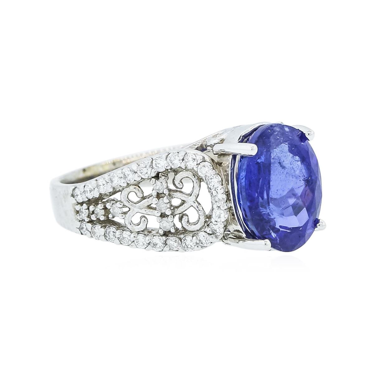 One electronically tested 14KT white gold ladies cast tanzanite and diamond ring with a bright polish finish. Identified with markings of "K14". Condition is new. Containing: One prong set rectangular cushion modified brilliant cut natural tanzanite, measuring 10.79 x 8.39 x 5.75mm, approximate weight of 4.10ct., clarity is moderately included, type I, medium, moderately strong, violetish blue color, (GIA vB 5/4), cut is good. Fifty-Eight prong set round brilliant cut diamonds, measuring 1.30 - 1.30 x 0.78mm (depth est.) approximate total weight of 58 Stones = 0.46ct. Clarity: SI-1 to SI-2. Color: H - I, Cut is Good. Colored gemstones are presumed to have been subjected to commonly used enhancement processes. All diamonds and colored gemstones are graded in the mounting, unless otherwise stated. Total Weight of Colored Stones 4.10ct. Total Weight of Diamonds 0.46ct. Total Weight of Ring 5.90 grams. GGL Appraised at $5,420.00.