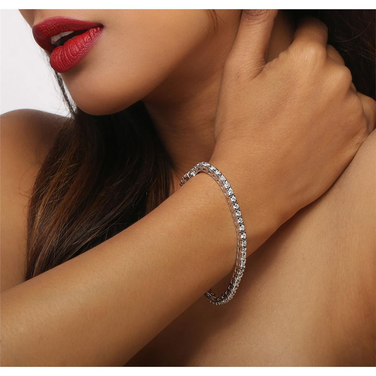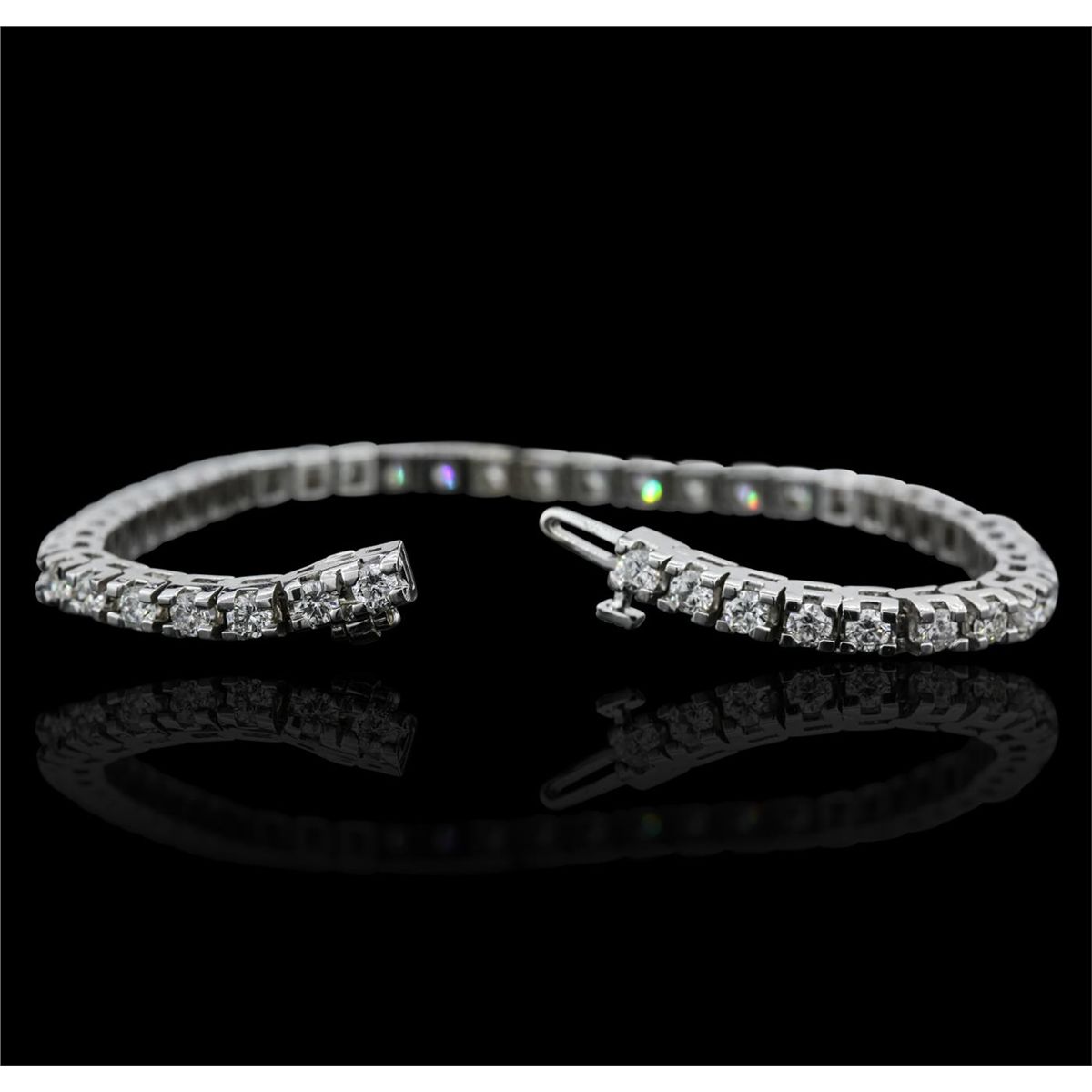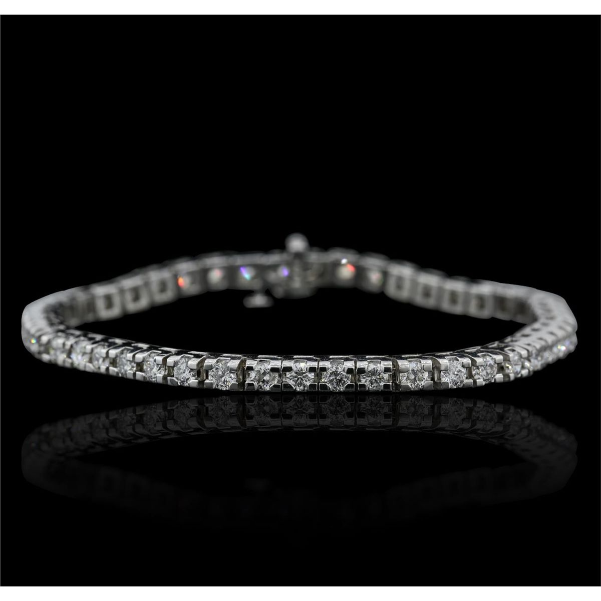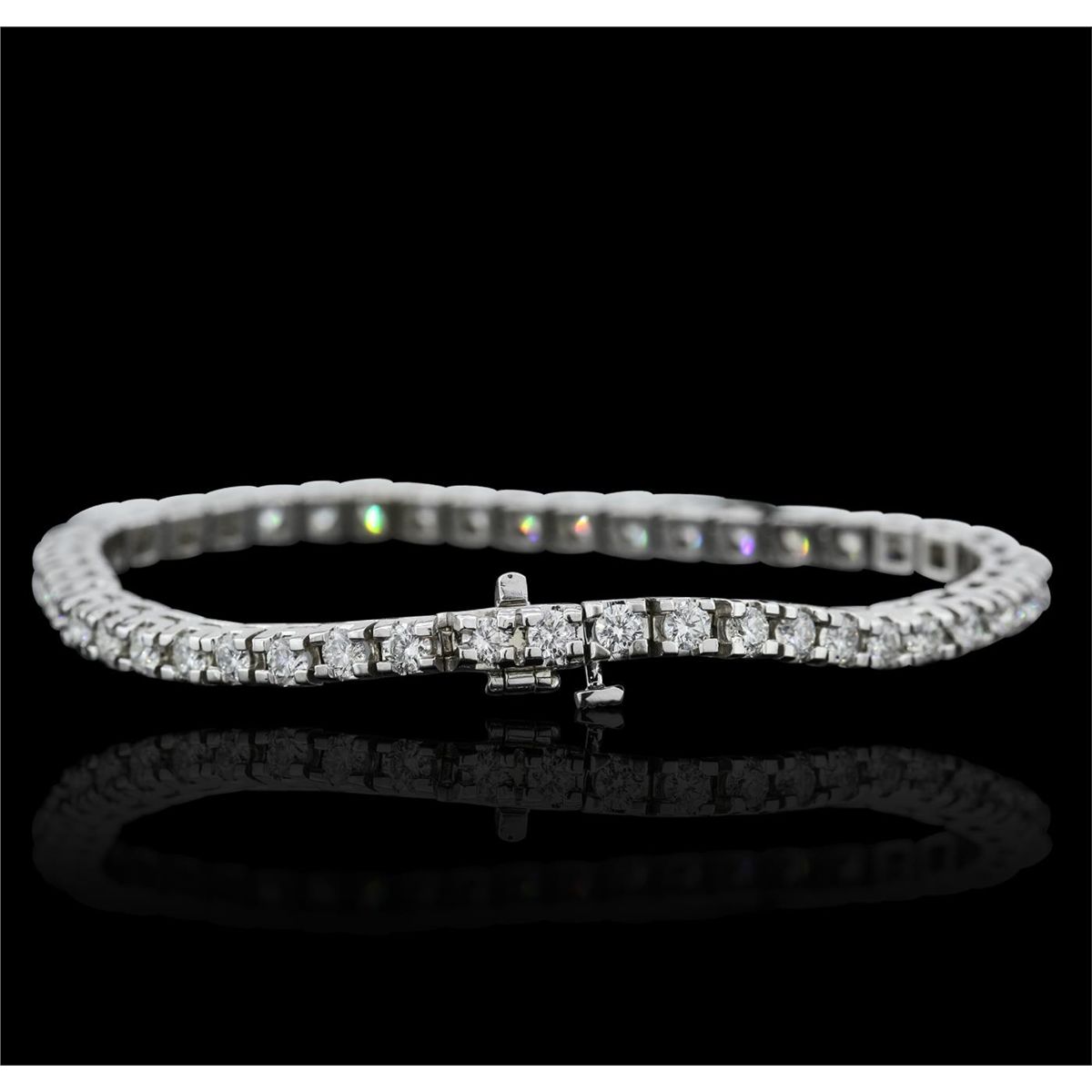 One electronically tested 14KT white gold ladies combination cast & assembled tennis bracelet with a hidden box clasp with a bright polish finish. Condition is new. Measurements: 6.85" in length. Identified with markings of "14K". Containing: Forty-Six prong set round brilliant cut diamonds, measuring 2.90 - 2.90 x 1.74mm (depth est.) approximate total weight of 46 Stones = 4.10ct. Clarity: SI-2 to I-1. Color: H - J, Cut is Good. All diamonds are graded in the mounting, unless otherwise stated. Total Weight of Diamonds 4.10ct. Total Weight of Bracelet 16.30 grams. GGL Appraised at $15,765.00.