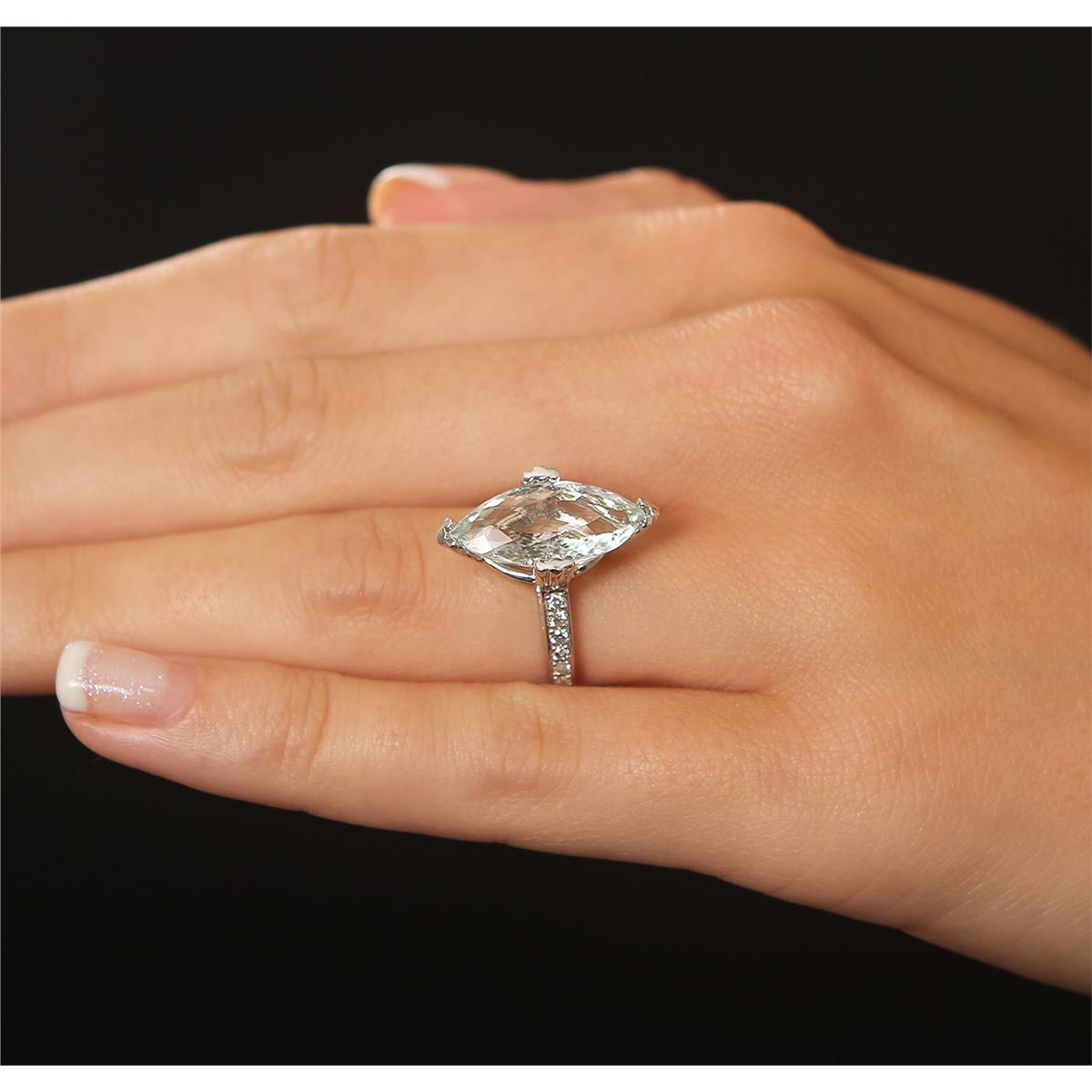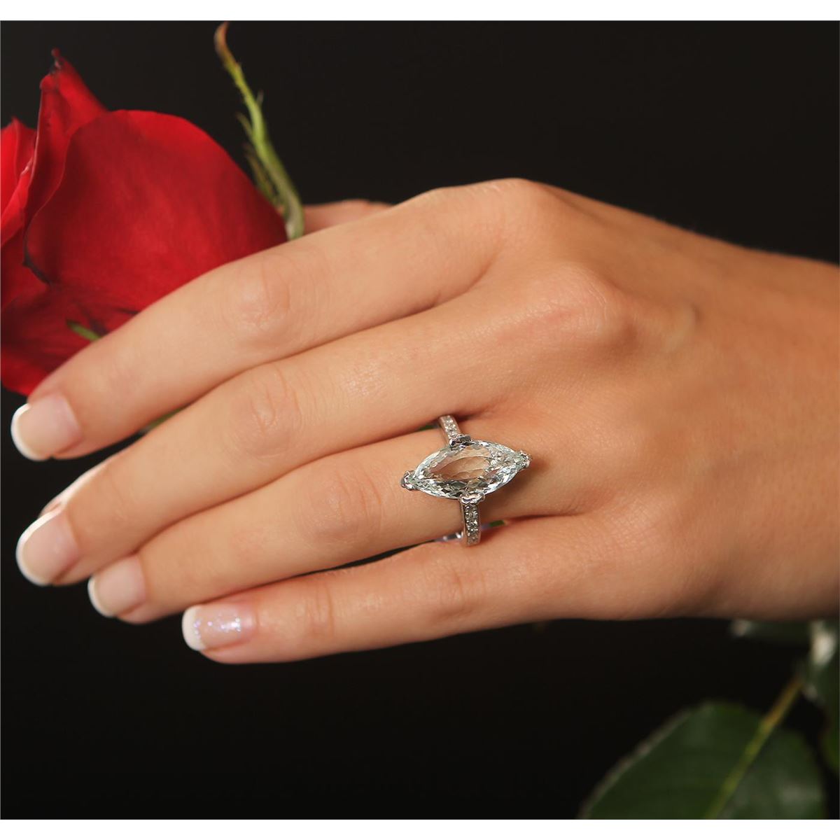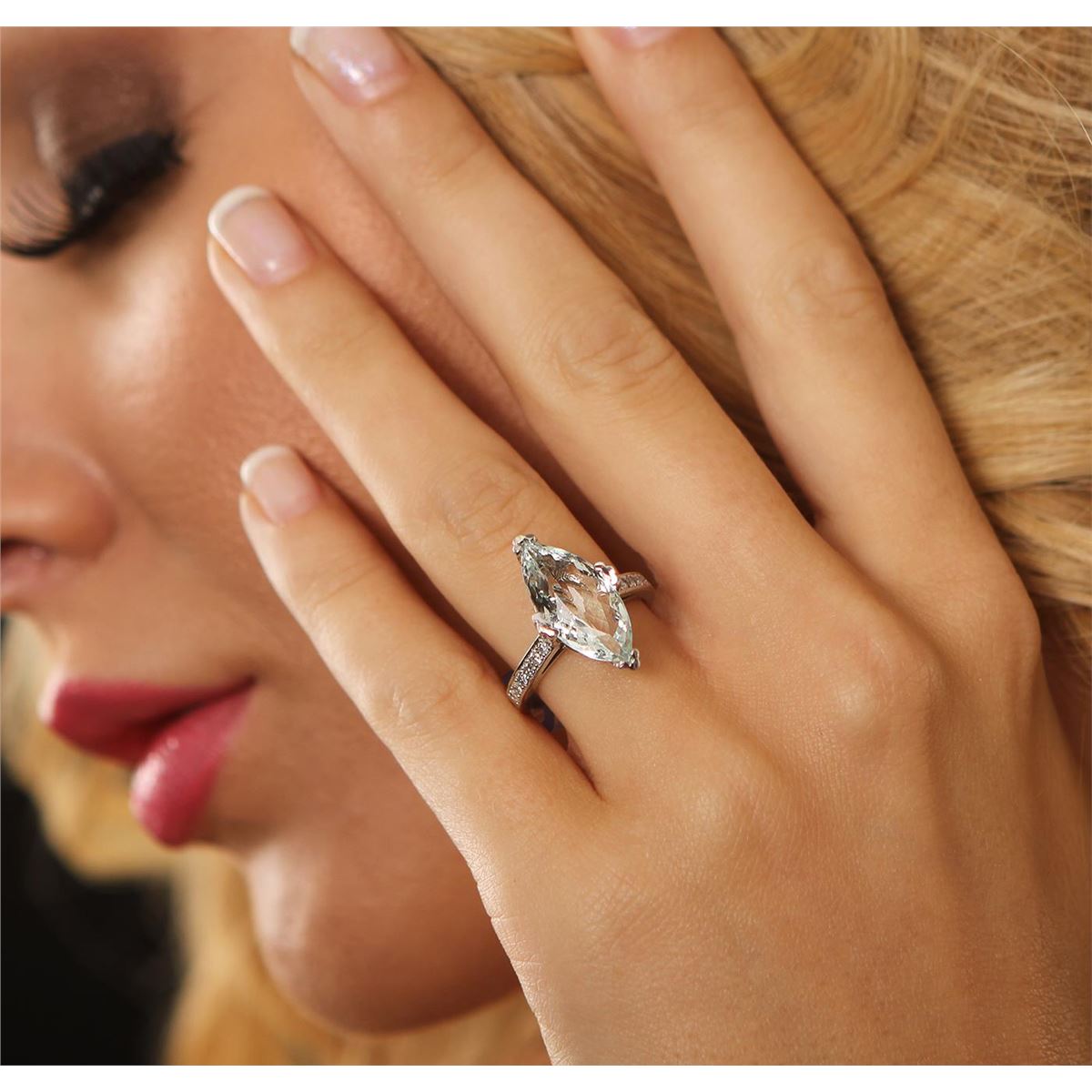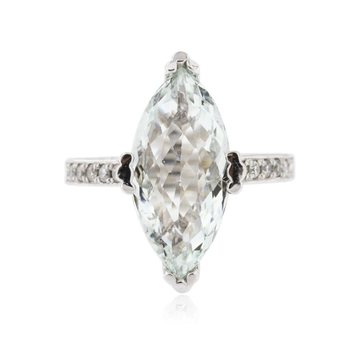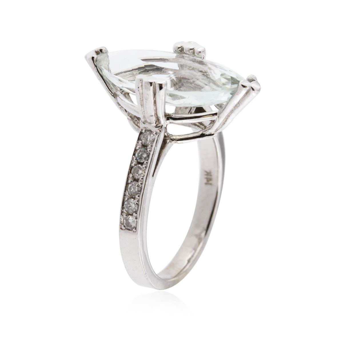 One polished, stamped, and electronically tested solid 14KT White Gold ring mounted with: 1 genuine aquamarine center stone with a total weight of 4.14ct and 12 genuine round full cut diamonds with a total weight of 0.18cts. This item weighs 4.8 grams, condition is new, very good workmanship. AIG Appraised at $3,360.00.