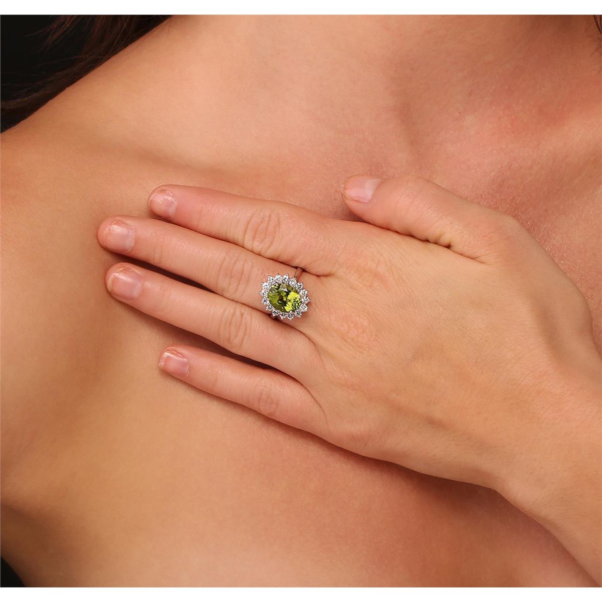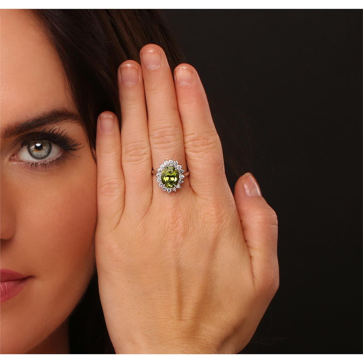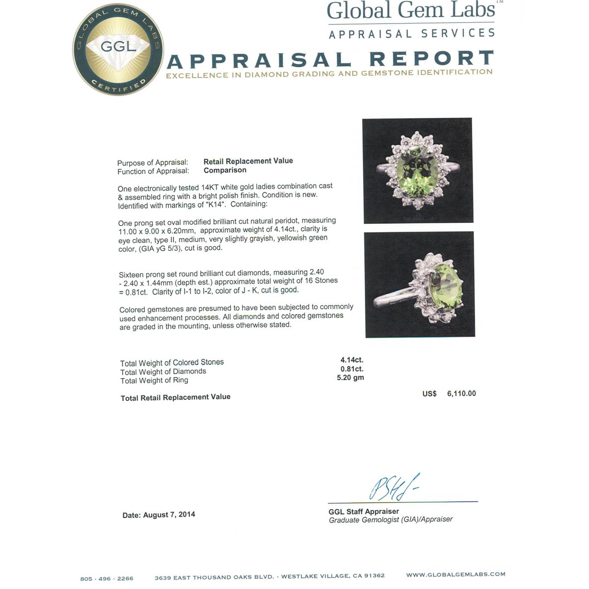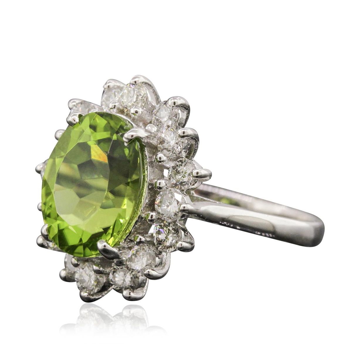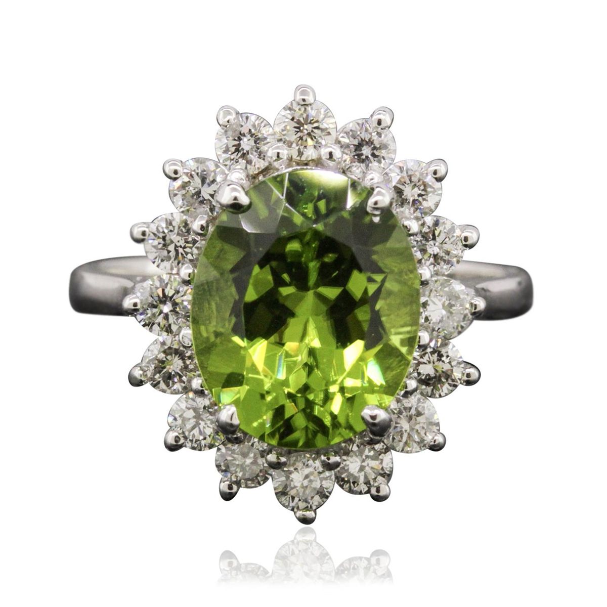 One electronically tested 14KT white gold ladies combination cast & assembled ring with a bright polish finish. Identified with markings of "K14". Condition is new. Containing: One prong set oval modified brilliant cut natural peridot, measuring 11.00 x 9.00 x 6.20mm, approximate weight of 4.14ct., clarity is eye clean, type II, medium, very slightly grayish, yellowish green color, (GIA yG 5/3), cut is good. Sixteen prong set round brilliant cut diamonds, measuring 2.40 - 2.40 x 1.44mm (depth est.) approximate total weight of 16 Stones = 0.81ct. Clarity: I-1 to I-2. Color: J - K, Cut is Good. Colored gemstones are presumed to have been subjected to commonly used enhancement processes. All diamonds and colored gemstones are graded in the mounting, unless otherwise stated. Total Weight of Colored Stones 4.14ct. Total Weight of Diamonds 0.81ct. Total Weight of Ring 5.20 grams. GGL Appraised at $6,110.00.