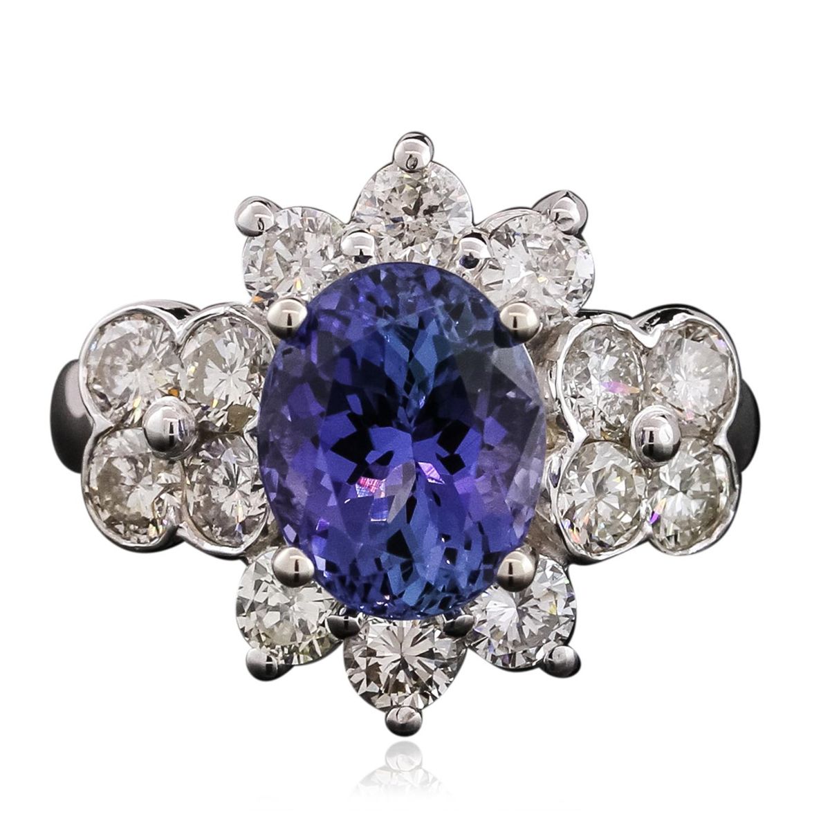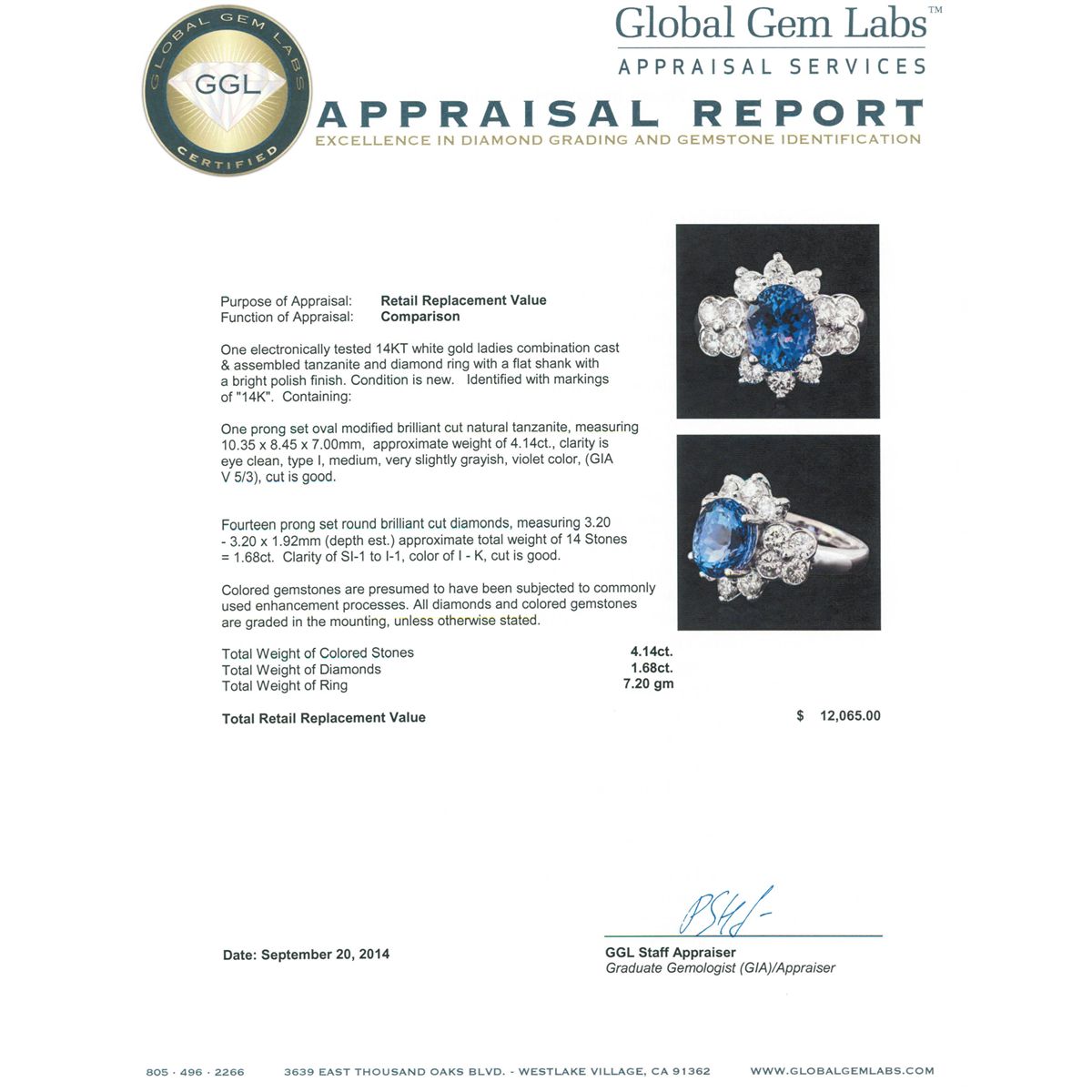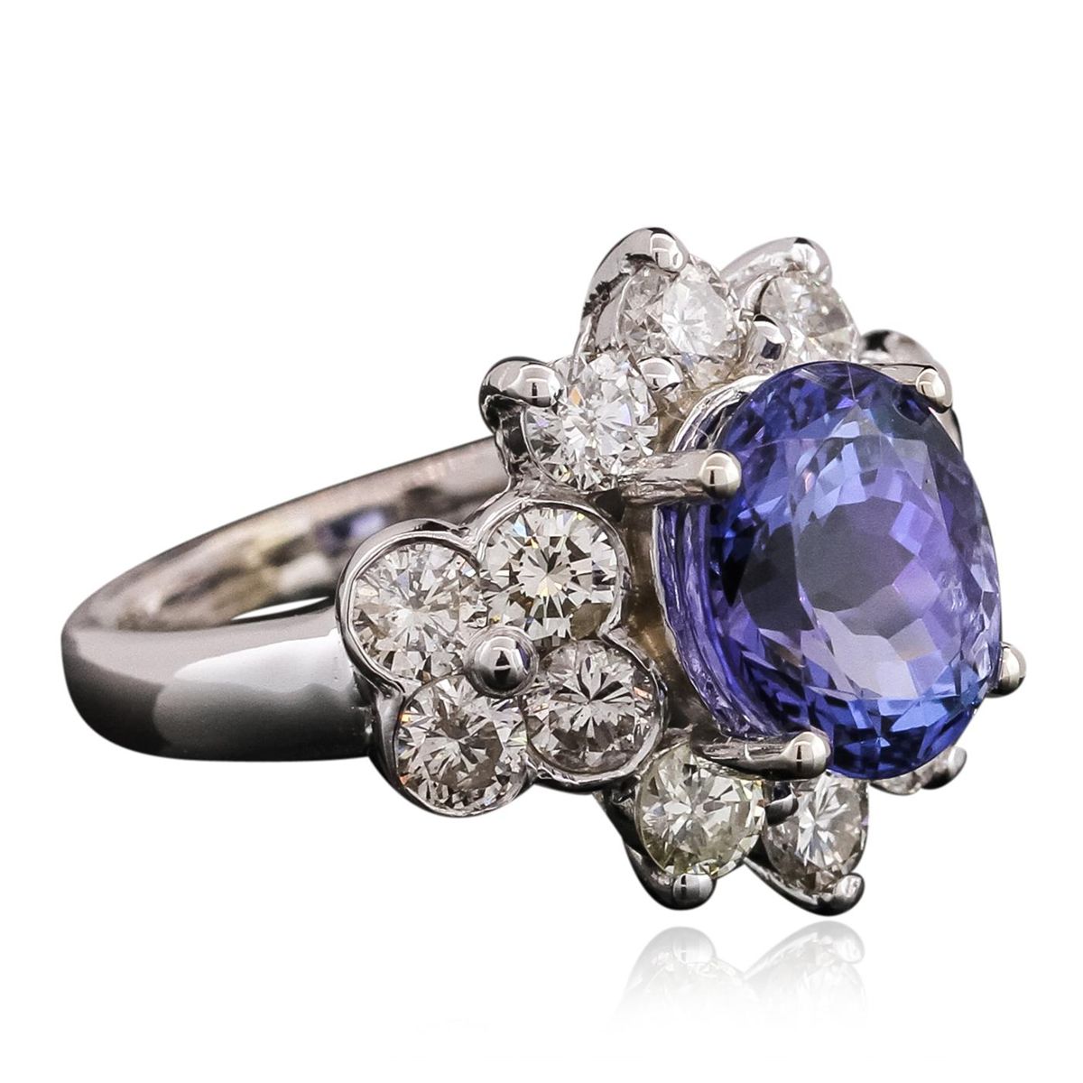 One electronically tested 14KT white gold ladies combination cast & assembled tanzanite and diamond ring with a flat shank with a bright polish finish. Identified with markings of "14K". Condition is new. Containing: One prong set oval modified brilliant cut natural tanzanite, measuring 10.35 x 8.45 x 7.00mm, approximate weight of 4.14ct., clarity is eye clean, type I, medium, very slightly grayish, violet color, (GIA V 5/3), cut is good. Fourteen prong set round brilliant cut diamonds, measuring 3.20 - 3.20 x 1.92mm (depth est.) approximate total weight of 14 Stones = 1.68ct. Clarity: SI-1 to I-1. Color: I - K, Cut is Good. Colored gemstones are presumed to have been subjected to commonly used enhancement processes. All diamonds and colored gemstones are graded in the mounting, unless otherwise stated. Total Weight of Colored Stones 4.14ct. Total Weight of Diamonds 1.68ct. Total Weight of Ring 7.20 grams. GGL Appraised at $12,065.00.