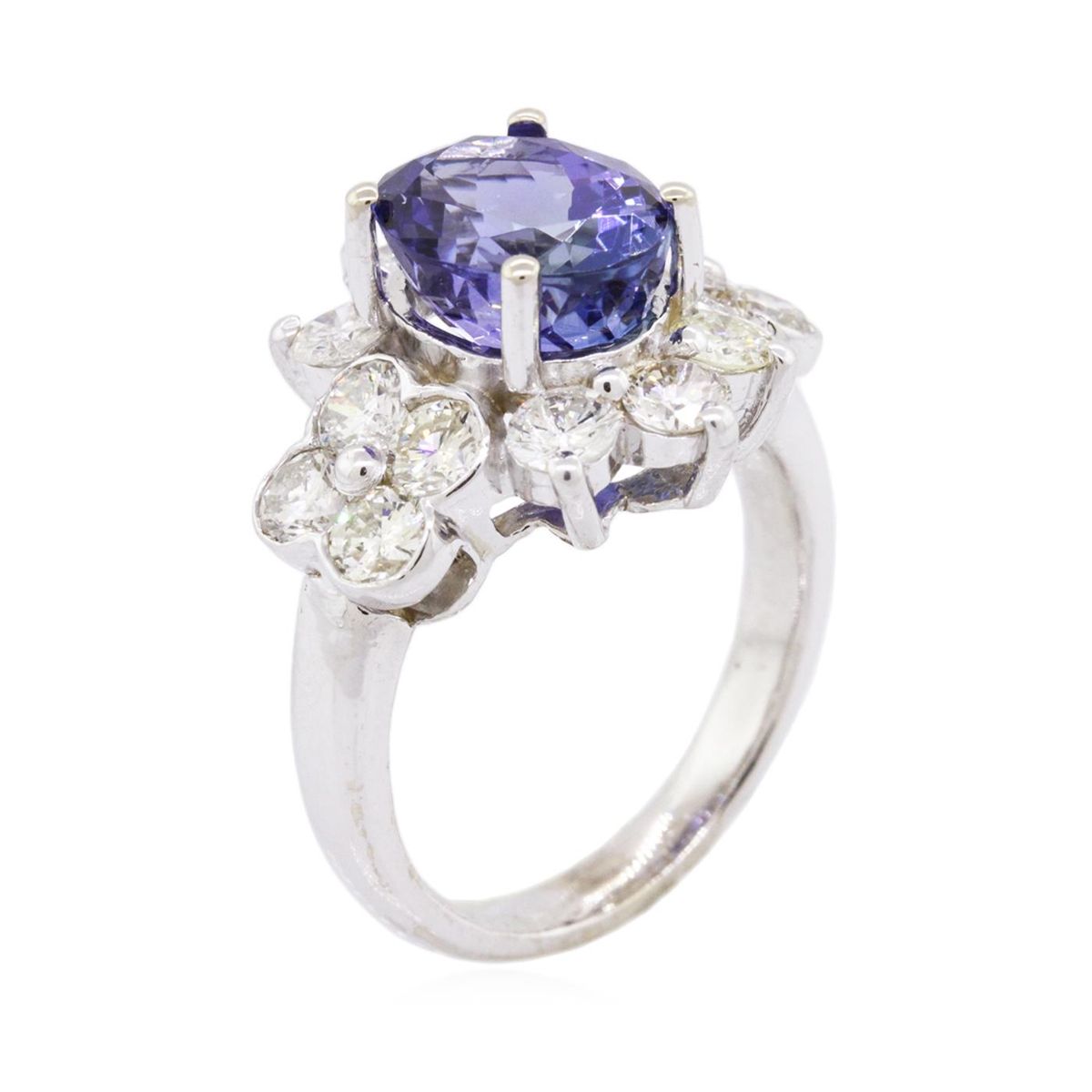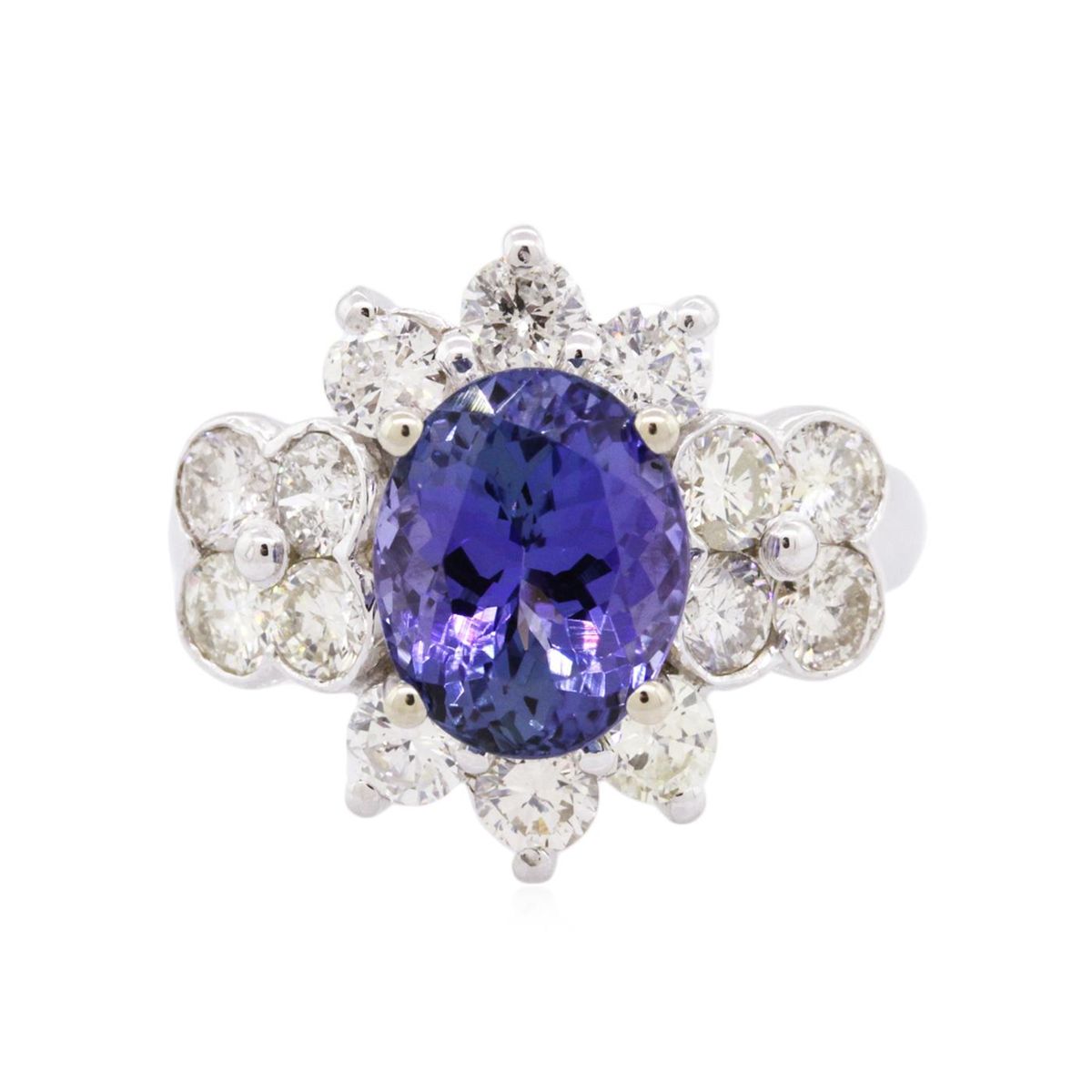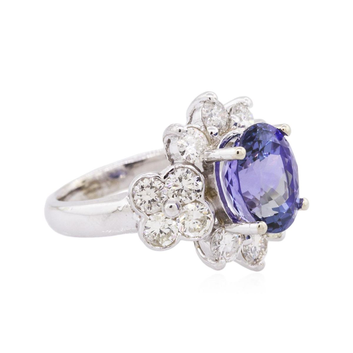 One electronically tested 14KT white gold ladies combination cast & assembled tanzanite and diamond ring with a flat shank with a bright polish finish. Identified with markings of "14K". Condition is new. Containing: One prong set oval modified brilliant cut natural tanzanite, measuring 10.35 x 8.45 x 7.00mm, approximate weight of 4.14ct., clarity is eye clean, type I, medium, very slightly grayish, violet color, (GIA V 5/3), cut is good. Fourteen prong set round brilliant cut diamonds, measuring 3.20 - 3.20 x 1.92mm (depth est.) approximate total weight of 14 Stones = 1.68ct. Clarity: SI-1 to I-1. Color: I - K, Cut is Good. Colored gemstones are presumed to have been subjected to commonly used enhancement processes. All diamonds and colored gemstones are graded in the mounting, unless otherwise stated. Total Weight of Colored Stones 4.14ct. Total Weight of Diamonds 1.68ct. Total Weight of Ring 7.20 grams. GGL Appraised at $12,065.00.
