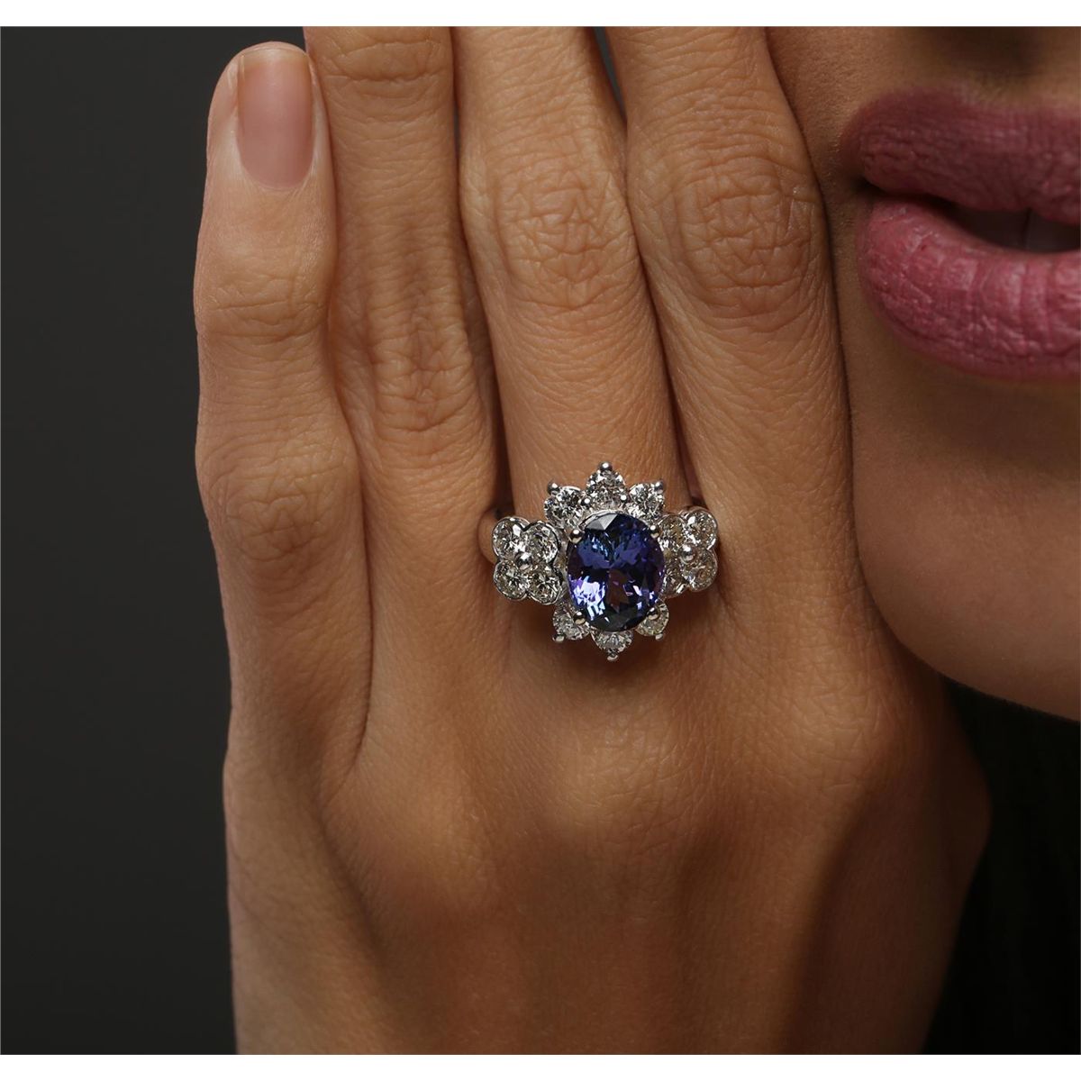 One electronically tested 14KT white gold ladies combination cast & assembled tanzanite and diamond ring with a flat shank with a bright polish finish. Identified with markings of "14K". Condition is new. Containing: One prong set oval modified brilliant cut natural tanzanite, measuring 10.35 x 8.45 x 7.00mm, approximate weight of 4.14ct., clarity is eye clean, type I, medium, very slightly grayish, violet color, (GIA V 5/3), cut is good. Fourteen prong set round brilliant cut diamonds, measuring 3.20 - 3.20 x 1.92mm (depth est.) approximate total weight of 14 Stones = 1.68ct. Clarity: SI-1 to I-1. Color: I - K, Cut is Good. Colored gemstones are presumed to have been subjected to commonly used enhancement processes. All diamonds and colored gemstones are graded in the mounting, unless otherwise stated. Total Weight of Colored Stones 4.14ct. Total Weight of Diamonds 1.68ct. Total Weight of Ring 7.20 grams. GGL Appraised at $12,065.00.