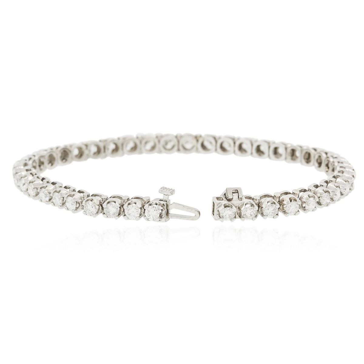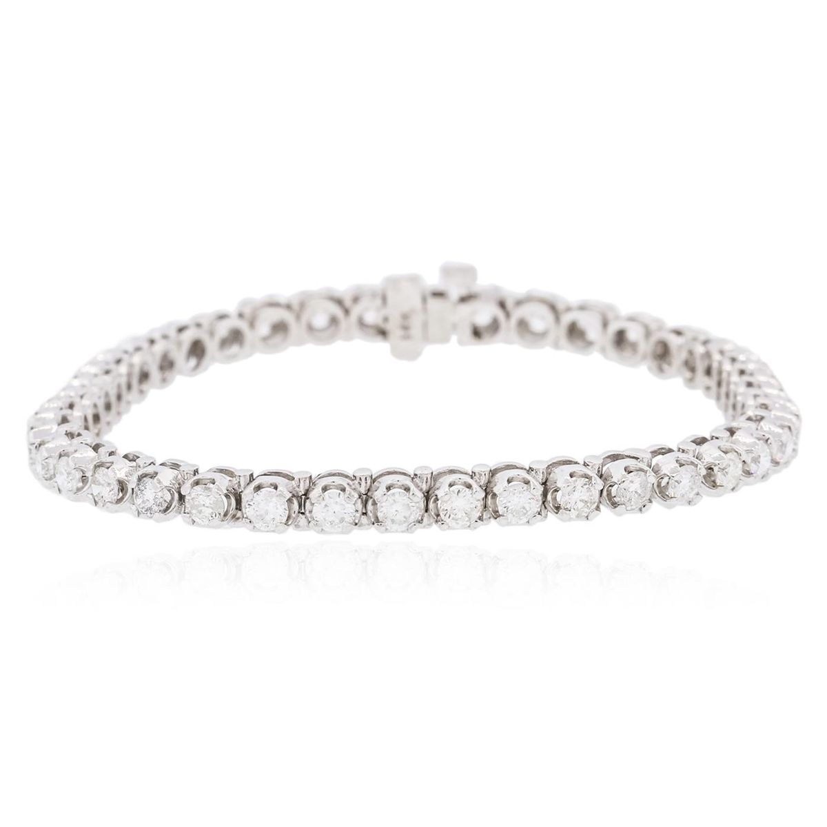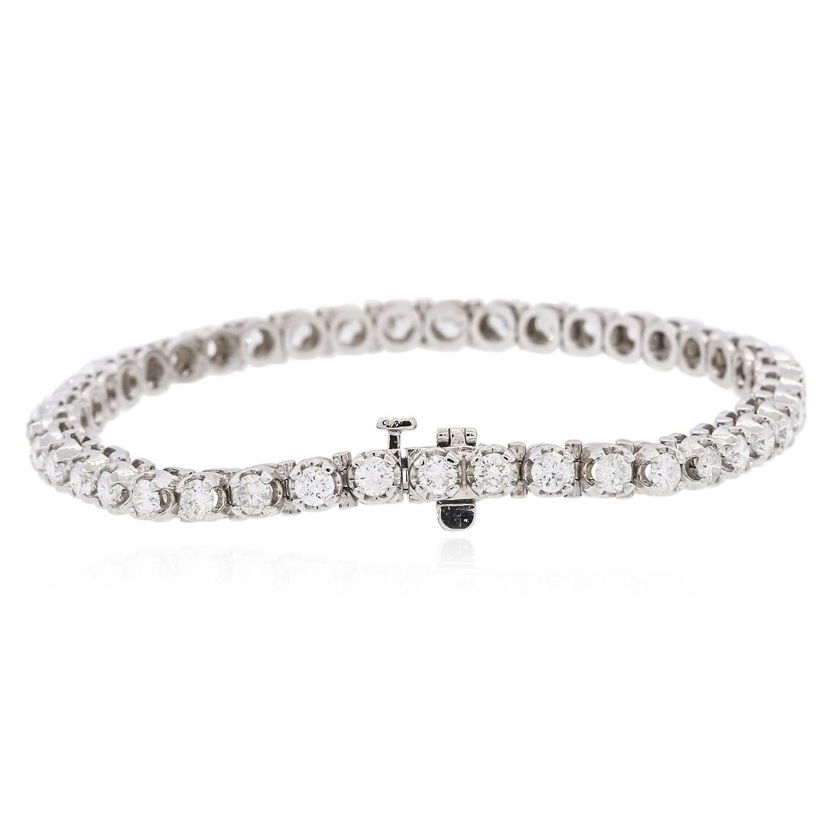 One electronically tested 14KT white gold ladies combination cast & assembled tennis bracelet with a hidden box clasp with a bright polish finish. Condition is new. Measurements: 7" in length. Identified with markings of "14K". Containing: Forty-Two prong set round brilliant cut diamonds, measuring 3.00 - 3.00 x 1.80mm (depth est.) approximate total weight of 42 Stones = 4.15ct. Clarity: SI-2 to I-2. Color: F - H, Cut is Good. All diamonds are graded in the mounting, unless otherwise stated. Total Weight of Diamonds 4.15ct. Total Weight of Bracelet 14.30 grams. GGL Appraised at $15,140.00.