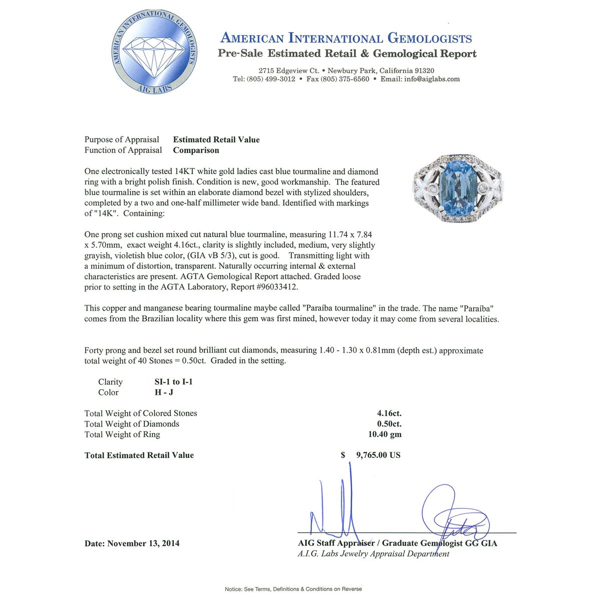 One electronically tested 14KT white gold ladies cast blue tourmaline and diamond ring with a bright polish finish. The featured blue tourmaline is set within an elaborate diamond bezel with stylized shoulders, completed by a two and one-half millimeter wide band. Identified with markings of "14K". Condition is new, good workmanship. Containing: One prong set cushion mixed cut natural blue tourmaline, measuring 11.74 x 7.84 x 5.70mm, exact weight 4.16ct., clarity is slightly included, medium, very slightly grayish, violetish blue color, (GIA vB 5/3), cut is good. Transmitting light with a minimum of distortion, transparent. Naturally occurring internal & external characteristics are present. AGTA Gemological Report attached. Graded loose prior to setting in the AGTA Laboratory, Report #96033412.This copper and manganese bearing tourmaline maybe called "Paraiba tourmaline" in the trade. The name "Paraiba" comes from the Brazilian locality where this gem was first mined, however today it may come from several localities. Forty prong and bezel set round brilliant cut diamonds, measuring 1.40 - 1.30 x 0.81mm (depth est.) approximate total weight of 40 Stones = 0.50ct. Graded in the setting. Clarity: SI-1 to I-1. Color: H - J. Total Weight of Colored Stones 4.16ct. Total Weight of Diamonds 0.50ct. Total Weight of Ring 10.40 grams. AIG Appraised at $9,765.00.