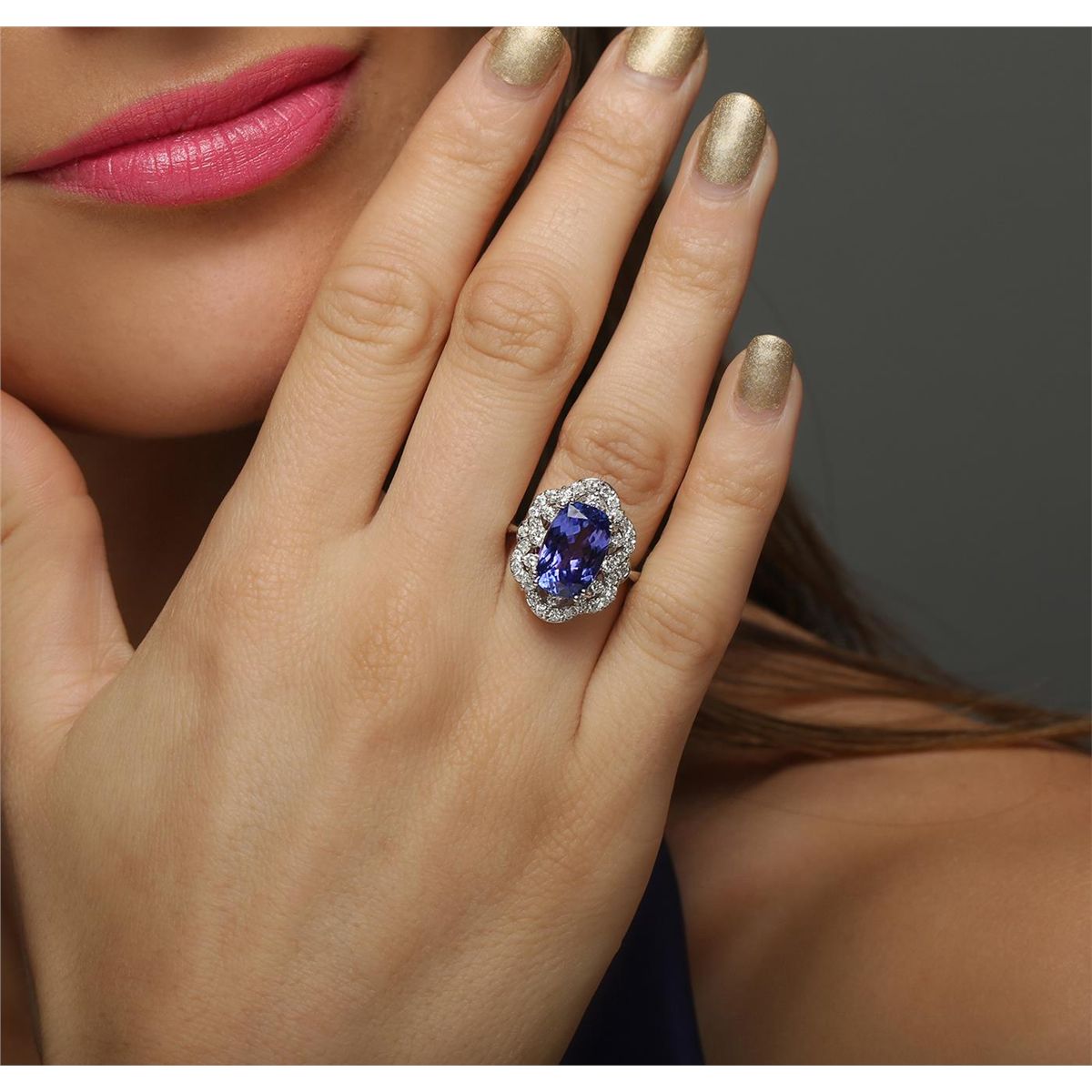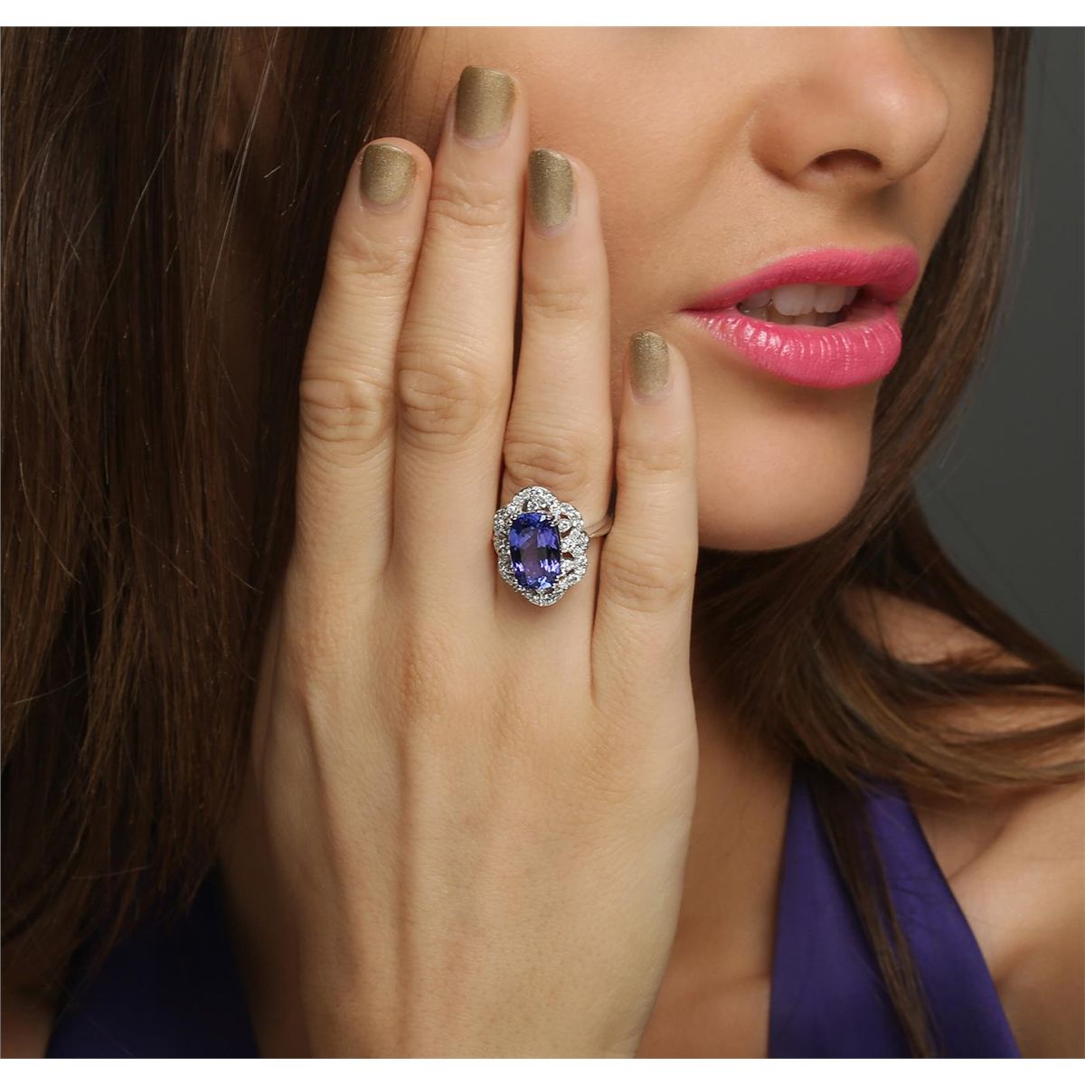 One electronically tested 14KT white gold ladies combination cast & assembled engagement ring with a bright polish finish. Identified with markings of "K14". Condition is new. Containing: One prong set rectangular cushion modified brilliant cut natural tanzanite, measuring 12.70 x 8.00 x 5.20mm, approximate weight of 4.16ct., clarity is eye clean, type I, medium, moderately strong, bluish violet color, (GIA bV 5/4), cut is good. Thirty-Nine prong set round brilliant cut diamonds, measuring 1.80 - 1.60 x 1.02mm (depth est.) approximate total weight of 39 Stones = 0.70ct. Clarity: I-1 to I-2. Color: I - J, Cut is Good. Colored gemstones are presumed to have been subjected to commonly used enhancement processes. All diamonds and colored gemstones are graded in the mounting, unless otherwise stated. Total Weight of Colored Stones 4.16ct. Total Weight of Diamonds 0.70ct. Total Weight of Ring 6.20 grams. GGL Appraised at $9,585.00.