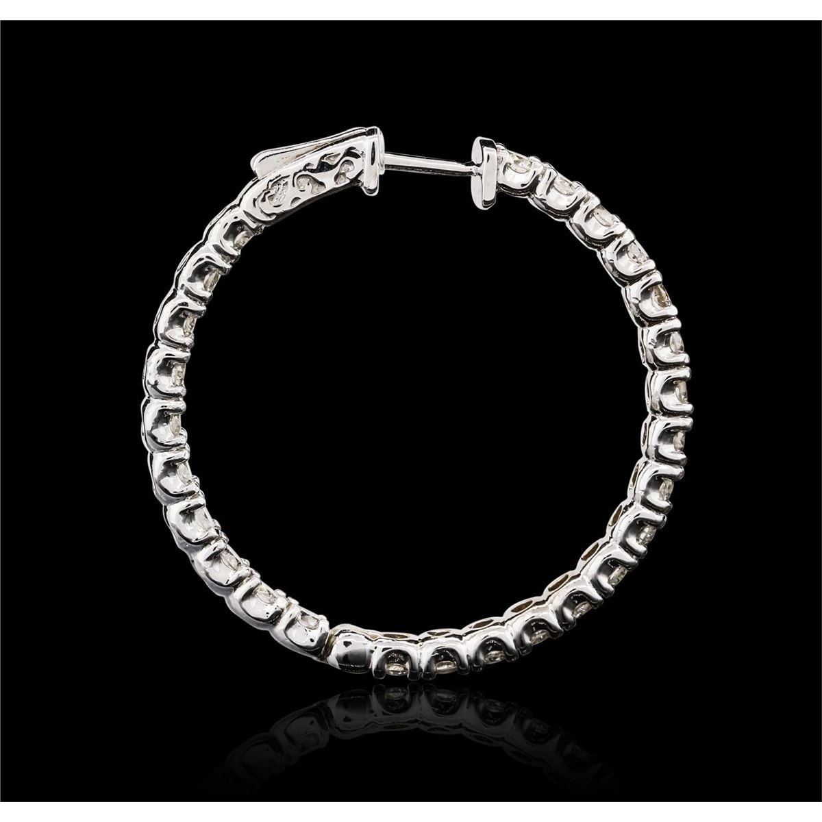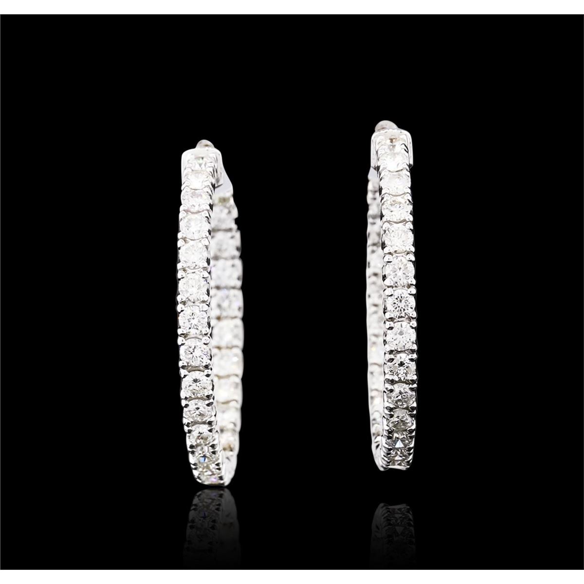 One pair electronically tested 14KT white gold ladies combination cast & assembled hoop earrings with hinged clip backs with a bright polish finish. Identified with markings of "14K". Condition is new. Containing: Fifty-Two prong set round brilliant cut diamonds, measuring 2.80 - 2.80 x 1.68mm (depth est.) approximate total weight of 52 Stones = 4.18ct. Clarity: SI-2 to I-1. Color: I - J, Cut is Good. All diamonds are graded in the mounting, unless otherwise stated. Total Weight of Diamonds 4.18ct. Total Weight of Earrings 13.60 grams. GGL Appraised at $10,640.00.