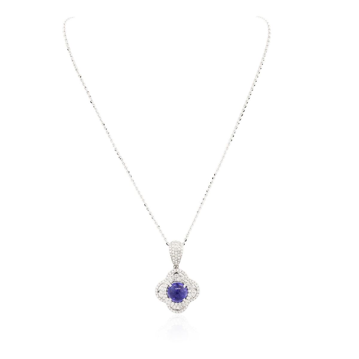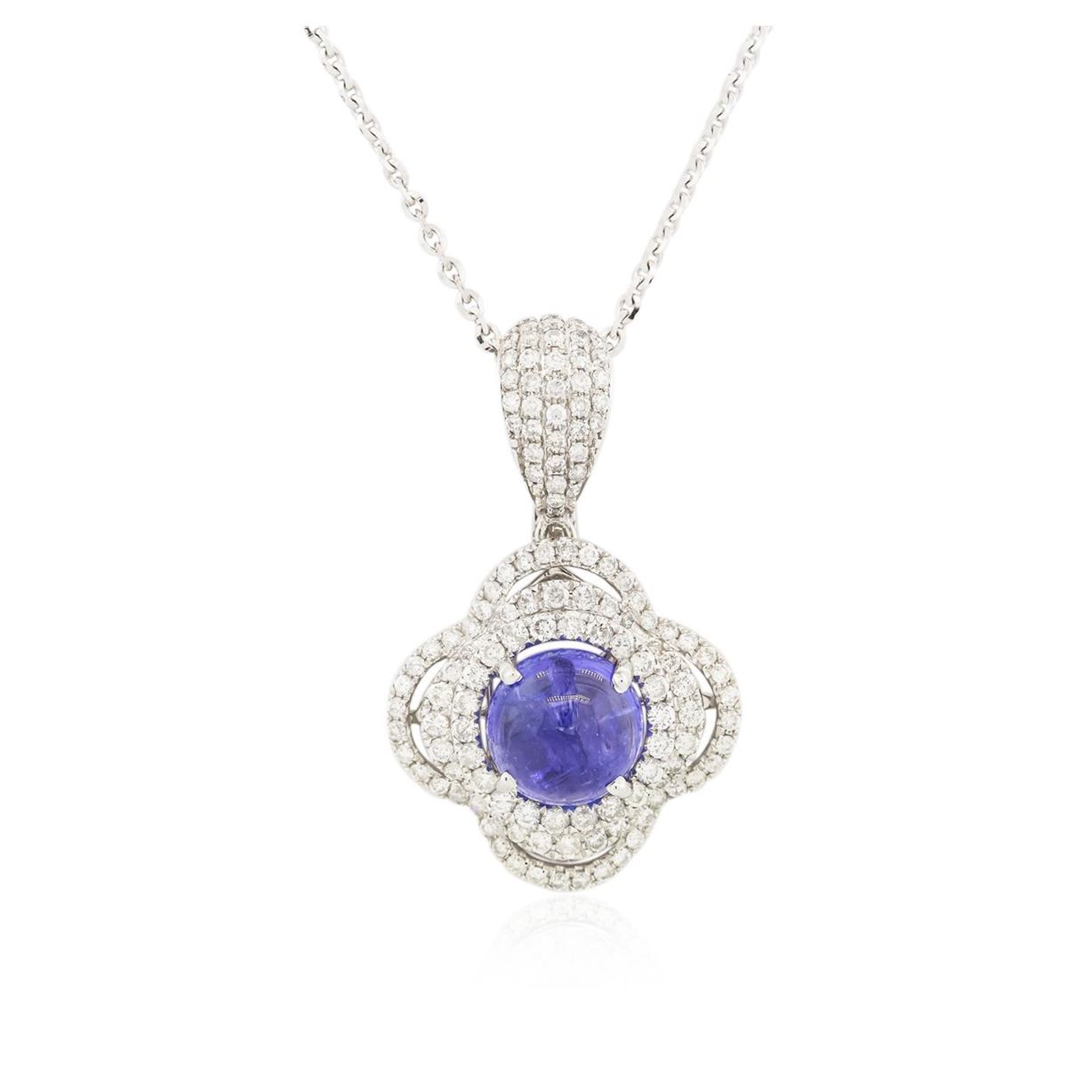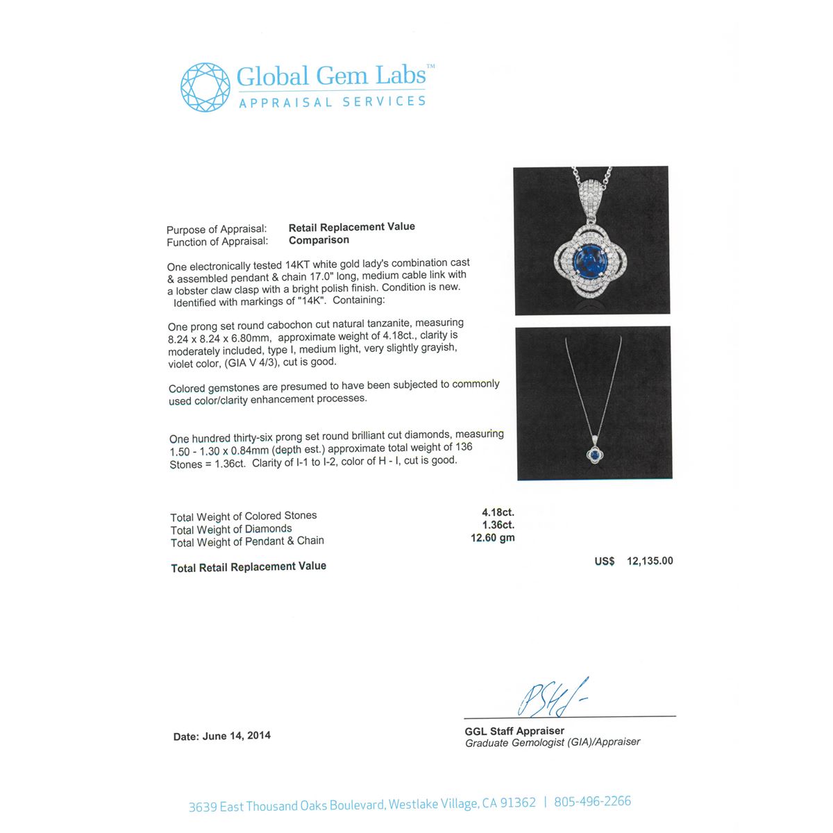 One electronically tested 14KT white gold Ladies combination cast & assembled pendant & chain 17.0" long, medium cable link with a lobster claw clasp with a bright polish finish. Condition is new. Identified with markings of "14K". Containing: One prong set round cabochon cut natural tanzanite, measuring 8.24 x 8.24 x 6.80mm, approximate weight of 4.18ct., clarity is moderately included, type I, medium light, very slightly grayish, violet color, (GIA V 4/3), cut is good. Colored gemstones are presumed to have been subjected to commonly used color/clarity enhancement processes. One Hundred Thirty-Six prong set round brilliant cut diamonds, measuring 1.50 - 1.30 x 0.84mm (depth est.) approximate. Total Weight of 136 Stones = 1.36ct. Clarity: I-1 to I-2. Color: H - I, Cut is Good. Total Weight of Colored Stones 4.18ct. Total Weight of Diamonds 1.36ct. Total Weight of Pendant & Chain 12.60 grams. GGL Appraised at $12,135.00.