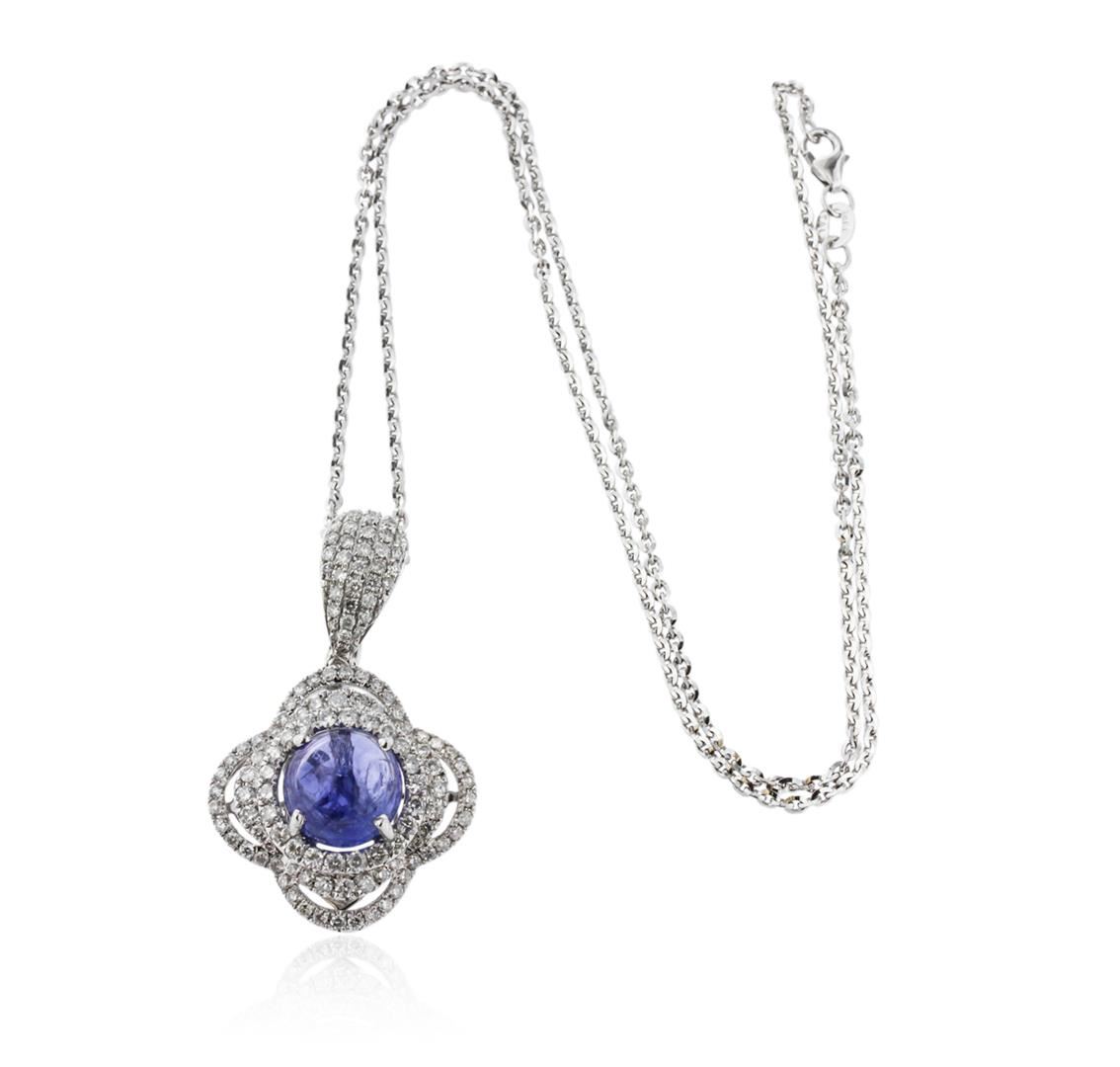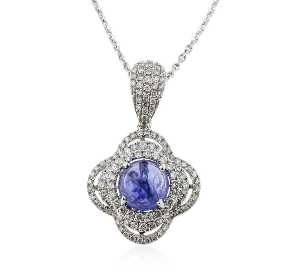One electronically tested 14KT white gold Ladies combination cast & assembled pendant & chain 17.0" long, medium cable link with a lobster claw clasp with a bright polish finish. Condition is new. Identified with markings of "14K". Containing: One prong set round cabochon cut natural tanzanite, measuring 8.24 x 8.24 x 6.80mm, approximate weight of 4.18ct., clarity is moderately included, type I, medium light, very slightly grayish, violet color, (GIA V 4/3), cut is good. Colored gemstones are presumed to have been subjected to commonly used color/clarity enhancement processes. One Hundred Thirty-Six prong set round brilliant cut diamonds, measuring 1.50 - 1.30 x 0.84mm (depth est.) approximate. Total Weight of 136 Stones = 1.36ct. Clarity: I-1 to I-2. Color: H - I, Cut is Good. Total Weight of Colored Stones 4.18ct. Total Weight of Diamonds 1.36ct. Total Weight of Pendant & Chain 12.60 grams. GGL Appraised at $12,135.00.