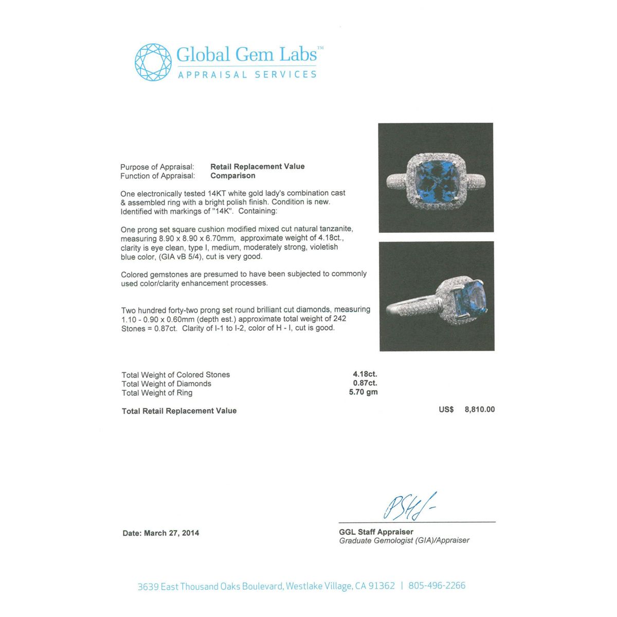 One electronically tested 14KT white gold Ladies combination cast & assembled ring with a bright polish finish. Condition is new. Identified with markings of "14K". Containing: One prong set square cushion modified mixed cut natural tanzanite, measuring 8.90 x 8.90 x 6.70mm, approximate weight of 4.18ct., clarity is eye clean, type I, medium, moderately strong, violetish blue color, (GIA vB 5/4), cut is very good. Colored gemstones are presumed to have been subjected to commonly used color/clarity enhancement processes. Two Hundred Forty-Two prong set round brilliant cut diamonds, measuring 1.10 - 0.90 x 0.60mm (depth est.) approximate. Total Weight of 242 Stones = 0.87ct. Clarity: I-1 to I-2. Color: H - I, Cut is Good. Total Weight of Colored Stones 4.18ct. Total Weight of Diamonds 0.87ct. Total Weight of Ring 5.70 grams. GGL Appraised at $8,810.00.