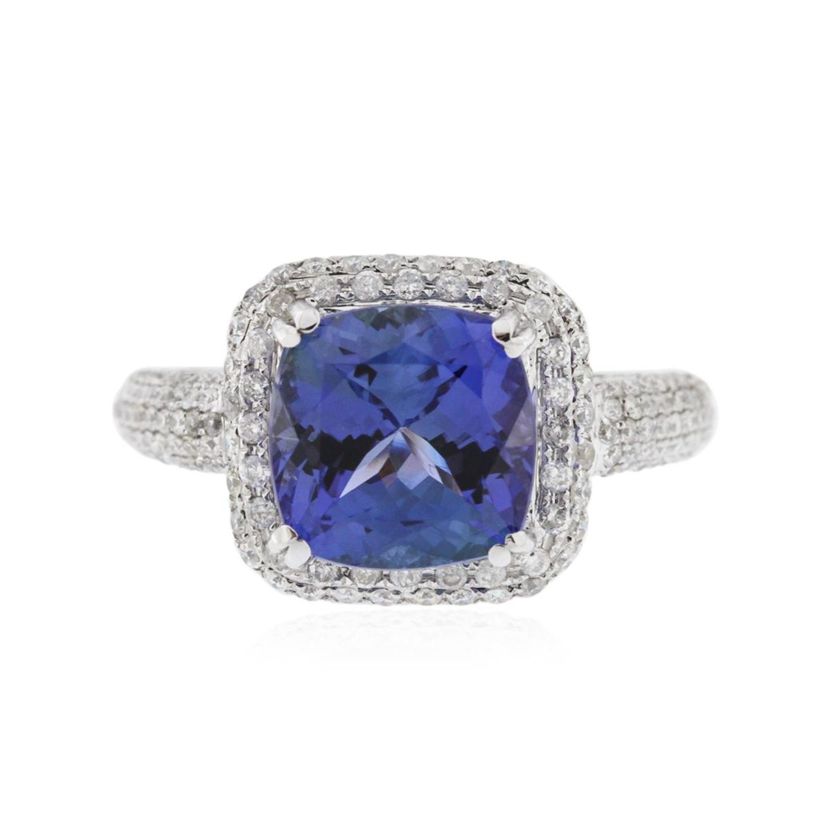 One electronically tested 14KT white gold Ladies combination cast & assembled ring with a bright polish finish. Condition is new. Identified with markings of "14K". Containing: One prong set square cushion modified mixed cut natural tanzanite, measuring 8.90 x 8.90 x 6.70mm, approximate weight of 4.18ct., clarity is eye clean, type I, medium, moderately strong, violetish blue color, (GIA vB 5/4), cut is very good. Colored gemstones are presumed to have been subjected to commonly used color/clarity enhancement processes. Two Hundred Forty-Two prong set round brilliant cut diamonds, measuring 1.10 - 0.90 x 0.60mm (depth est.) approximate. Total Weight of 242 Stones = 0.87ct. Clarity: I-1 to I-2. Color: H - I, Cut is Good. Total Weight of Colored Stones 4.18ct. Total Weight of Diamonds 0.87ct. Total Weight of Ring 5.70 grams. GGL Appraised at $8,810.00.