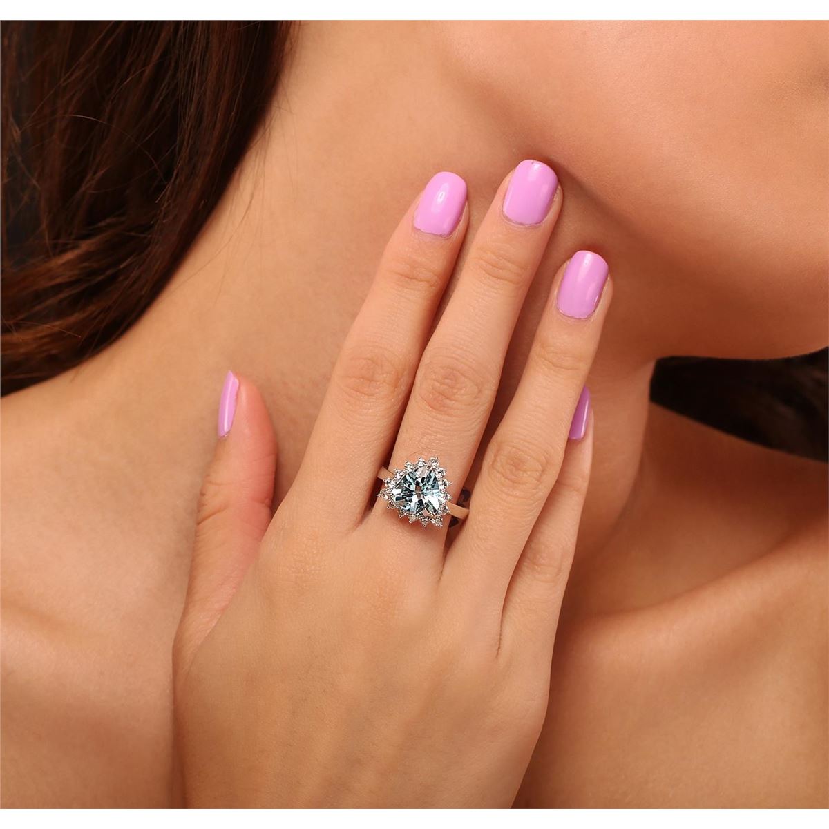 One electronically tested 14KT white gold ladies cast blue topaz and diamond ring with a bright polish finish. Condition is new, good workmanship. The featured blue topaz is set within a diamond set bezel supported by an open gallery completed by a tapering three millimeter wide band. Trademark is Orianne. Identified with markings of "14K". Containing: One prong set modified triangle modified mixed cut natural blue topaz, measuring 10.00 x 10.00 x 6.00mm, 10%. bulge factor, approximate weight of 4.19ct., clarity is eye clean, type I, medium, very slightly grayish, very slightly greenish blue color, (GIA vslgB 5/3), cut is good. Transmitting light with no distortion, transparent. Graded in the setting. A deposit of a thin layer has been applied to the topaz to produce the intense color effect. The process utilizes a very high temperature treatment, diffusion of ions into the topaz, plus in some cases neutron bombardment has been used to create the color center. Diffusion processes causes the added ions to become part of the crystal surface with no distinct boundary. Do not put a gem treated in this manner into an ultrasonic cleaner. Fourteen prong set round brilliant cut diamonds, measuring 2.30 - 2.20 x 1.37mm (depth est.) approximate. Total Weight of 14 Stones = 0.69ct. Faint brown secondary color throughout. Graded in the setting. Clarity: SI-1 to I-1. Color: J - L. Total Weight of Colored Stones 4.19ct. Total Weight of Diamonds 0.69ct. Total Weight of Ring 3.95 grams. AIG Appraised at $2,355.00.