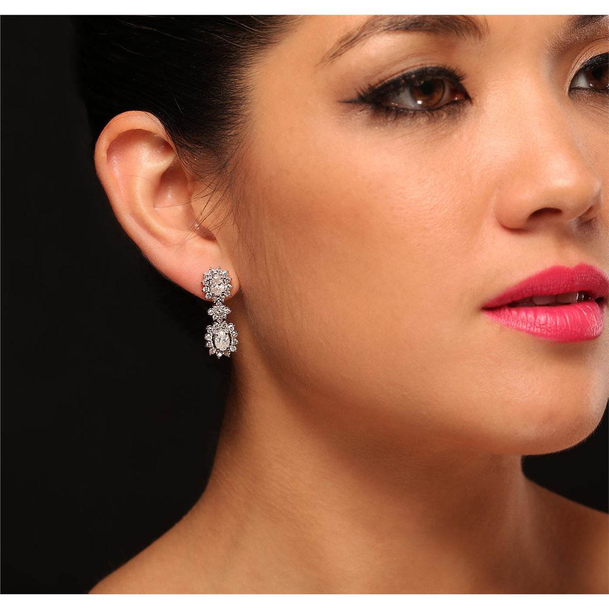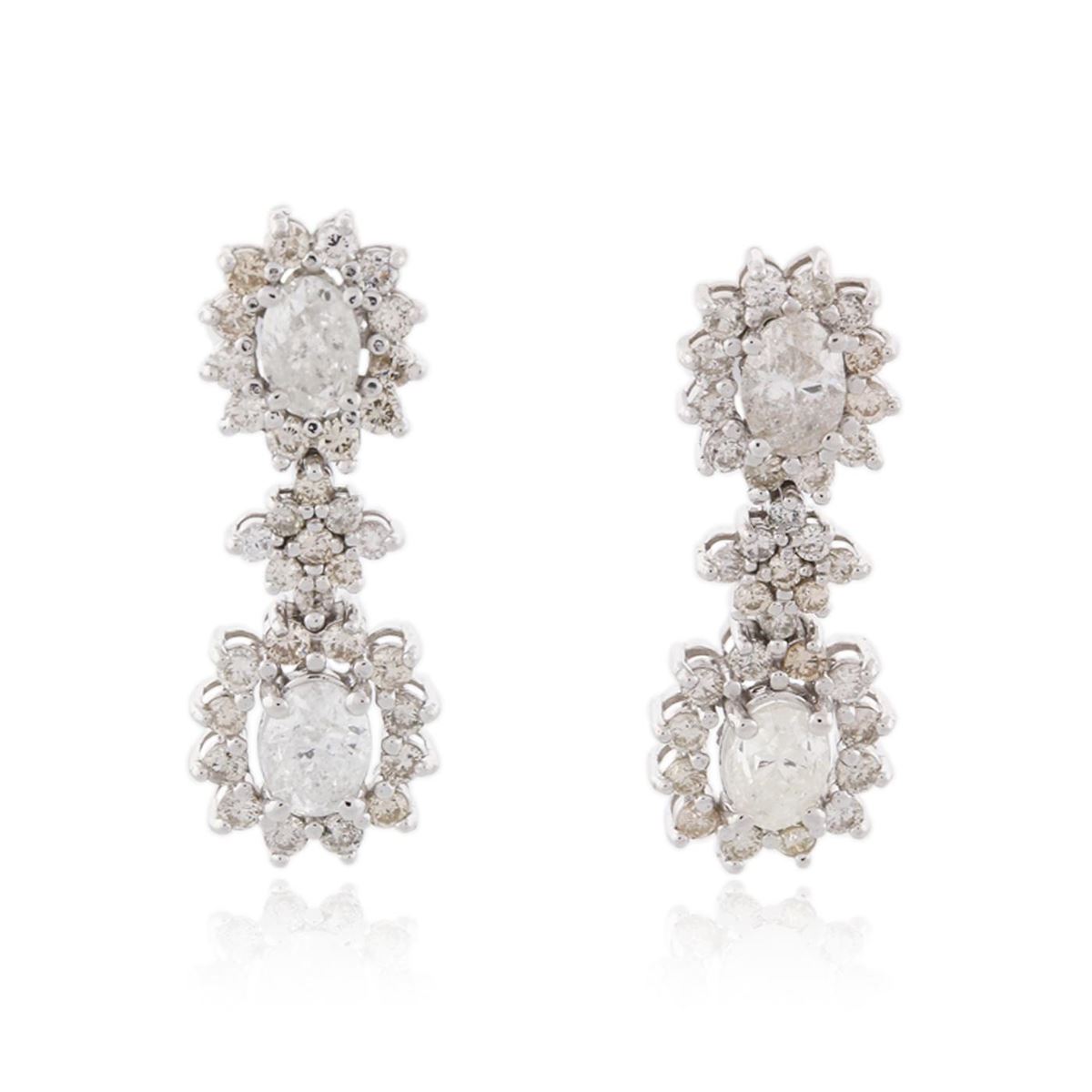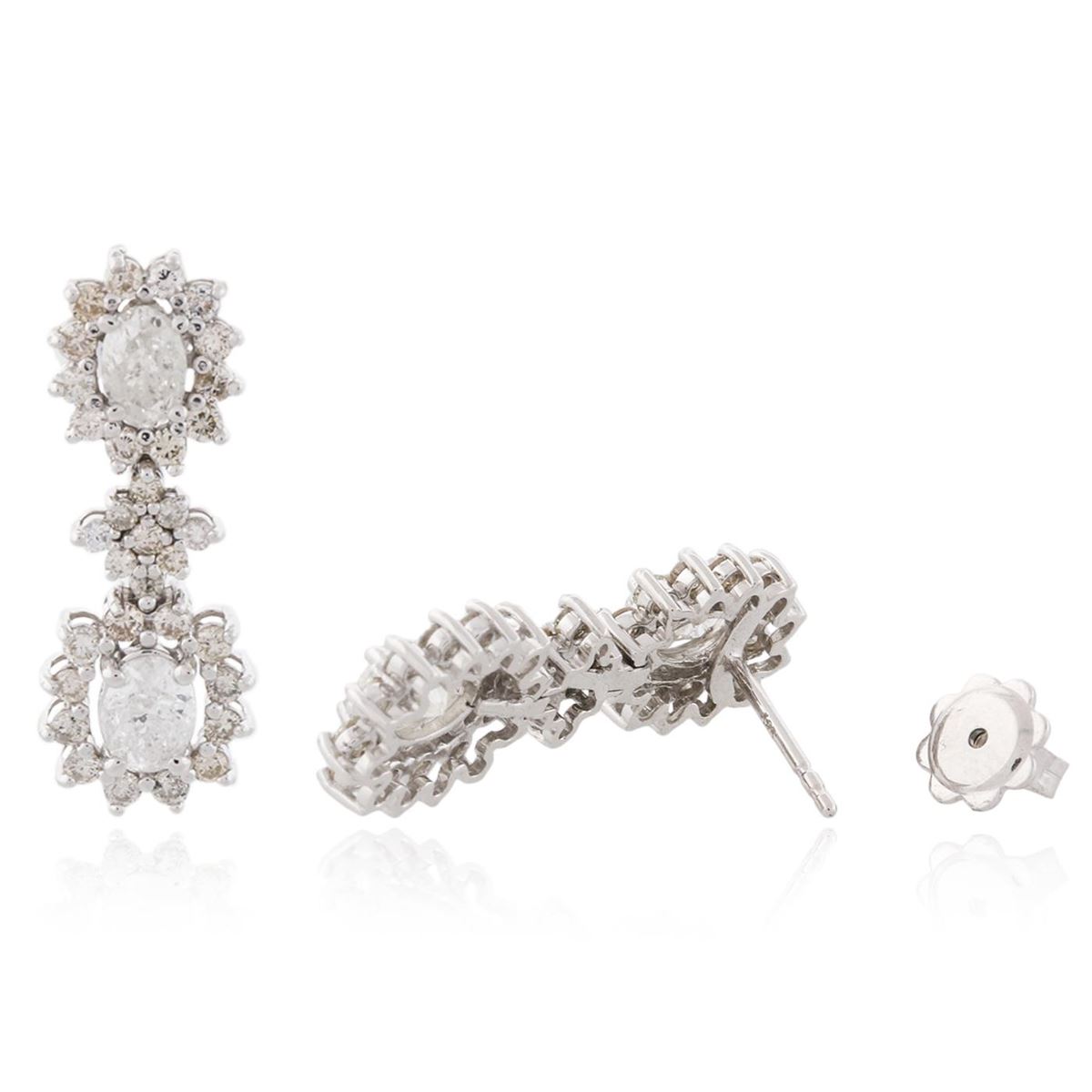 One pair electronically tested 14KT white gold ladies cast & assembled diamond dangle style earrings with standard backs. Condition is good. Bright polish finish. Containing: Four prong set oval shaped cut diamonds, measuring 6.40 x 4.60 x 3.30mm (depth est.) approximate. Total Weight of 4 Stones = 2.57ct. Measurements are an average for the group. Graded in the setting. Clarity: I-1 to I-2. Color: G - I Sixty-Six prong set round brilliant cut diamonds, measuring 2.00 - 1.70 x 1.11mm (depth est.) approximate. Total Weight of 66 Stones = 1.62ct. Graded in the setting. Clarity: SI-2 to I-1. Color: J - L. Total Weight of Diamonds 4.19ct. Total Weight of Earrings 8.20 grams. AIG Appraised at $17,675.00.