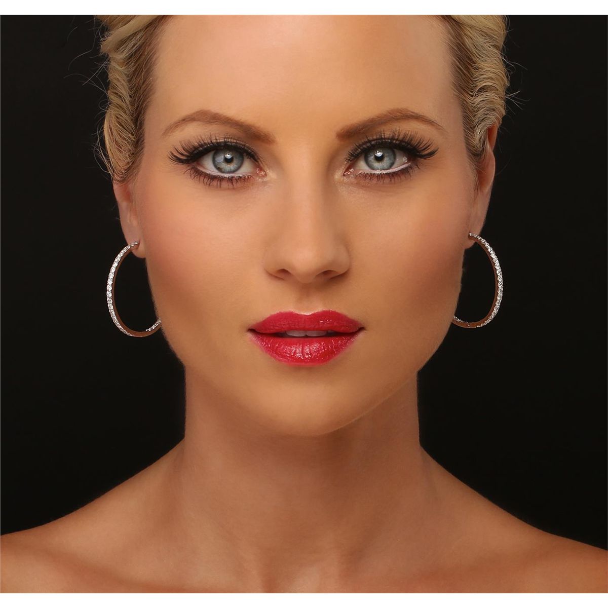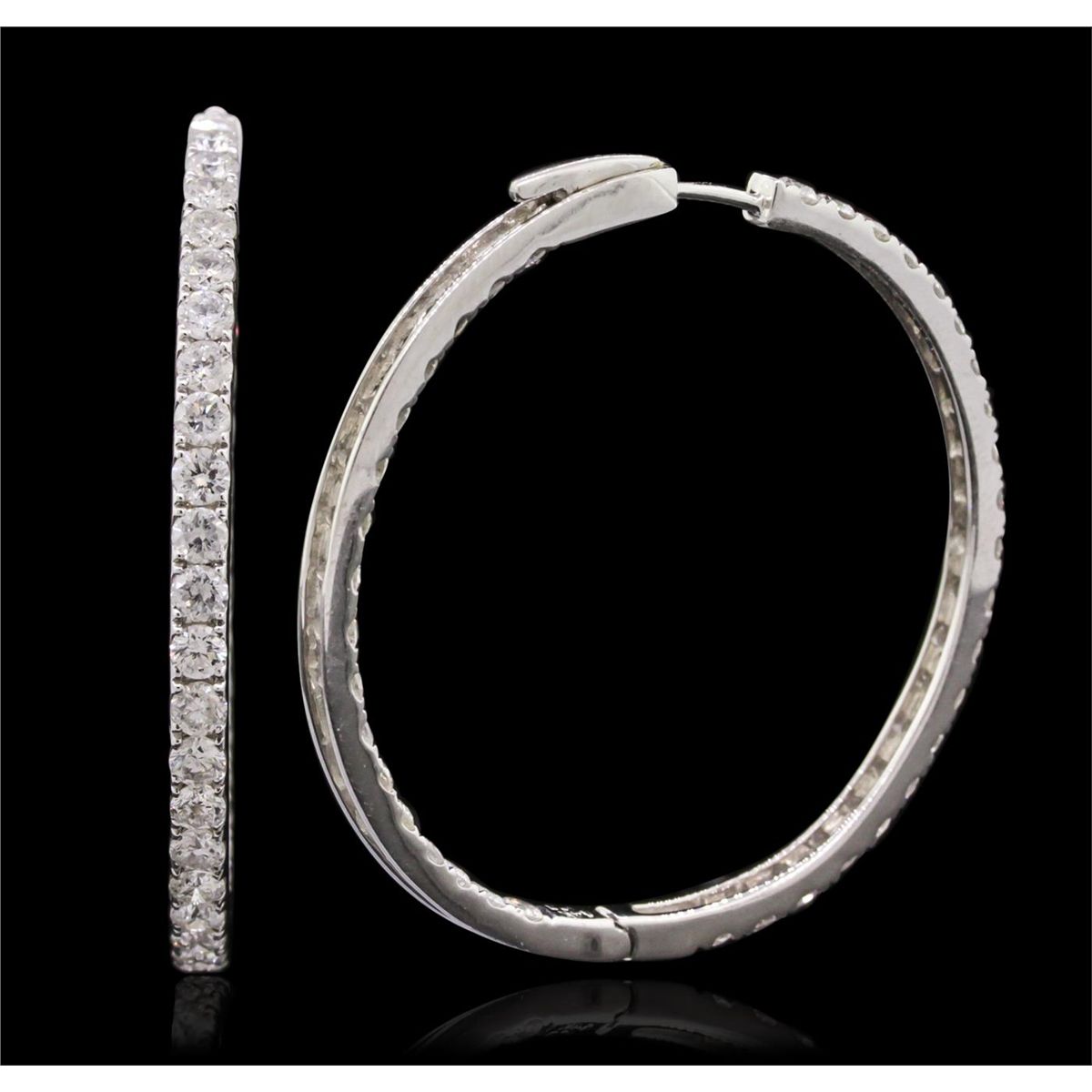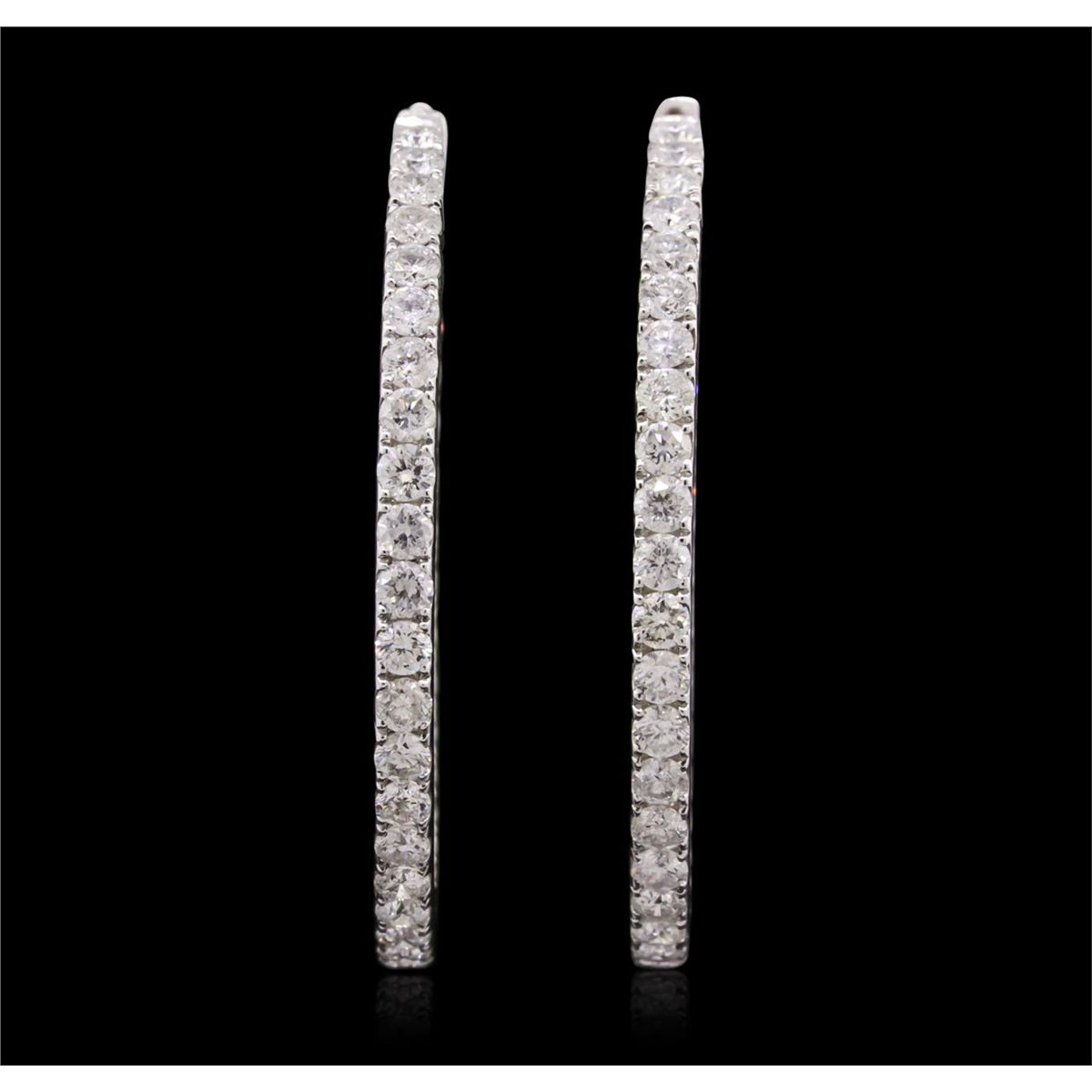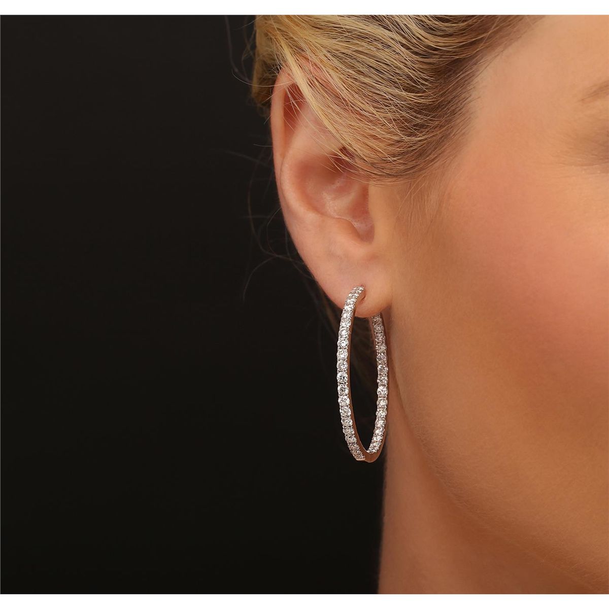 One pair electronically tested 14KT white gold ladies cast & assembled In and Out diamond hoop earrings with hinged, snap locking posts. Condition is new, good workmanship. Each earring is one and one-half inch in diameter. Bright polish finish. Trademark is CJ. Identified with markings of "14K". Containing: Seventy-Six prong set round brilliant cut diamonds, measuring 2.50 - 2.40 x 1.47mm (depth est.) approximate total weight of 76 Stones = 4.19ct. Graded in the setting. Clarity SI-1 to I-1. Color G - I. Total Weight of Diamonds 4.19 ct. Total Weight of Hoop Earrings 8.84 grams. AIG Appraised at $13,715.00.