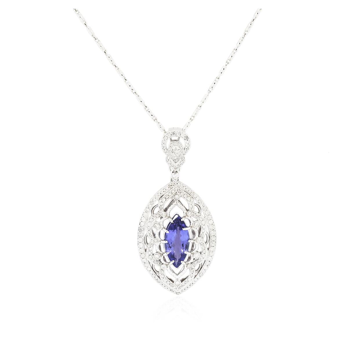 One electronically tested 14KT white gold Ladies combination cast & assembled pendant & chain 17.0" long, medium fancy link with a lobster claw clasp with a bright polish finish. Condition is new. Identified with markings of "14K". Containing: One prong set round marquise modified brilliant cut natural tanzanite, measuring 16.40 x 7.60 x 5.29mm, approximate weight of 4.20ct., clarity is eye clean, type I, medium, moderately strong, bluish violet color, (GIA bV 5/4), cut is good. Colored gemstones are presumed to have been subjected to commonly used color/clarity enhancement processes. One Hundred Eighty-One prong set round brilliant cut diamonds, measuring 1.70 - 1.30 x 0.90mm (depth est.) approximate. Total Weight of 181 Stones = 1.38ct. Clarity: I-1 to I-3. Color: I - J, Cut is Good. Total Weight of Colored Stones 4.20ct. Total Weight of Diamonds 1.38ct. Total Weight of Pendant & Chain 16.50 grams. GGL Appraised at $13,700.00.