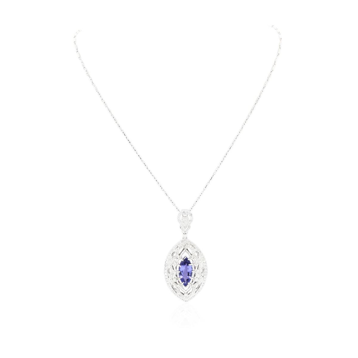 One electronically tested 14KT white gold Ladies combination cast & assembled pendant & chain 17.0" long, medium fancy link with a lobster claw clasp with a bright polish finish. Condition is new. Identified with markings of "14K". Containing: One prong set round marquise modified brilliant cut natural tanzanite, measuring 16.40 x 7.60 x 5.29mm, approximate weight of 4.20ct., clarity is eye clean, type I, medium, moderately strong, bluish violet color, (GIA bV 5/4), cut is good. Colored gemstones are presumed to have been subjected to commonly used color/clarity enhancement processes. One Hundred Eighty-One prong set round brilliant cut diamonds, measuring 1.70 - 1.30 x 0.90mm (depth est.) approximate. Total Weight of 181 Stones = 1.38ct. Clarity: I-1 to I-3. Color: I - J, Cut is Good. Total Weight of Colored Stones 4.20ct. Total Weight of Diamonds 1.38ct. Total Weight of Pendant & Chain 16.50 grams. GGL Appraised at $13,700.00.