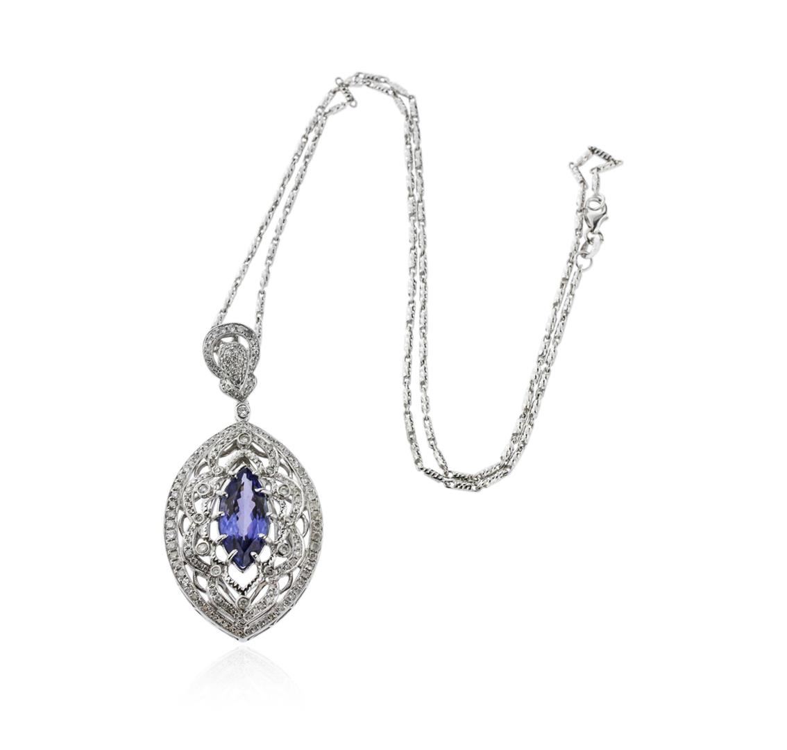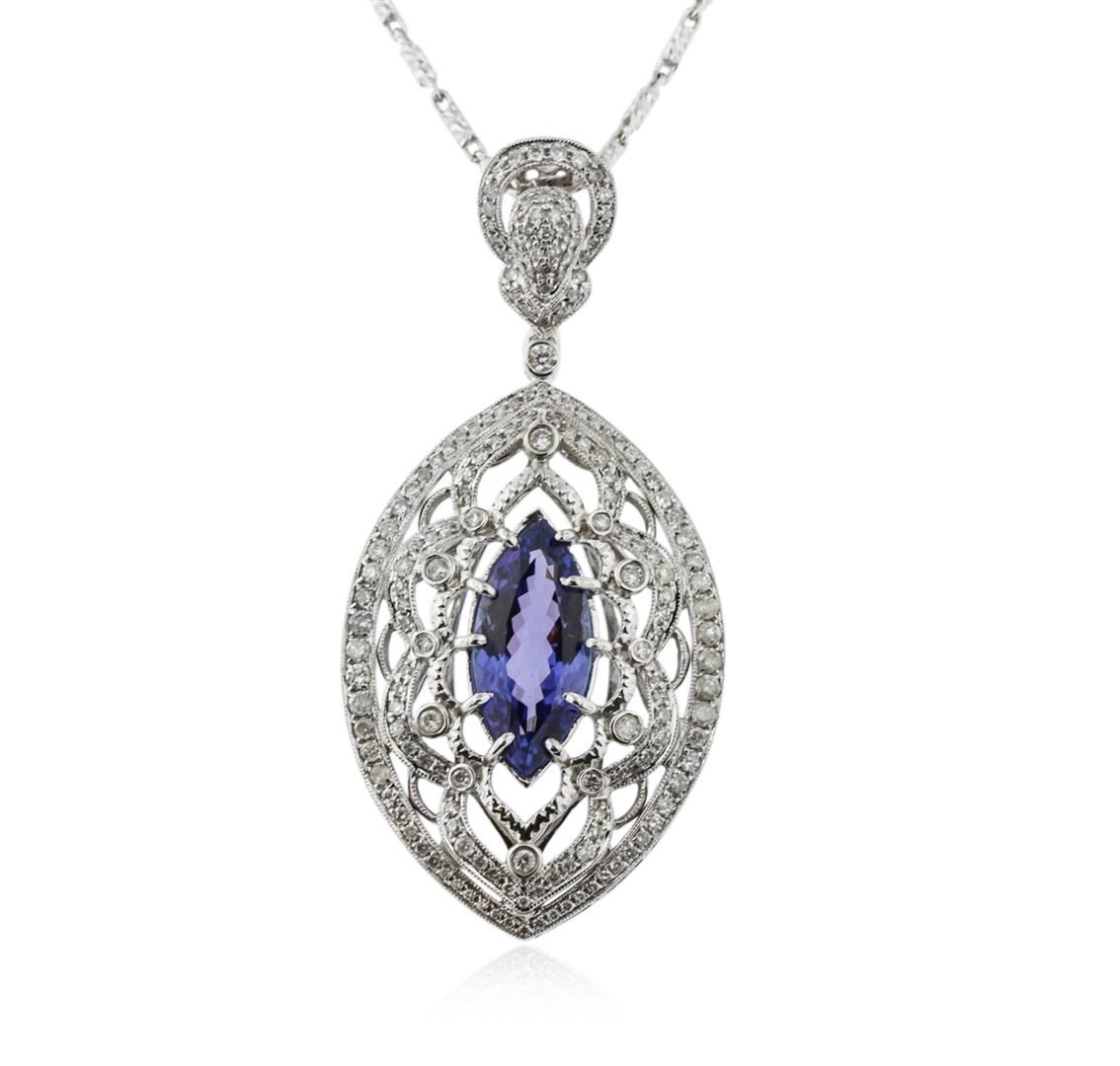 One electronically tested 14KT white gold Ladies combination cast & assembled pendant & chain 17.0" long, medium fancy link with a lobster claw clasp with a bright polish finish. Condition is new. Identified with markings of "14K". Containing: One prong set round marquise modified brilliant cut natural tanzanite, measuring 16.40 x 7.60 x 5.29mm, approximate weight of 4.20ct., clarity is eye clean, type I, medium, moderately strong, bluish violet color, (GIA bV 5/4), cut is good. Colored gemstones are presumed to have been subjected to commonly used color/clarity enhancement processes. One Hundred Eighty-One prong set round brilliant cut diamonds, measuring 1.70 - 1.30 x 0.90mm (depth est.) approximate. Total Weight of 181 Stones = 1.38ct. Clarity: I-1 to I-3. Color: I - J, Cut is Good. Total Weight of Colored Stones 4.20ct. Total Weight of Diamonds 1.38ct. Total Weight of Pendant & Chain 16.50 grams. GGL Appraised at $13,700.00.