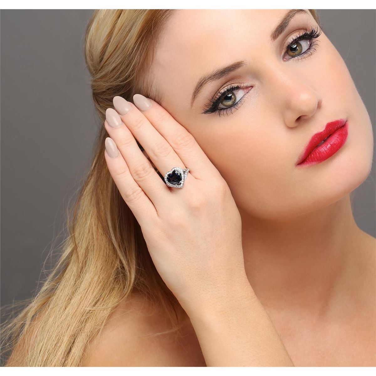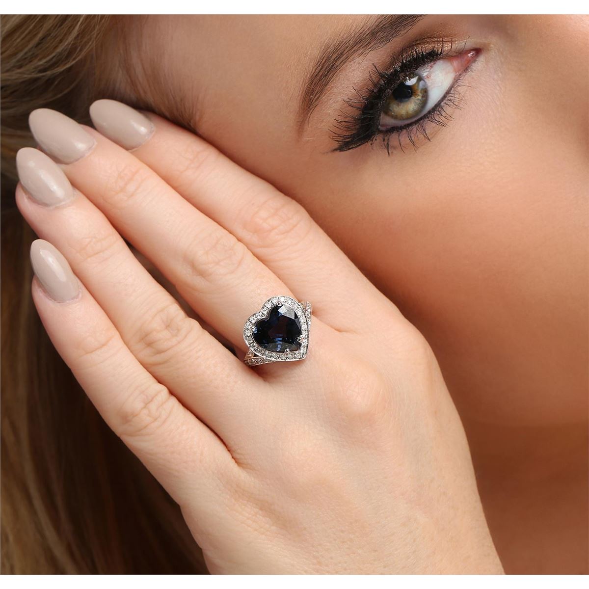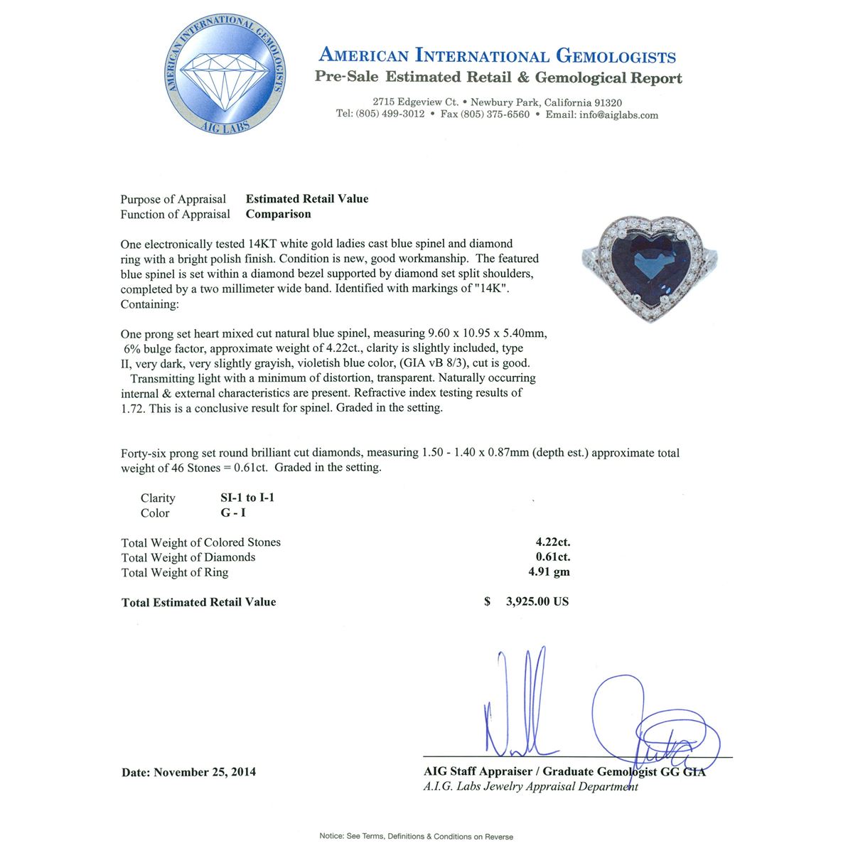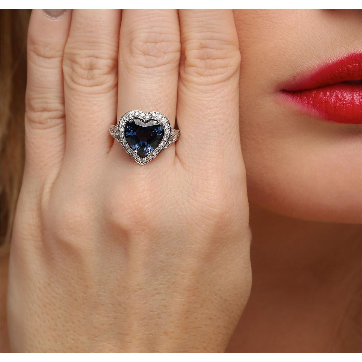One electronically tested 14KT white gold ladies cast blue spinel and diamond ring with a bright polish finish. The featured blue spinel is set within a diamond bezel supported by diamond set split shoulders, completed by a two millimeter wide band. Identified with markings of "14K". Condition is new, good workmanship. Containing: One prong set heart mixed cut natural blue spinel, measuring 9.60 x 10.95 x 5.40mm, 6%. bulge factor, approximate weight of 4.22ct., clarity is slightly included, type II, very dark, very slightly grayish, violetish blue color, (GIA vB 8/3), cut is good. Transmitting light with a minimum of distortion, transparent. Naturally occurring internal & external characteristics are present. Refractive index testing results of1.72. This is a conclusive result for spinel. Graded in the setting. Forty-Six prong set round brilliant cut diamonds, measuring 1.50 - 1.40 x 0.87mm (depth est.) approximate total weight of 46 Stones = 0.61ct. Graded in the setting. Clarity: SI-1 to I-1. Color: G - I. Total Weight of Colored Stones 4.22ct. Total Weight of Diamonds 0.61ct. Total Weight of Ring 4.91 grams. AIG Appraised at $3,925.00.