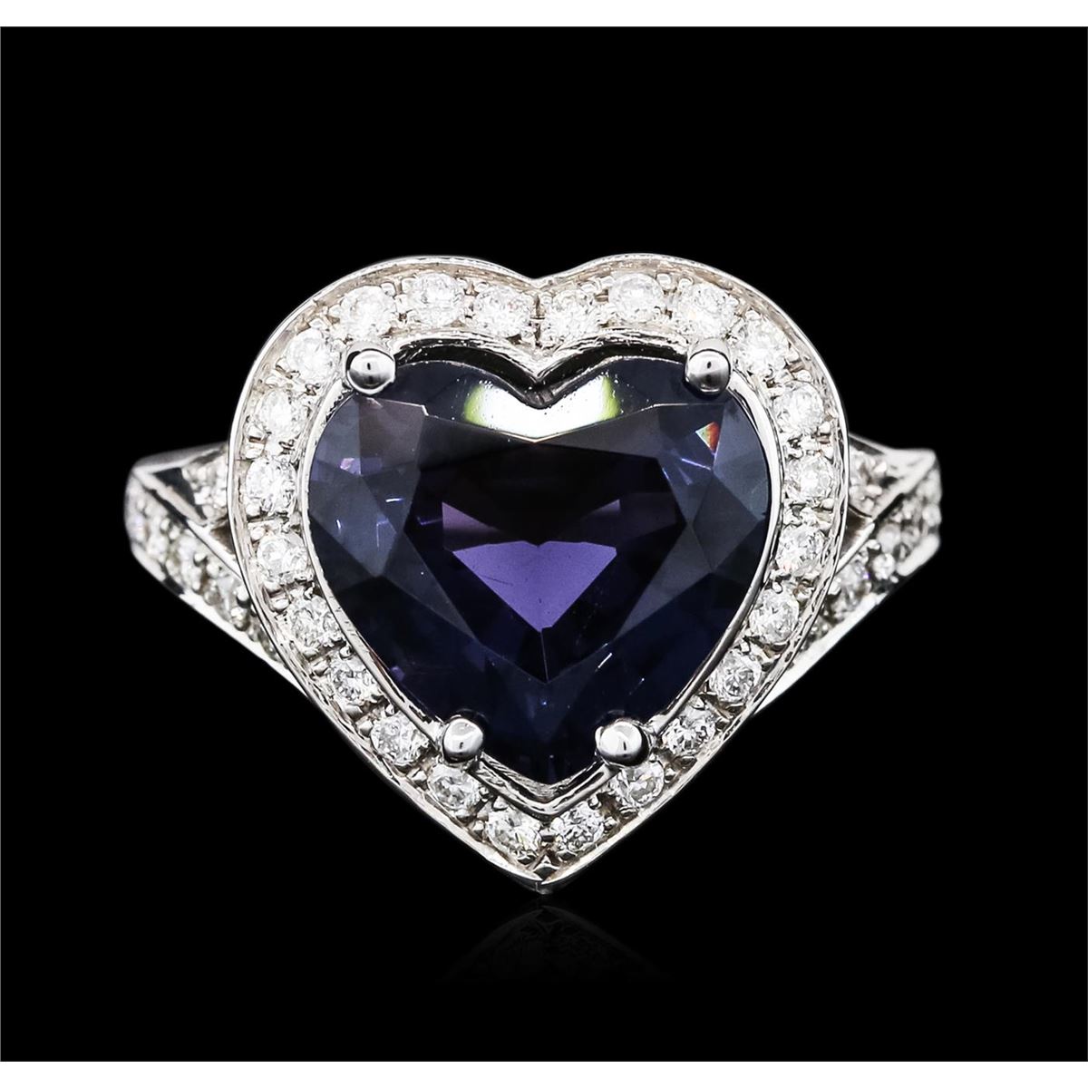 One electronically tested 14KT white gold ladies cast blue spinel and diamond ring with a bright polish finish. The featured blue spinel is set within a diamond bezel supported by diamond set split shoulders, completed by a two millimeter wide band. Identified with markings of "14K". Condition is new, good workmanship. Containing: One prong set heart mixed cut natural blue spinel, measuring 9.60 x 10.95 x 5.40mm, 6%. bulge factor, approximate weight of 4.22ct., clarity is slightly included, type II, very dark, very slightly grayish, violetish blue color, (GIA vB 8/3), cut is good. Transmitting light with a minimum of distortion, transparent. Naturally occurring internal & external characteristics are present. Refractive index testing results of1.72. This is a conclusive result for spinel. Graded in the setting. Forty-Six prong set round brilliant cut diamonds, measuring 1.50 - 1.40 x 0.87mm (depth est.) approximate total weight of 46 Stones = 0.61ct. Graded in the setting. Clarity: SI-1 to I-1. Color: G - I. Total Weight of Colored Stones 4.22ct. Total Weight of Diamonds 0.61ct. Total Weight of Ring 4.91 grams. AIG Appraised at $3,925.00.