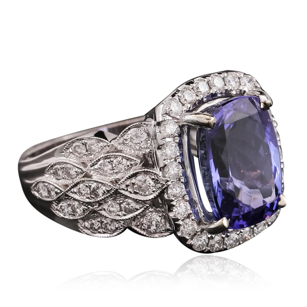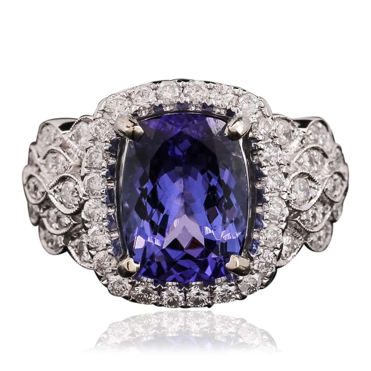 One electronically tested 14KT white gold ladies combination cast & assembled tanzanite and diamond ring with a flat shank with a bright polish finish. Identified with markings of "14K". Condition is new. Containing: One prong set rectangular cushion modified brilliant cut natural tanzanite, measuring 11.07 x 8.32 x 5.84mm, approximate weight of 4.23ct., clarity is eye clean, type I, medium, moderately strong, violet color, (GIA V 5/4), cut is good. Sixty-One prong set round brilliant cut diamonds, measuring 1.50 - 1.50 x 0.90mm (depth est.) approximate total weight of 61 Stones = 0.75ct. Clarity: SI-1 to I-1. Color: I - J, Cut is Good. Colored gemstones are presumed to have been subjected to commonly used enhancement processes. All diamonds and colored gemstones are graded in the mounting, unless otherwise stated. Total Weight of Colored Stones 4.23ct. Total Weight of Diamonds 0.75ct. Total Weight of Ring 7.80 grams. GGL Appraised at $10,200.00.