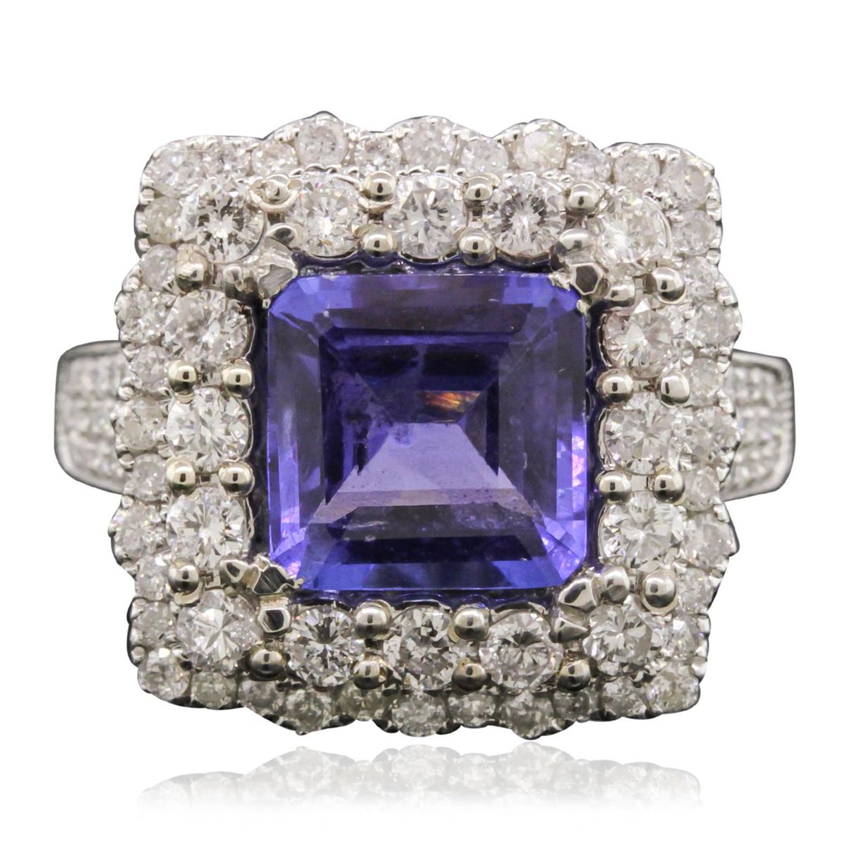 One electronically tested 14KT white gold Ladies combination cast & assembled ring with a bright polish finish. Condition is new. Identified with markings of "14K". Containing: One prong set emerald standard step cut natural tanzanite, measuring 8.68 x 8.60 x 6.27mm, approximate. Total Weight of 4.23ct., clarity is eye clean, type I, medium light, moderately strong, bluish violet color, (GIA bV 4/4), cut is good. Fifty-Six prong set round brilliant cut diamonds, measuring 1.00 - 1.00 x 0.60mm (depth est.) approximate. Total Weight of 56 Stones = 0.20ct. Clarity: I-1 to I-2. Color: I - J, Cut is Good. Colored gemstones are presumed to have been subjected to commonly used enhancement processes. All diamonds and colored gemstones are graded in the mounting, unless otherwise stated. Thirty-Two prong set round brilliant cut diamonds, measuring 2.00 - 1.50 x 1.05mm (depth est.) approximate. Total Weight of 32 Stones = 0.63ct. Clarity: I-1 to I-2. Color: I - J, Cut is Good. Total Weight of Colored Stones 4.23ct. Total Weight of Diamonds 0.83ct. Total Weight of Ring 6.30 grams. GGL Appraised at $9,285.00.