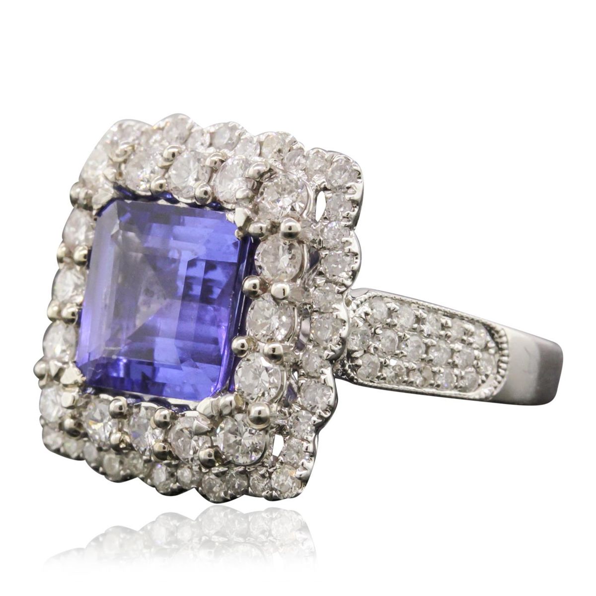 One electronically tested 14KT white gold Ladies combination cast & assembled ring with a bright polish finish. Condition is new. Identified with markings of "14K". Containing: One prong set emerald standard step cut natural tanzanite, measuring 8.68 x 8.60 x 6.27mm, approximate. Total Weight of 4.23ct., clarity is eye clean, type I, medium light, moderately strong, bluish violet color, (GIA bV 4/4), cut is good. Fifty-Six prong set round brilliant cut diamonds, measuring 1.00 - 1.00 x 0.60mm (depth est.) approximate. Total Weight of 56 Stones = 0.20ct. Clarity: I-1 to I-2. Color: I - J, Cut is Good. Colored gemstones are presumed to have been subjected to commonly used enhancement processes. All diamonds and colored gemstones are graded in the mounting, unless otherwise stated. Thirty-Two prong set round brilliant cut diamonds, measuring 2.00 - 1.50 x 1.05mm (depth est.) approximate. Total Weight of 32 Stones = 0.63ct. Clarity: I-1 to I-2. Color: I - J, Cut is Good. Total Weight of Colored Stones 4.23ct. Total Weight of Diamonds 0.83ct. Total Weight of Ring 6.30 grams. GGL Appraised at $9,285.00.