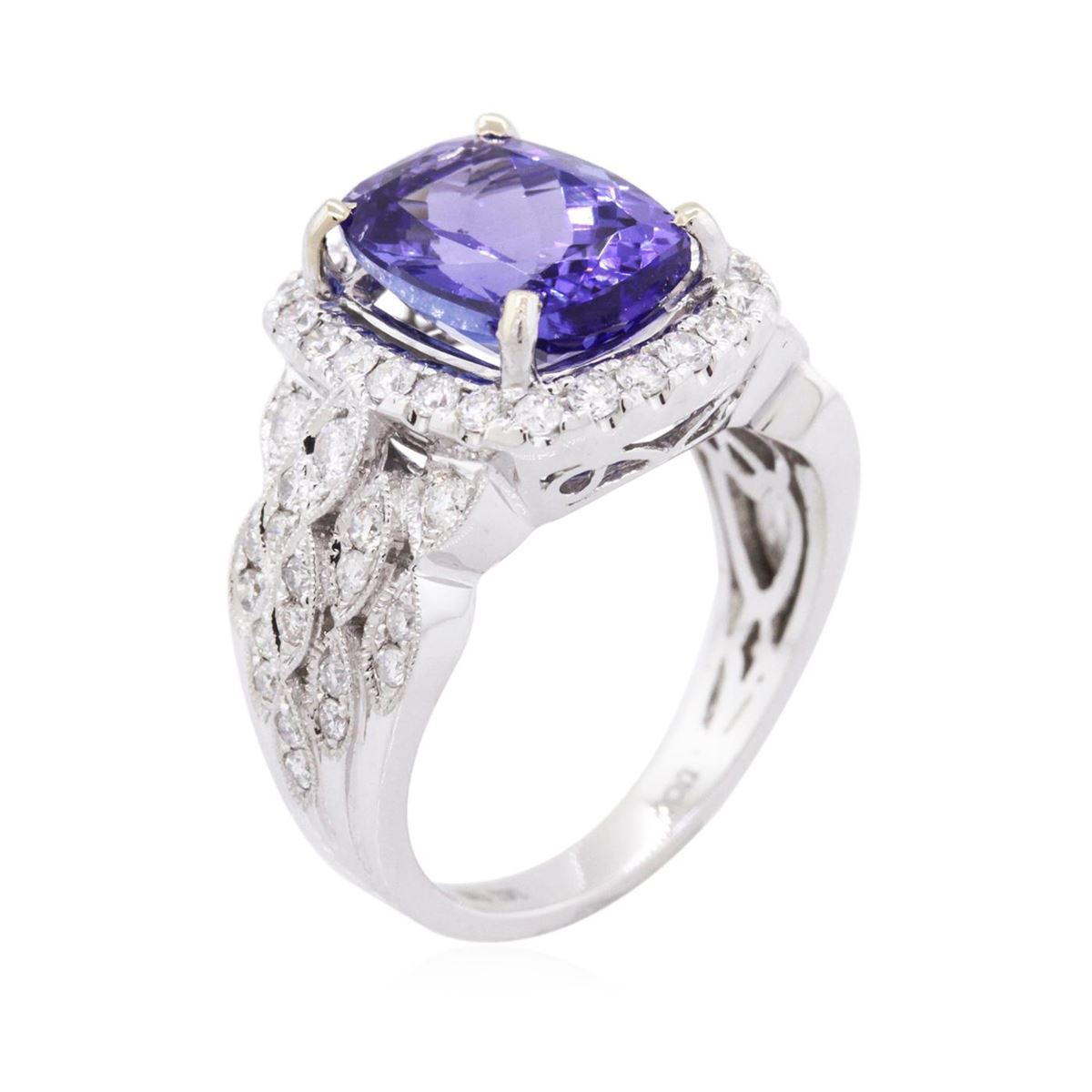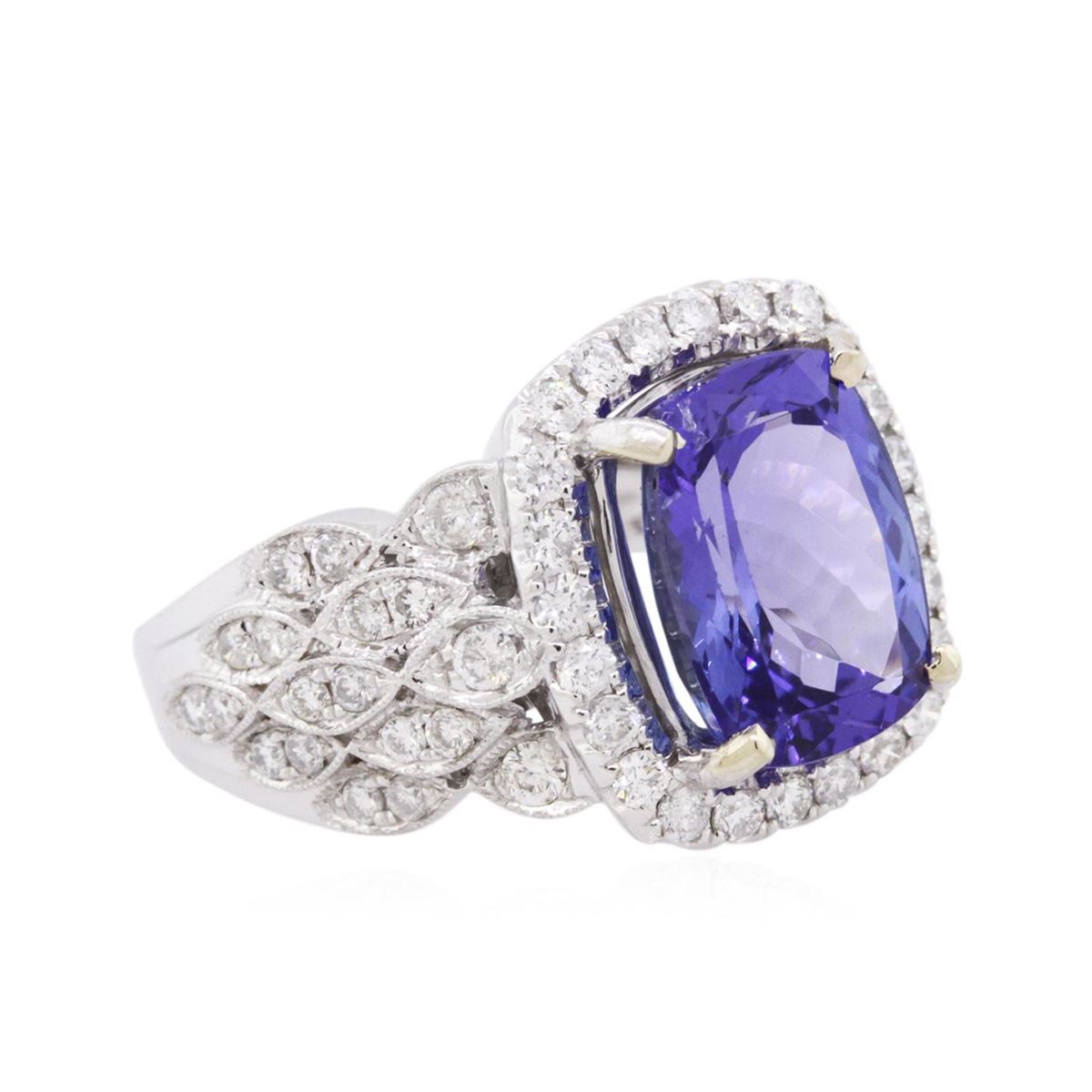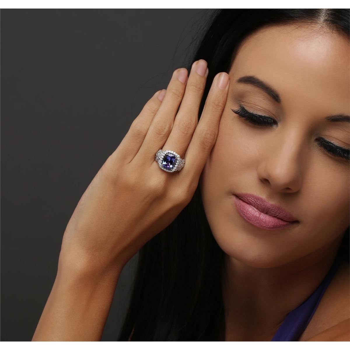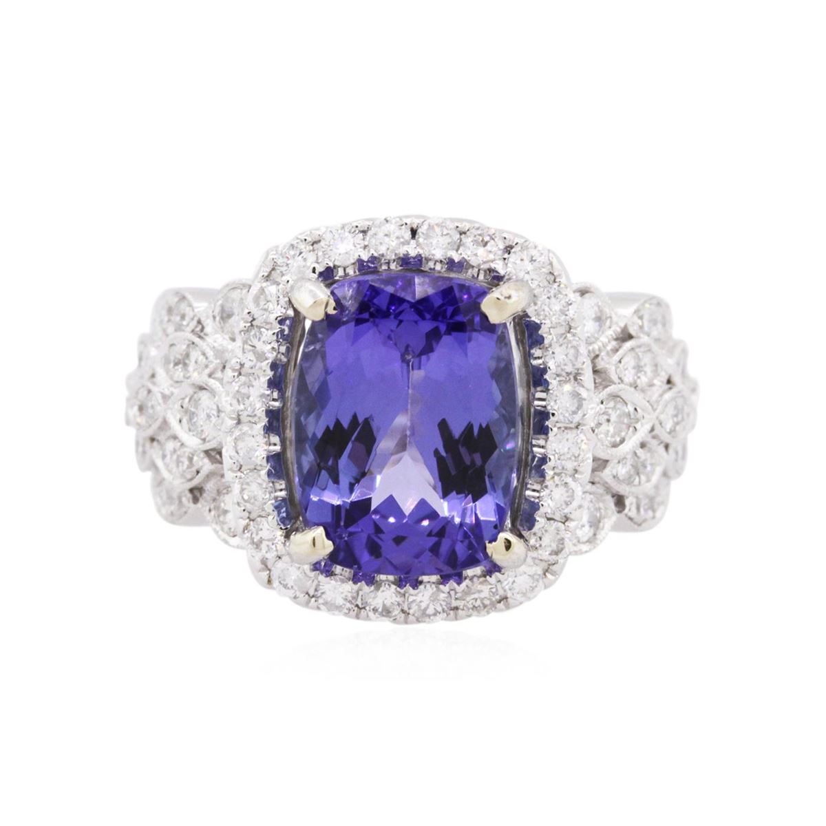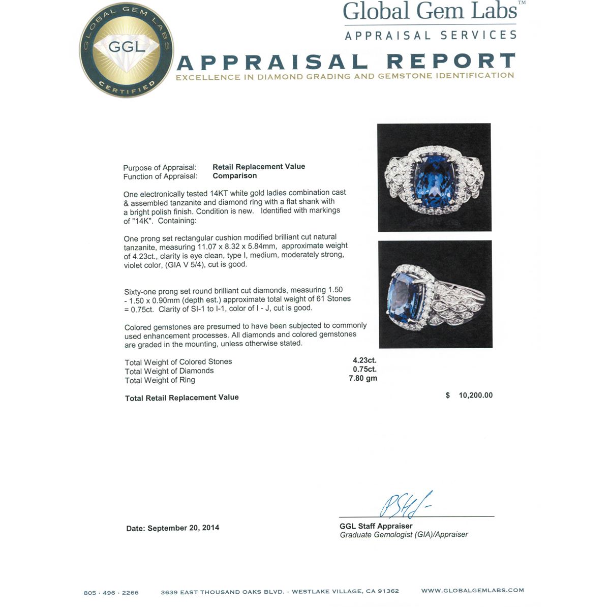 One electronically tested 14KT white gold ladies combination cast & assembled tanzanite and diamond ring with a flat shank with a bright polish finish. Identified with markings of "14K". Condition is new. Containing: One prong set rectangular cushion modified brilliant cut natural tanzanite, measuring 11.07 x 8.32 x 5.84mm, approximate weight of 4.23ct., clarity is eye clean, type I, medium, moderately strong, violet color, (GIA V 5/4), cut is good. Sixty-One prong set round brilliant cut diamonds, measuring 1.50 - 1.50 x 0.90mm (depth est.) approximate total weight of 61 Stones = 0.75ct. Clarity: SI-1 to I-1. Color: I - J, Cut is Good. Colored gemstones are presumed to have been subjected to commonly used enhancement processes. All diamonds and colored gemstones are graded in the mounting, unless otherwise stated. Total Weight of Colored Stones 4.23ct. Total Weight of Diamonds 0.75ct. Total Weight of Ring 7.80 grams. GGL Appraised at $10,200.00.