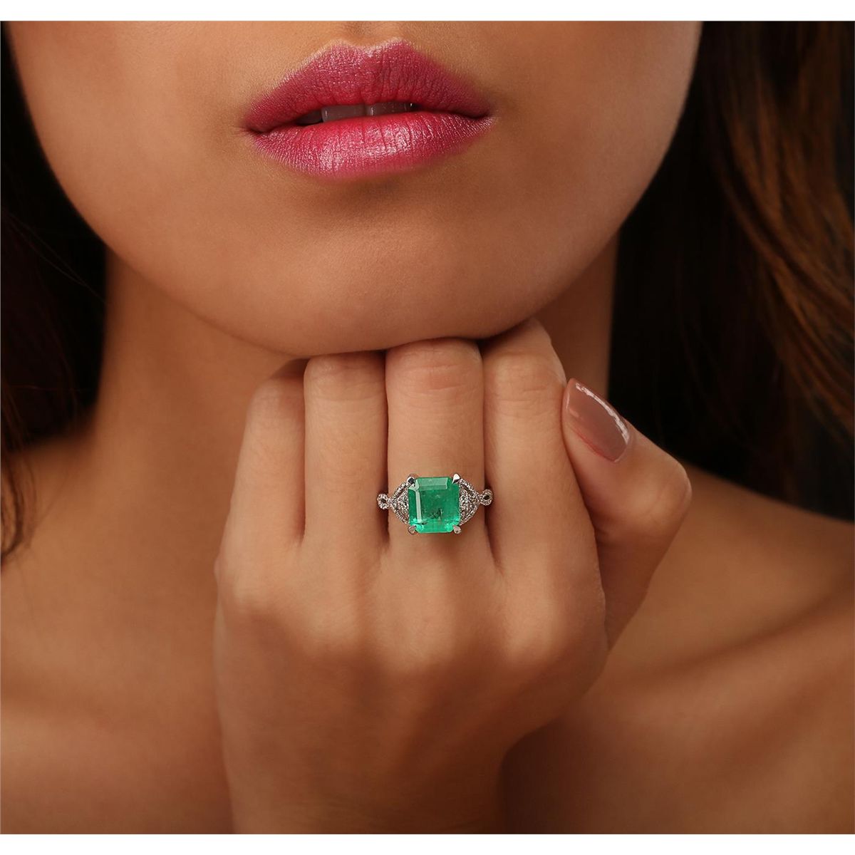 One electronically tested 14KT white gold ladies cast emerald and diamond ring with a bright polish finish. The featured emerald is supported by diamond set floral design shoulders, completed by a one and one-half millimeter wide band. Trademark is PMI. Identified with markings of "14K". Condition is new, good workmanship. Containing: One prong set rectangular step cut natural emerald, measuring 9.75 x 8.90 x 5.55mm, 8%. bulge factor, approximate weight of 4.24ct., clarity is heavily included, type III, medium dark, very slightly grayish, green color, (GIA G 6/3), cut is good. Transmitting light with a minimum of distortion, transparent. Naturally occurring internal & external characteristics are present. Indications of oil residue. Graded in the setting. Two prong set round brilliant cut diamonds, measuring 2.10 - 2.00 x 1.23mm (depth est.) approximate total weight of 2 Stones = 0.10ct. The clarity & color grade reflect the overall average for the pair. Graded in the setting. Clarity: SI-1. Color: H Sixty-Four prong set round brilliant cut diamonds, measuring 1.10 - 1.00 x 0.63mm (depth est.) approximate total weight of 64 Stones = 0.27ct. Graded in the setting. Clarity: SI-2 to I-2. Color: G - I. Total Weight of Colored Stones 4.24ct. Total Weight of Diamonds 0.37ct. Total Weight of Ring 3.94 grams. AIG Appraised at $8,190.00.