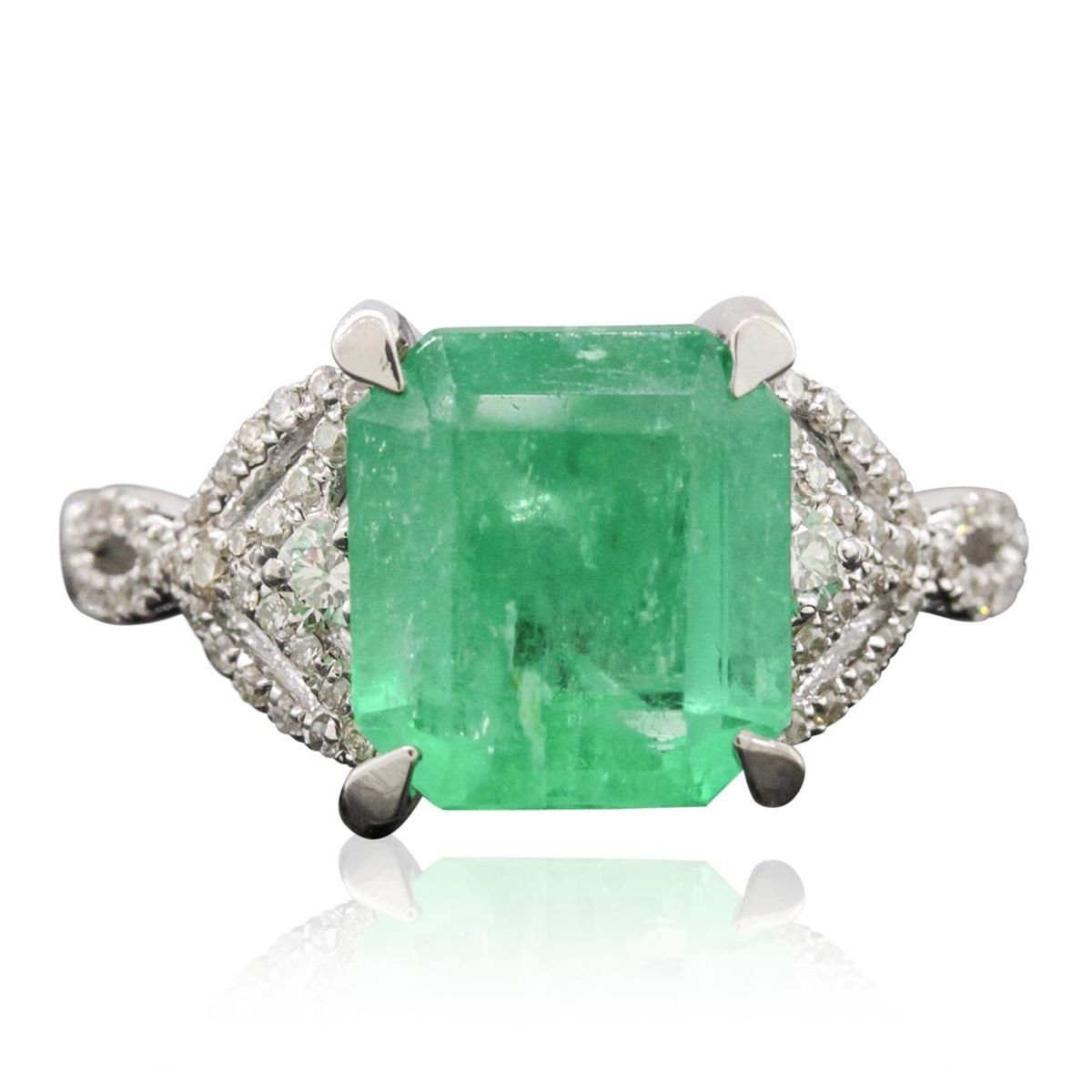 One electronically tested 14KT white gold ladies cast emerald and diamond ring with a bright polish finish. The featured emerald is supported by diamond set floral design shoulders, completed by a one and one-half millimeter wide band. Trademark is PMI. Identified with markings of "14K". Condition is new, good workmanship. Containing: One prong set rectangular step cut natural emerald, measuring 9.75 x 8.90 x 5.55mm, 8%. bulge factor, approximate weight of 4.24ct., clarity is heavily included, type III, medium dark, very slightly grayish, green color, (GIA G 6/3), cut is good. Transmitting light with a minimum of distortion, transparent. Naturally occurring internal & external characteristics are present. Indications of oil residue. Graded in the setting. Two prong set round brilliant cut diamonds, measuring 2.10 - 2.00 x 1.23mm (depth est.) approximate total weight of 2 Stones = 0.10ct. The clarity & color grade reflect the overall average for the pair. Graded in the setting. Clarity: SI-1. Color: H Sixty-Four prong set round brilliant cut diamonds, measuring 1.10 - 1.00 x 0.63mm (depth est.) approximate total weight of 64 Stones = 0.27ct. Graded in the setting. Clarity: SI-2 to I-2. Color: G - I. Total Weight of Colored Stones 4.24ct. Total Weight of Diamonds 0.37ct. Total Weight of Ring 3.94 grams. AIG Appraised at $8,190.00.