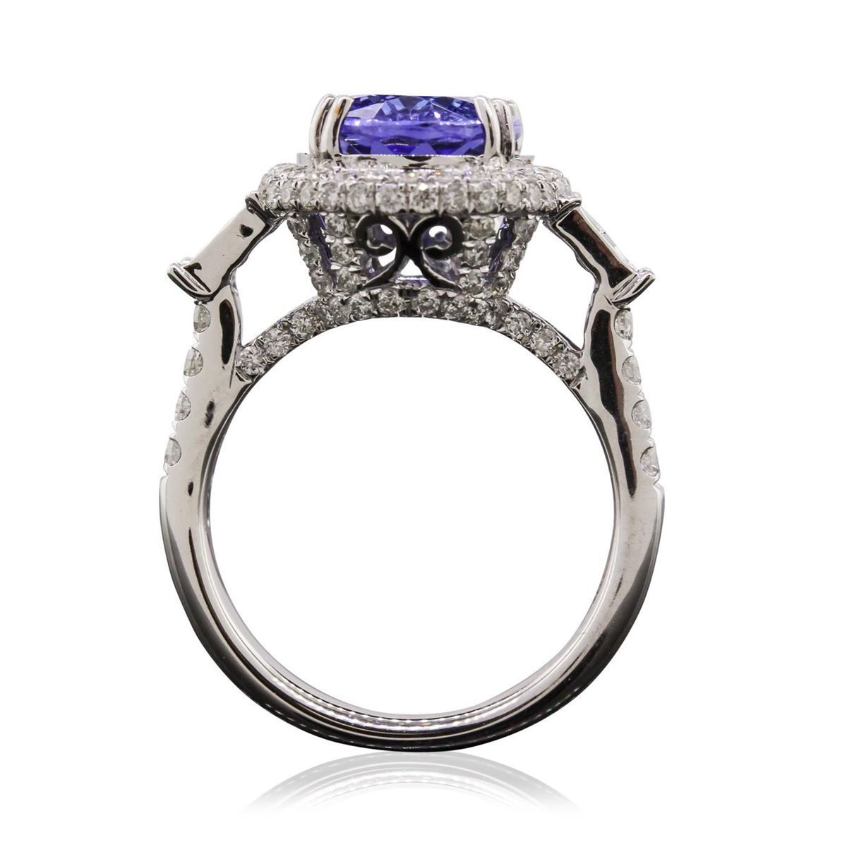One electronically tested 14KT white gold Ladies combination cast & assembled ring with a bright polish finish. Condition is new. Identified with markings of "14K". Containing: One prong set oval modified brilliant cut natural tanzanite, measuring 11.80 x 9.00. x 5.85mm, approximate weight of 4.24ct., clarity is eye clean, type I, medium, moderately strong, bluish violet color, (GIA bV 5/4), cut is good. Colored gemstones are presumed to have been subjected to commonly used color/clarity enhancement processes. One Hundred Twenty-Six prong set round brilliant cut diamonds, measuring 1.60 - 1.30 x 0.87mm (depth est.) approximate. Total Weight of 126 Stones = 1.00ct. . Clarity: I-1 to I-2. Color: H, Cut is Good. Twelve channel set baguette cut diamonds, measuring 1.50 x 1.30 x 1.11mm (depth est.) approximate. Total Weight of 12 Stones = 0.24ct. . Clarity: I-1 to I-2. Color: I - J, Cut is Good. . Total Weight of Colored Stones 4.24ct. Total Weight of Diamonds 1.24ct. Total Weight of Ring 7.60 grams. GGL Appraised at $10,870.00.
