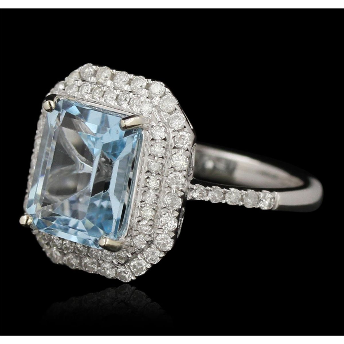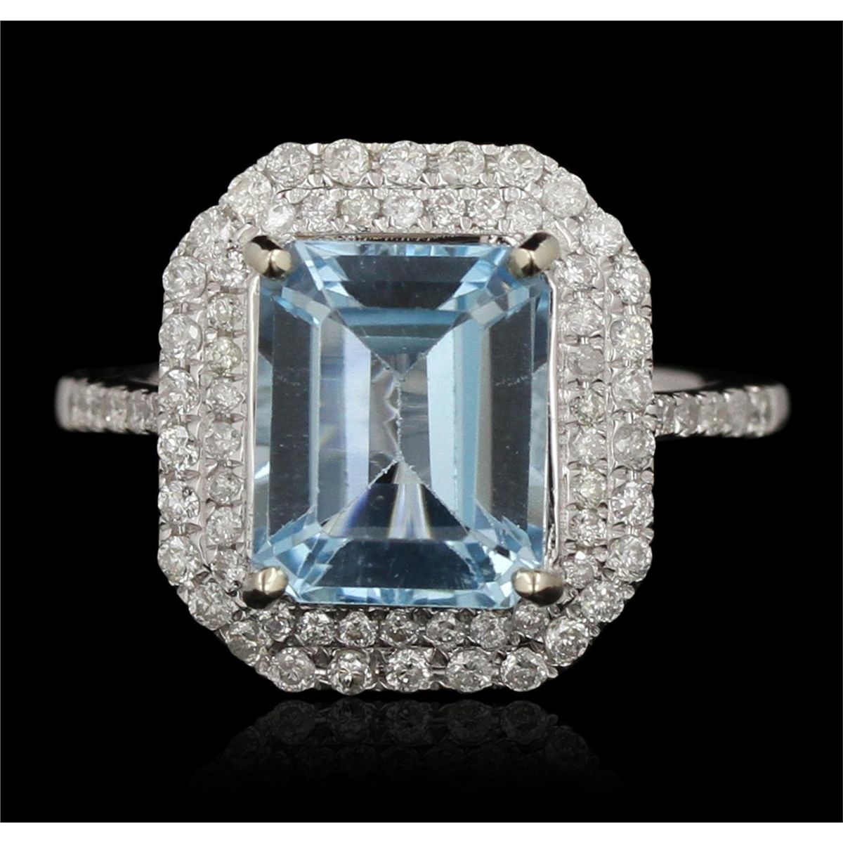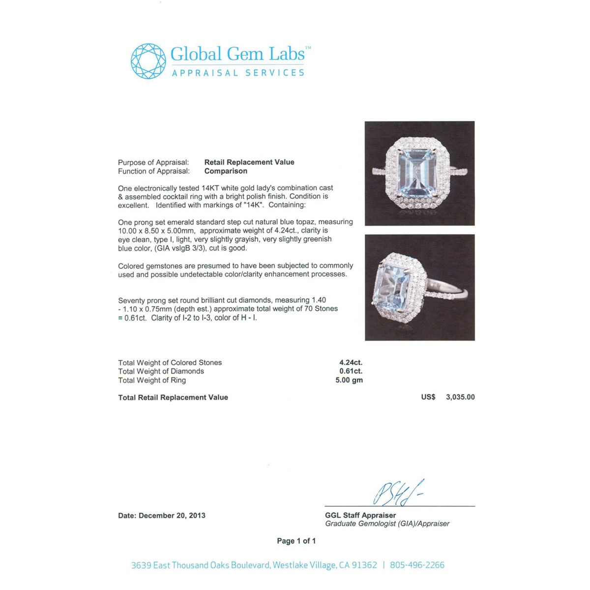 One electronically tested 14KT white gold Ladies combination cast & assembled cocktail ring with a bright polish finish. Identified with markings of "14K". Condition is excellent. Containing: One prong set emerald standard step cut natural blue topaz, measuring 10.00 x 8.50 x 5.00mm, approximate weight of 4.24ct., clarity is eye clean, type I, light, very slightly grayish, very slightly greenish blue color, (GIA vslgB 3/3), cut is good. Colored gemstones are presumed to have been subjected to commonly used and possible undetectable color/clarity enhancement processes. Seventy prong set round brilliant cut diamonds, measuring 1.40 - 1.10 x 0.75mm (depth est.) approximate total weight of 70 Stones = 0.61ct. Clarity of I-2 to I-3, Color of H - I. Total Weight of Colored Stones 4.24ct. Total Weight of Diamonds 0.61ct. Total Weight of Ring 5.00gm . GGL Appraised at $3,035.00.
