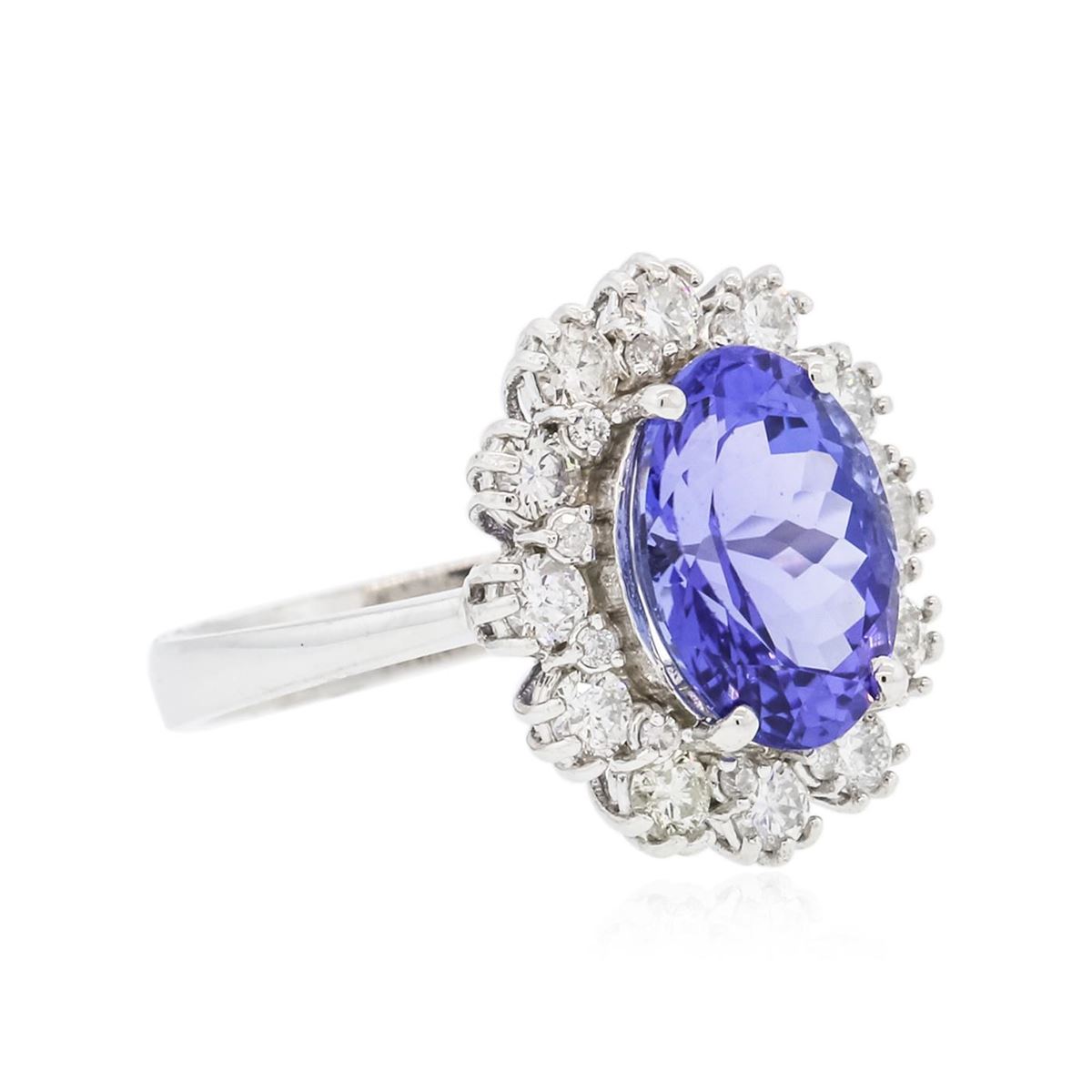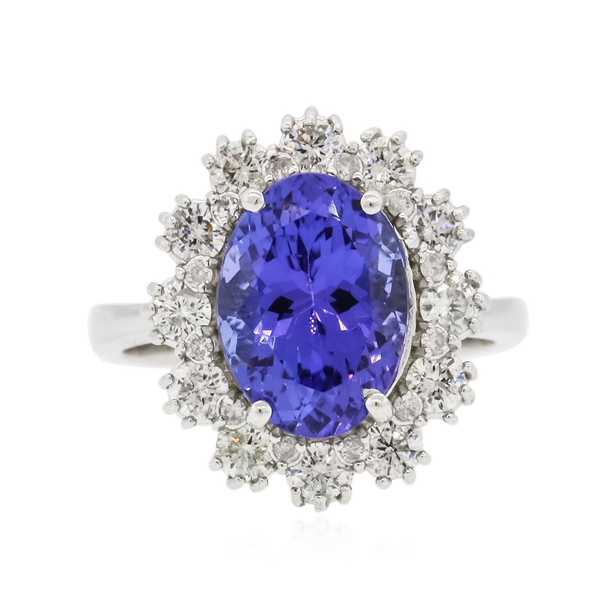 One electronically tested 14KT white gold ladies combination cast & assembled ring with a bright polish finish. Condition is new. Identified with markings of "K14". Containing: One prong set oval modified brilliant cut natural tanzanite, measuring 11.62 x 8.55 x 6.23mm, approximate weight of 4.25ct., clarity is eye clean, type I, medium, moderately strong, bluish violet color, (GIA bV 5/4), cut is good. Twelve prong set round brilliant cut diamonds, measuring 2.50 - 2.50 x 1.50mm (depth est.) approximate. Total Weight of 12 Stones = 0.69ct. Clarity: SI-1 to SI-2. Color: K - L, Cut is Good. Twelve prong set round brilliant cut diamonds, measuring 1.30 - 1.30 x 0.78mm (depth est.) approximate. Total Weight of 12 Stones = 0.10ct. Clarity: I-2. Color: H - I, Cut is Good. Colored gemstones are presumed to have been subjected to commonly used enhancement processes. All diamonds and colored gemstones are graded in the mounting, unless otherwise stated. Total Weight of Colored Stones 4.25ct. Total Weight of Diamonds 0.78ct. Total Weight of Ring 6.00 grams. GGL Appraised at $9,750.00.