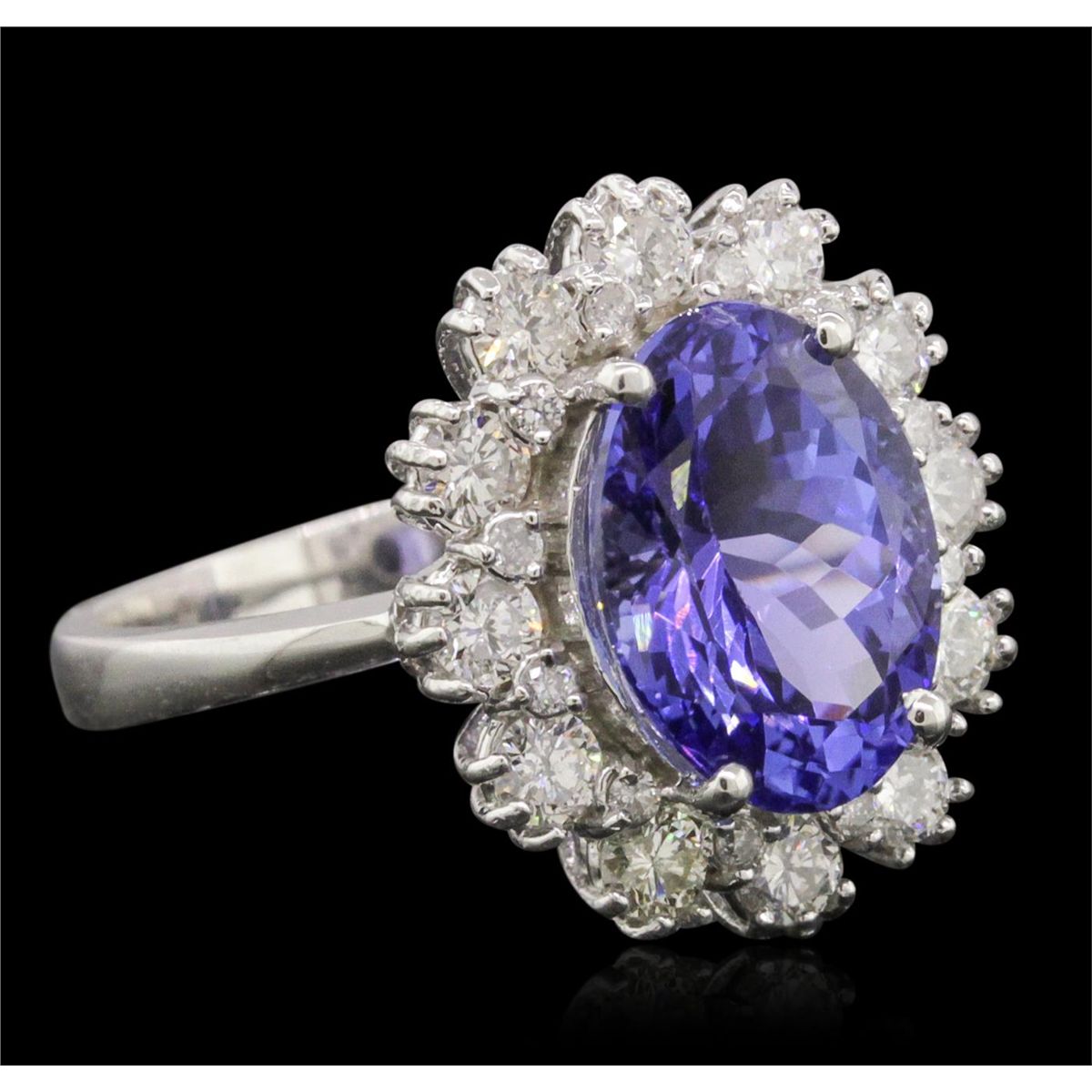 One electronically tested 14KT white gold ladies combination cast & assembled ring with a bright polish finish. Condition is new. Identified with markings of "K14". Containing: One prong set oval modified brilliant cut natural tanzanite, measuring 11.62 x 8.55 x 6.23mm, approximate weight of 4.25ct., clarity is eye clean, type I, medium, moderately strong, bluish violet color, (GIA bV 5/4), cut is good. Twelve prong set round brilliant cut diamonds, measuring 2.50 - 2.50 x 1.50mm (depth est.) approximate. Total Weight of 12 Stones = 0.69ct. Clarity: SI-1 to SI-2. Color: K - L, Cut is Good. Twelve prong set round brilliant cut diamonds, measuring 1.30 - 1.30 x 0.78mm (depth est.) approximate. Total Weight of 12 Stones = 0.10ct. Clarity: I-2. Color: H - I, Cut is Good. Colored gemstones are presumed to have been subjected to commonly used enhancement processes. All diamonds and colored gemstones are graded in the mounting, unless otherwise stated. Total Weight of Colored Stones 4.25ct. Total Weight of Diamonds 0.78ct. Total Weight of Ring 6.00 grams. GGL Appraised at $9,750.00.