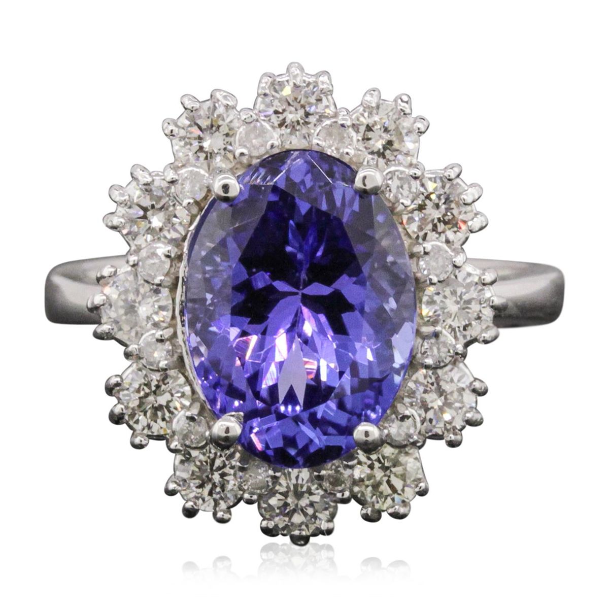 One electronically tested 14KT white gold ladies combination cast & assembled ring with a bright polish finish. Condition is new. Identified with markings of "K14". Containing: One prong set oval modified brilliant cut natural tanzanite, measuring 11.62 x 8.55 x 6.23mm, approximate weight of 4.25ct., clarity is eye clean, type I, medium, moderately strong, bluish violet color, (GIA bV 5/4), cut is good. Twelve prong set round brilliant cut diamonds, measuring 2.50 - 2.50 x 1.50mm (depth est.) approximate. Total Weight of 12 Stones = 0.69ct. Clarity: SI-1 to SI-2. Color: K - L, Cut is Good. Twelve prong set round brilliant cut diamonds, measuring 1.30 - 1.30 x 0.78mm (depth est.) approximate. Total Weight of 12 Stones = 0.10ct. Clarity: I-2. Color: H - I, Cut is Good. Colored gemstones are presumed to have been subjected to commonly used enhancement processes. All diamonds and colored gemstones are graded in the mounting, unless otherwise stated. Total Weight of Colored Stones 4.25ct. Total Weight of Diamonds 0.78ct. Total Weight of Ring 6.00 grams. GGL Appraised at $9,750.00.