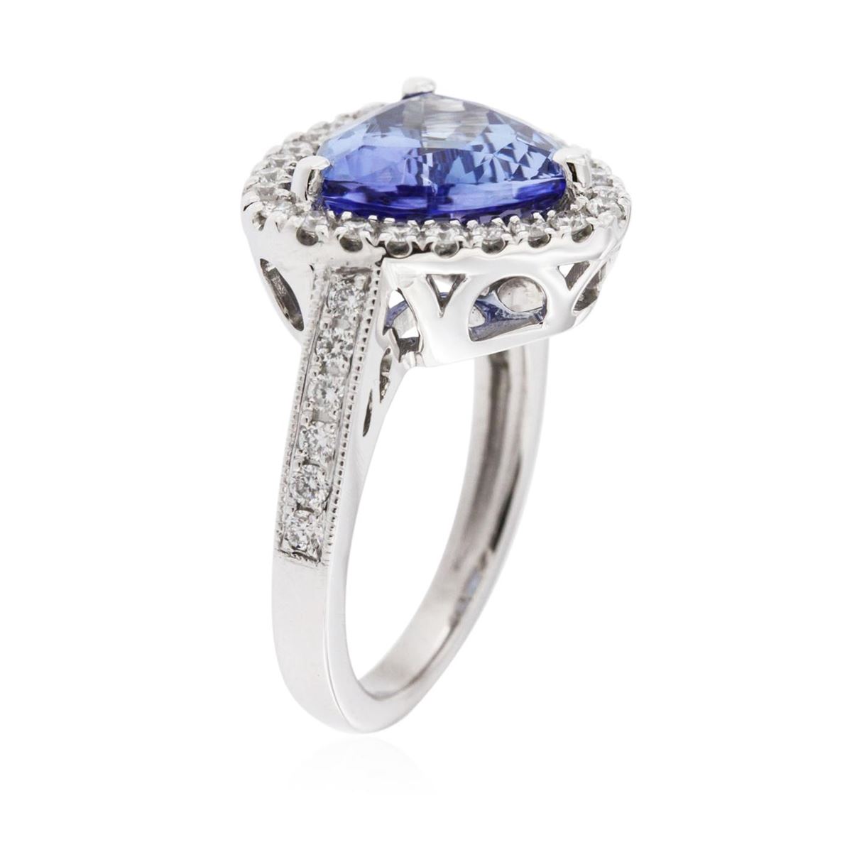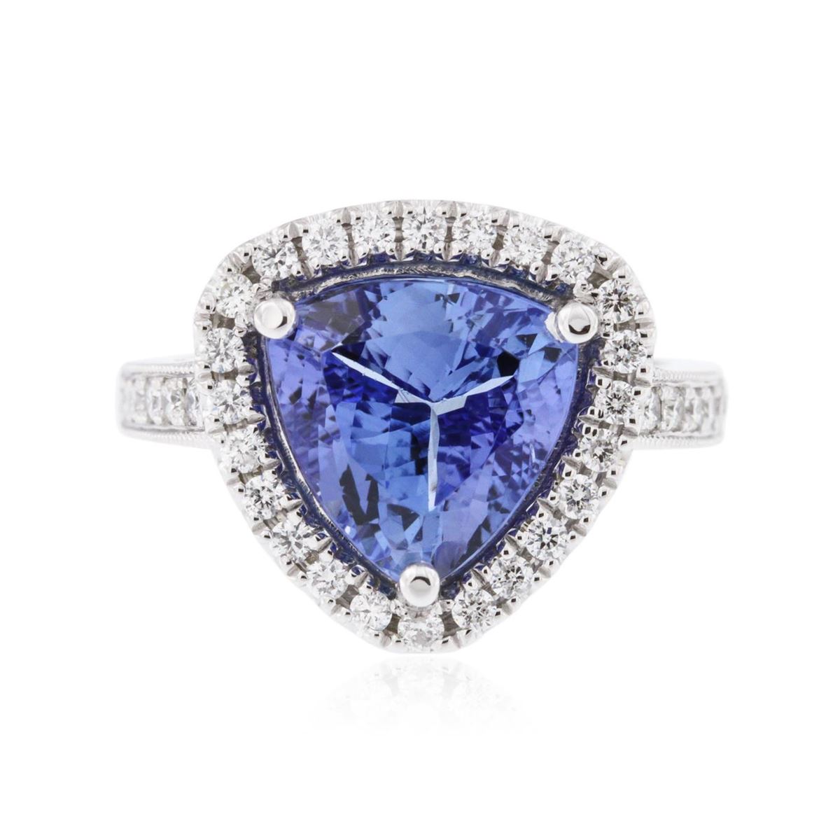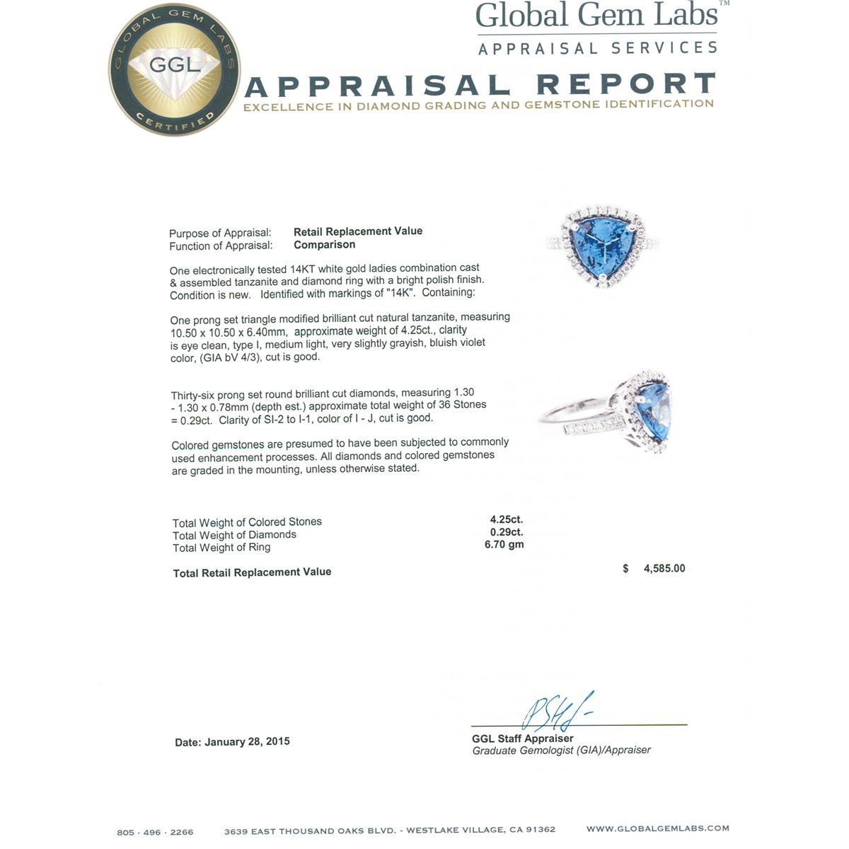 One electronically tested 14KT white gold ladies combination cast & assembled tanzanite and diamond ring with a bright polish finish. Identified with markings of "14K". Condition is new. Containing: One prong set triangle modified brilliant cut natural ta GGL Appraised at $4,585.00.