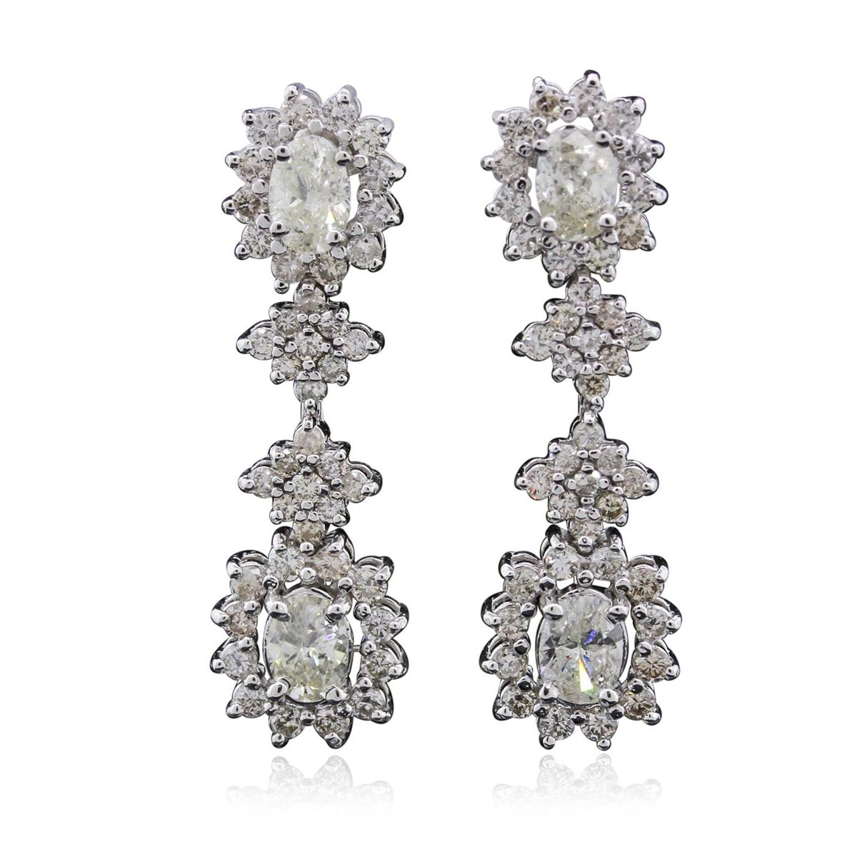 One pair electronically tested 14KT white gold ladies cast & assembled diamond dangle style earrings with standard backs. Condition is good. Bright polish finish. Containing: Four prong set oval shaped cut diamonds, measuring 6.30 x 4.60 x 3.00mm (depth est.) approximate. Total Weight of 4 Stones = 2.21ct. Measurements are an average for the group. Graded in the setting. Clarity: I-1 to I-2. Color: I - K Eighty-Four prong set round brilliant cut diamonds, measuring 2.00 - 1.70 x 1.11mm (depth est.) approximate. Total Weight of 84 Stones = 2.04ct. Graded in the setting. Clarity: SI-2 to I-1. Color: J - L. Total Weight of Diamonds 4.25ct. Total Weight of Earrings 9.00 grams. AIG Appraised at $15,745.00.
