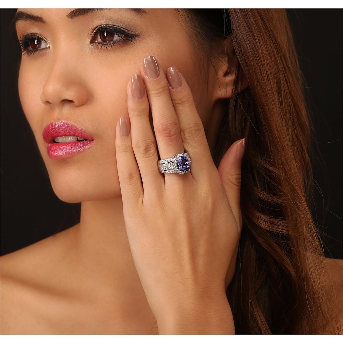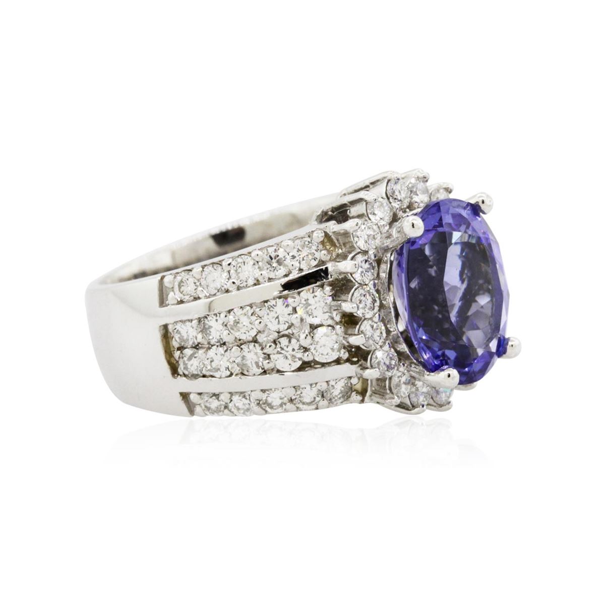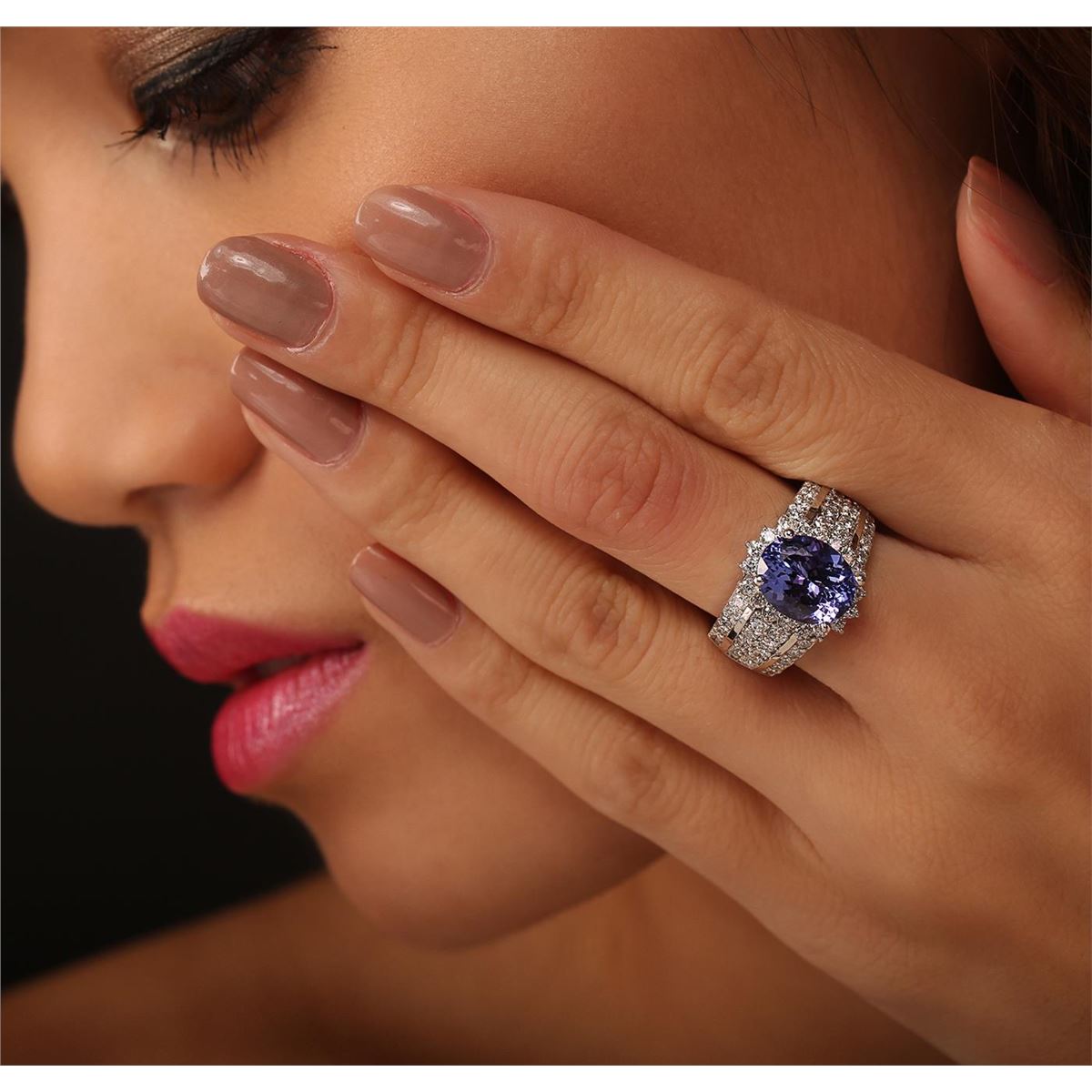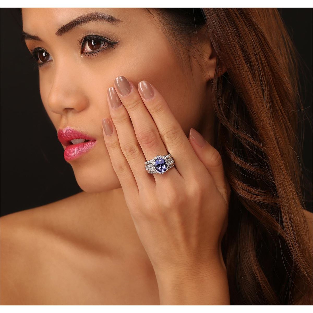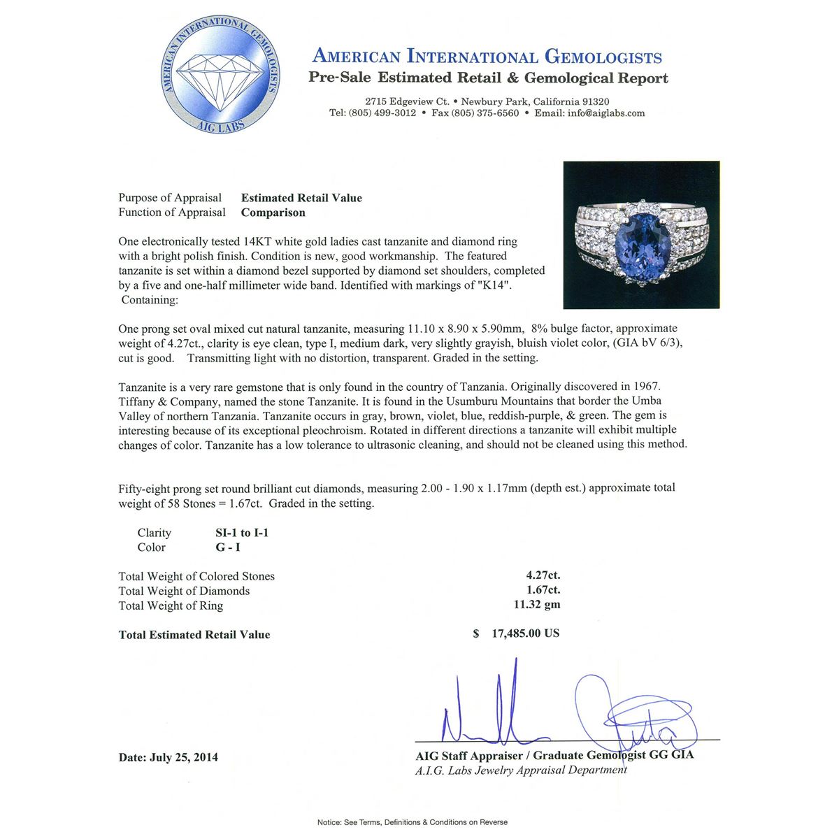 One electronically tested 14KT white gold ladies cast tanzanite and diamond ring with a bright polish finish. The featured tanzanite is set within a diamond bezel supported by diamond set shoulders, completed by a five and one-half millimeter wide band. Identified with markings of "K14". Condition is new, good workmanship. Containing: One prong set oval mixed cut natural tanzanite, measuring 11.10 x 8.90 x 5.90mm, 8%. bulge factor, approximate weight of 4.27ct., clarity is eye clean, type I, medium dark, very slightly grayish, bluish violet color, (GIA bV 6/3), cut is good. Transmitting light with no distortion, transparent. Graded in the setting. Tanzanite is a very rare gemstone that is only found in the country of Tanzania. Originally discovered in 1967. Tiffany & Company, named the stone Tanzanite. It is found in the Usumburu Mountains that border the Umba Valley of northern Tanzania. Tanzanite occurs in gray, brown, violet, blue, reddish-purple, & green. The gem is interesting because of its exceptional pleochroism. Rotated in different directions a tanzanite will exhibit multiple changes of color. Tanzanite has a low tolerance to ultrasonic cleaning, and should not be cleaned using this method. Fifty-Eight prong set round brilliant cut diamonds, measuring 2.00 - 1.90 x 1.17mm (depth est.) approximate total weight of 58 Stones = 1.67ct. Graded in the setting. Clarity: SI-1 to I-1. Color: G - I. Total Weight of Colored Stones 4.27ct. Total Weight of Diamonds 1.67ct. Total Weight of Ring 11.32 grams. AIG Appraised at $17,485.00.