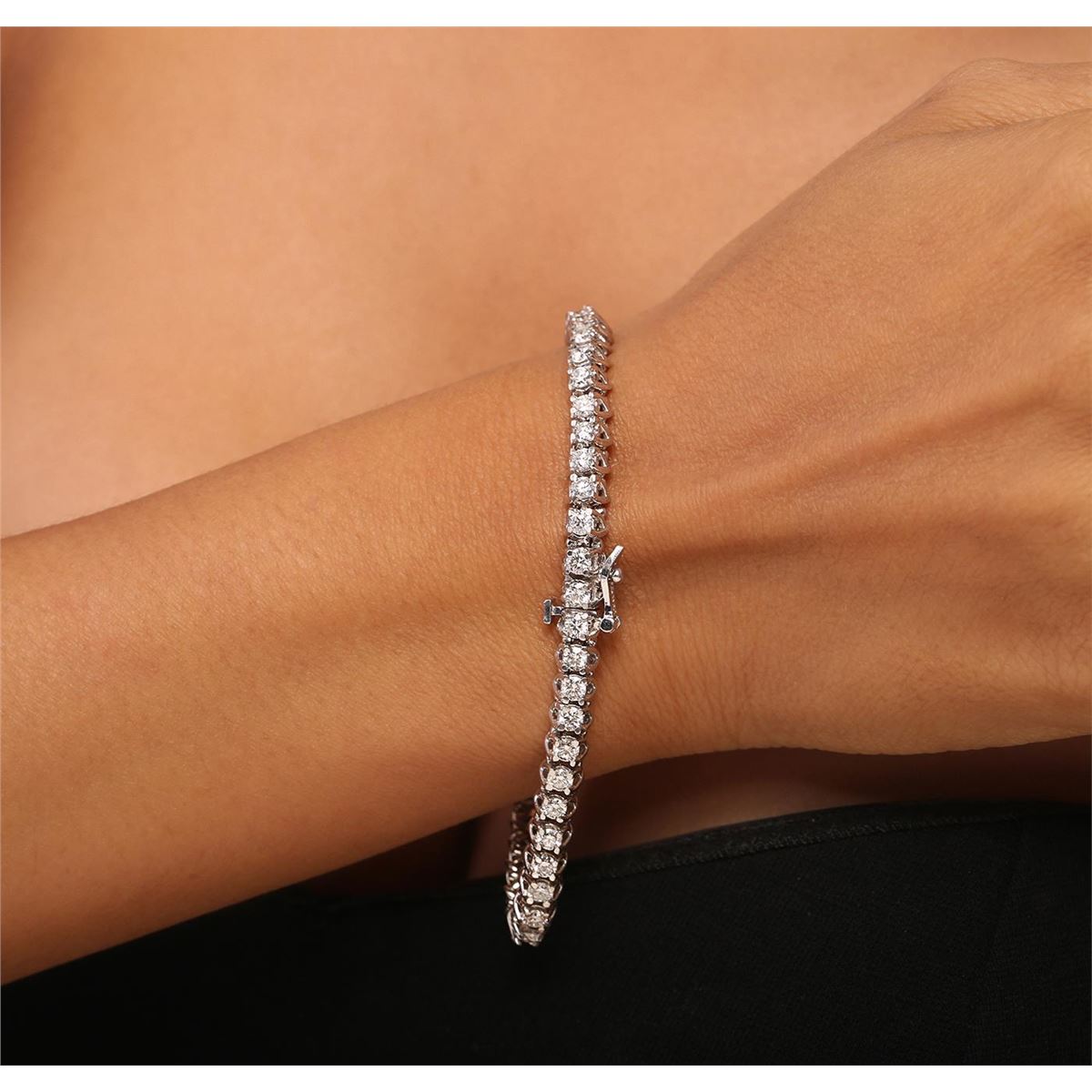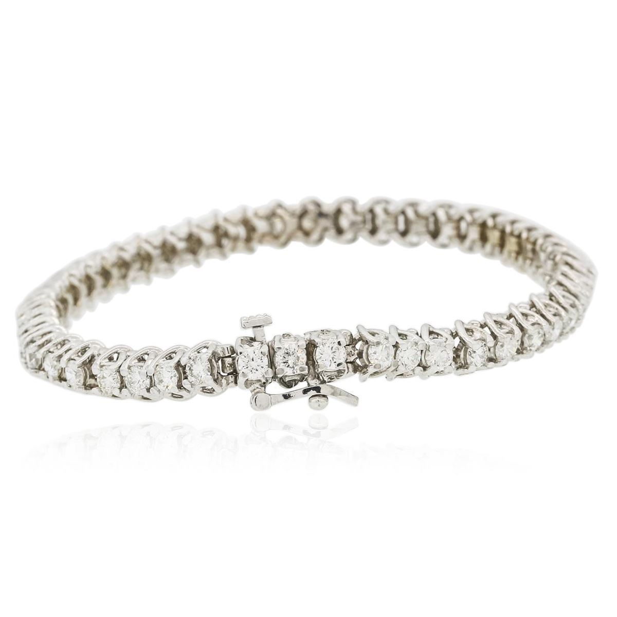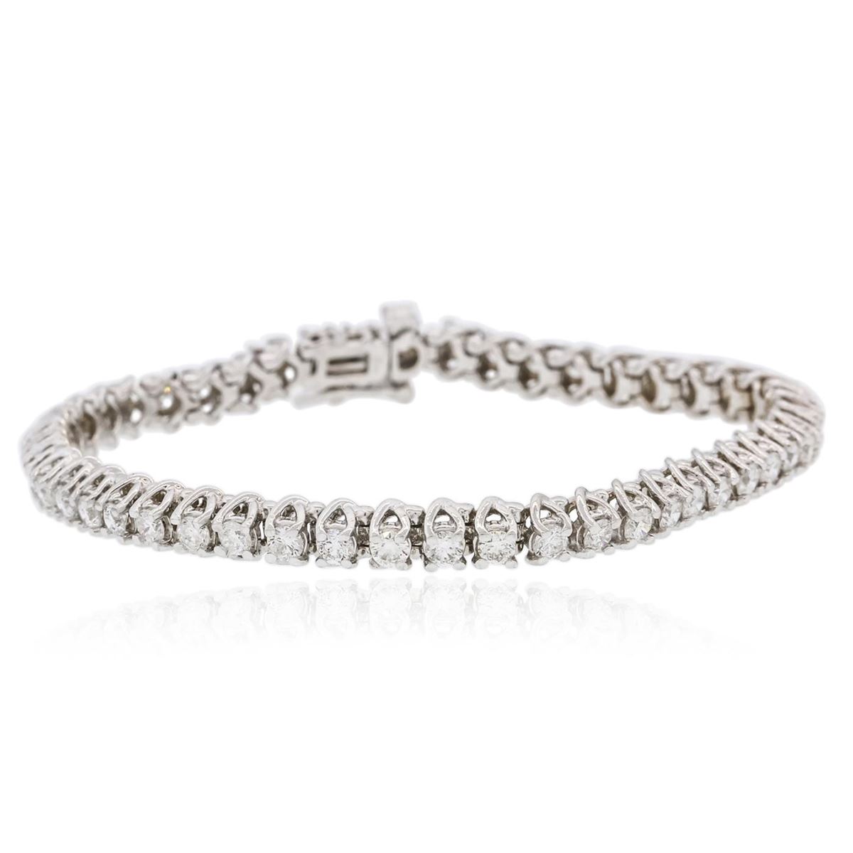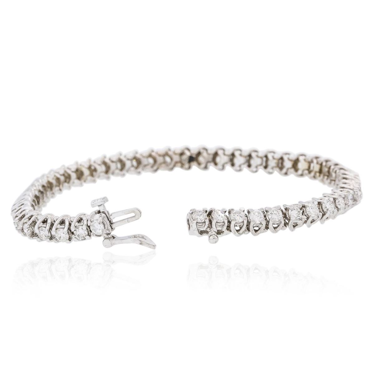 One electronically tested 14KT white gold ladies combination cast & assembled tennis bracelet with a hidden box clasp with a bright polish finish. Condition is new. Measurements: 6.85" in length. Identified with markings of "14K". Containing: Forty-Eight prong set round brilliant cut diamonds, measuring 2.90 - 2.90 x 1.74mm (depth est.) approximate total weight of 48 Stones = 4.28ct. Clarity: SI-2 to I-1. Color: H - J, Cut is Good. All diamonds are graded in the mounting, unless otherwise stated. Total Weight of Diamonds 4.28ct. Total Weight of Bracelet 17.70 grams. GGL Appraised at $17,940.00.
