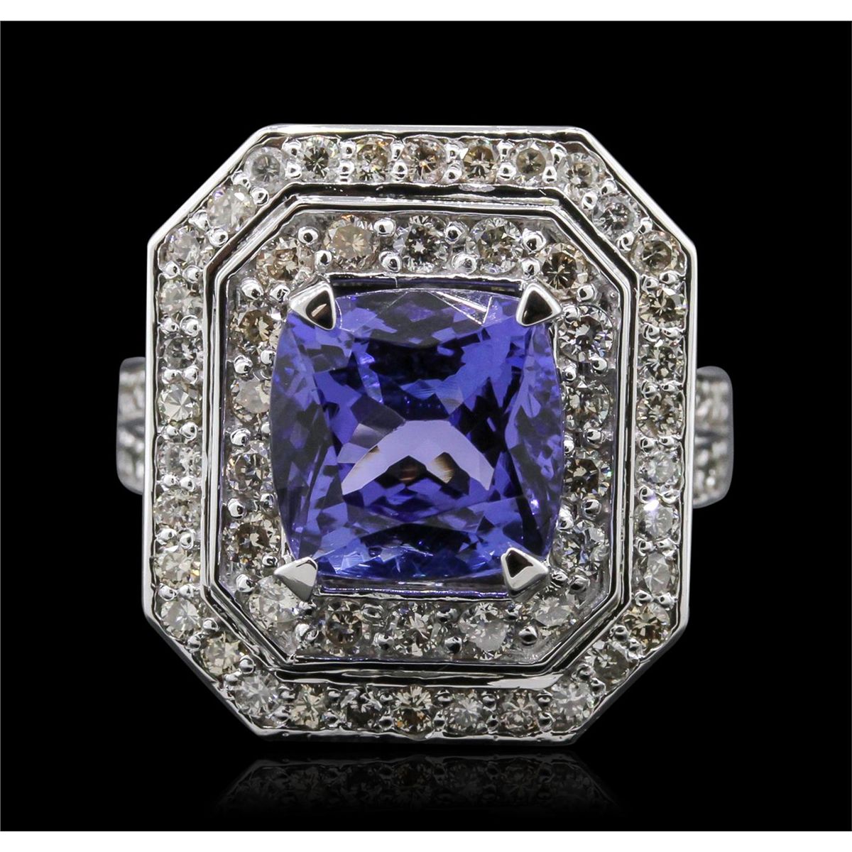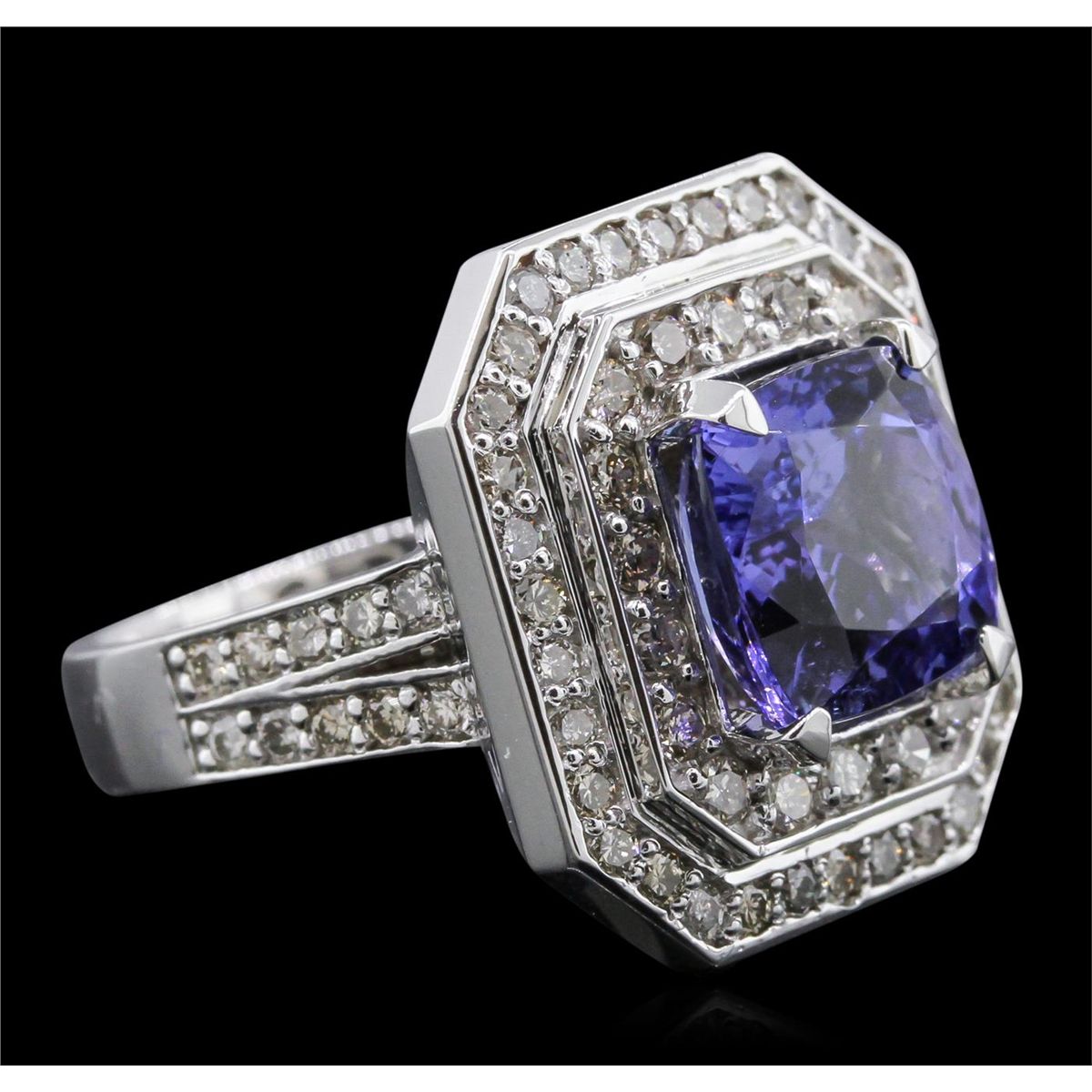 One electronically tested 14KT white gold ladies cast tanzanite and diamond ring with a bright polish finish. Condition is new, good workmanship. The featured tanzanite is set within a two tiered diamond bezel, supported by diamond set shoulders and completed by a three and one-half millimeter wide band. Identified with markings of "14K". Containing: One prong set rectangular cushion mixed cut natural tanzanite, measuring 9.15 x 9.05 x 6.10mm, 8%. bulge factor, approximate weight of 4.29ct., clarity is eye clean, type I, medium dark, very slightly grayish, violet color, (GIA V 6/3), cut is good. Transmitting light with no distortion, transparent. Graded in the setting. Tanzanite is a very rare gemstone that is only found in the country of Tanzania. Originally discovered in 1967. Tiffany & Company, named the stone Tanzanite. It is found in the Usumburu Mountains that border the Umba Valley of northern Tanzania. Tanzanite occurs in gray, brown, violet, blue, reddish-purple, & green. The gem is interesting because of its exceptional pleochroism. Rotated in different directions a tanzanite will exhibit multiple changes of color. Tanzanite has a low tolerance to ultrasonic cleaning, and should not be cleaned using this method. Seventy-Three bead set round brilliant cut diamonds, measuring 1.80 - 1.60 x 1.02mm (depth est.) approximate. Total Weight of 73 Stones = 1.40ct. The color grade ranges from faint to very light brown in color for this group. Graded in the setting. Clarity: SI-1 to I-1. Total Weight of Colored Stones 4.29ct. Total Weight of Diamonds 1.40ct. Total Weight of Ring 11.80 grams. AIG Appraised at $14,825.00.
