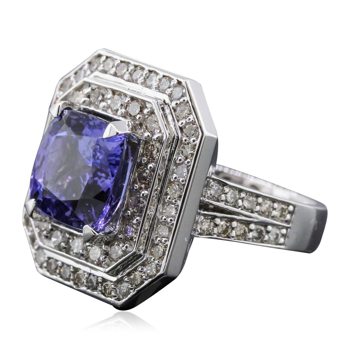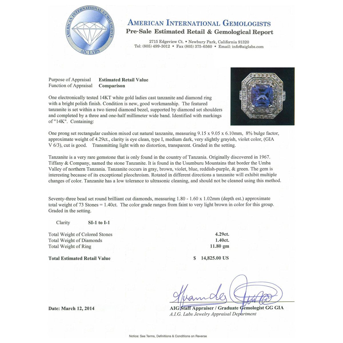 One electronically tested 14KT white gold ladies cast tanzanite and diamond ring with a bright polish finish. Condition is new, good workmanship. The featured tanzanite is set within a two tiered diamond bezel, supported by diamond set shoulders and completed by a three and one-half millimeter wide band. Identified with markings of "14K". Containing: One prong set rectangular cushion mixed cut natural tanzanite, measuring 9.15 x 9.05 x 6.10mm, 8%. bulge factor, approximate weight of 4.29ct., clarity is eye clean, type I, medium dark, very slightly grayish, violet color, (GIA V 6/3), cut is good. Transmitting light with no distortion, transparent. Graded in the setting. Tanzanite is a very rare gemstone that is only found in the country of Tanzania. Originally discovered in 1967. Tiffany & Company, named the stone Tanzanite. It is found in the Usumburu Mountains that border the Umba Valley of northern Tanzania. Tanzanite occurs in gray, brown, violet, blue, reddish-purple, & green. The gem is interesting because of its exceptional pleochroism. Rotated in different directions a tanzanite will exhibit multiple changes of color. Tanzanite has a low tolerance to ultrasonic cleaning, and should not be cleaned using this method. Seventy-Three bead set round brilliant cut diamonds, measuring 1.80 - 1.60 x 1.02mm (depth est.) approximate. Total Weight of 73 Stones = 1.40ct. The color grade ranges from faint to very light brown in color for this group. Graded in the setting. Clarity: SI-1 to I-1. Total Weight of Colored Stones 4.29ct. Total Weight of Diamonds 1.40ct. Total Weight of Ring 11.80 grams. AIG Appraised at $14,825.00.