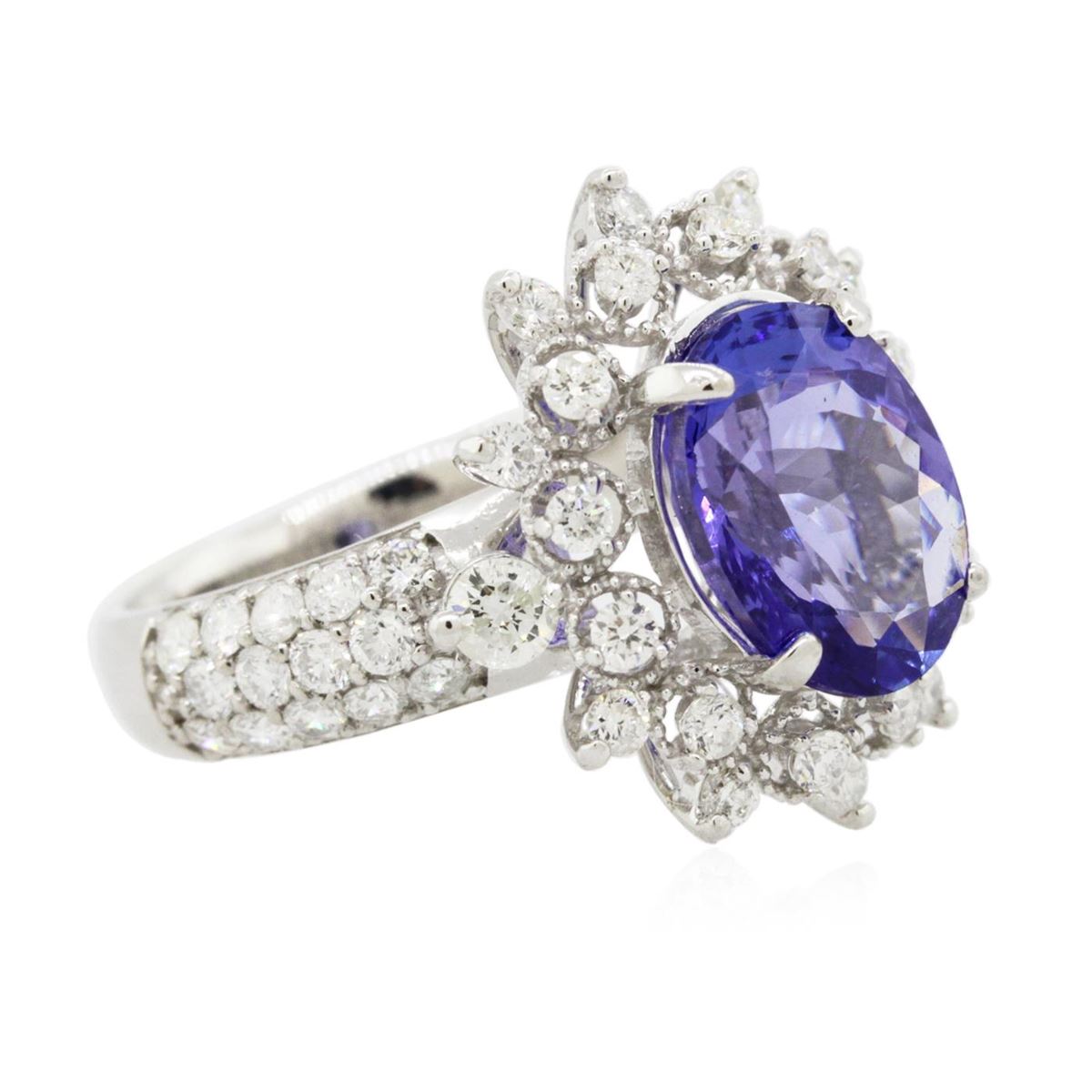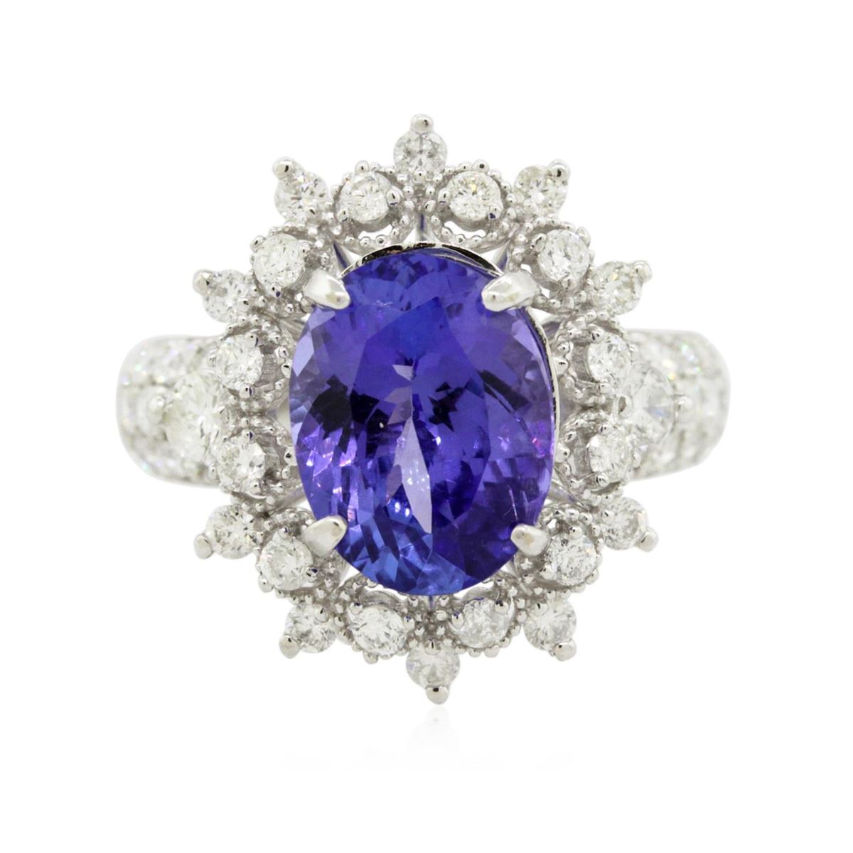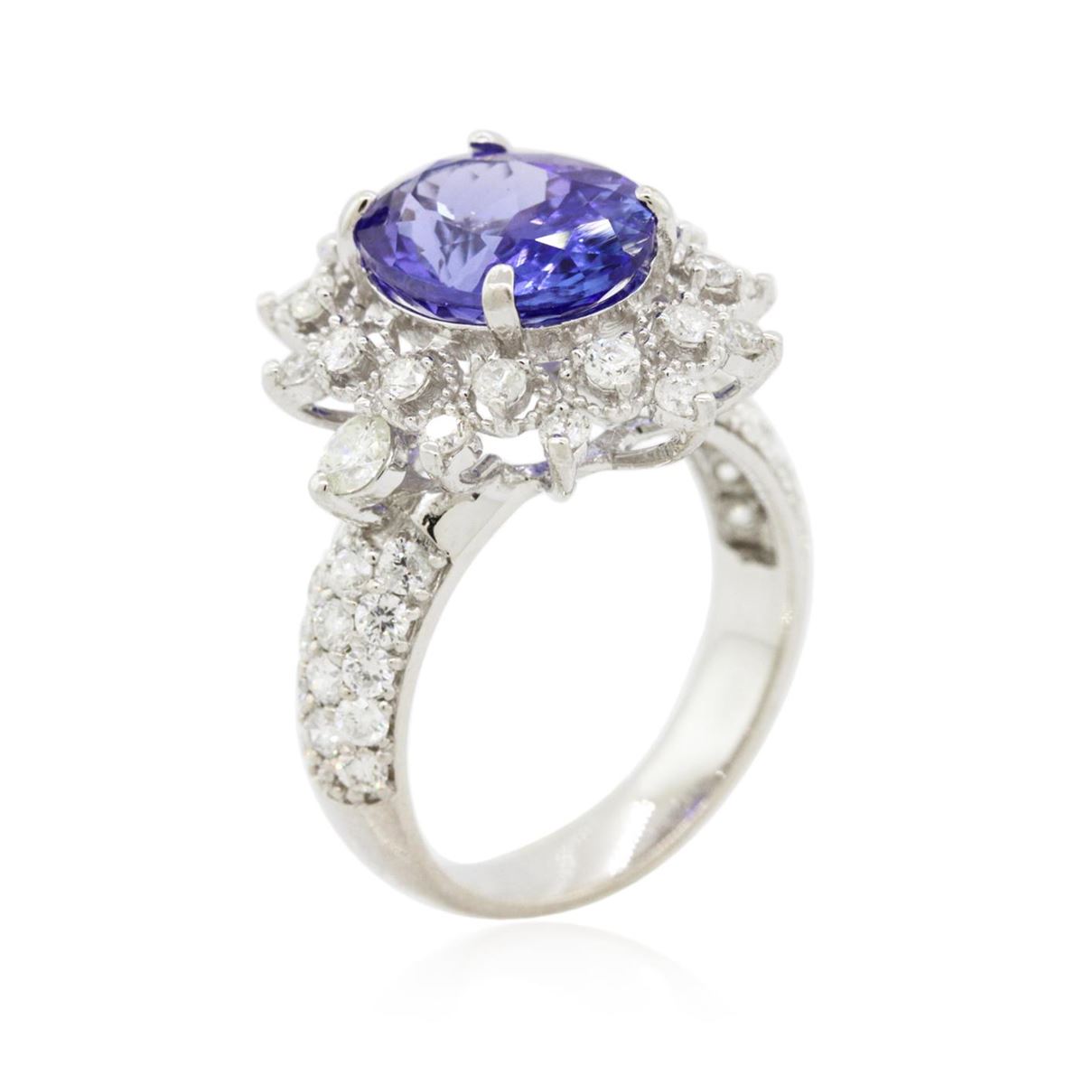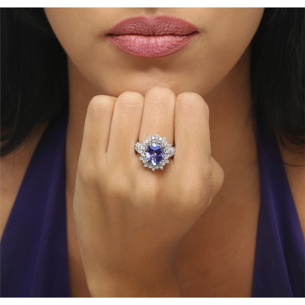 One electronically tested 14KT white gold ladies cast tanzanite and diamond ring. Condition is new, good workmanship. The featured tanzanite is set within a stylized diamond bezel supported by diamond set shoulders, completed by a three and one-half millimeter wide band. Bright polish finish with milgrain detailing. Identified with markings of "K14". Containing: One prong set oval brilliant cut natural tanzanite, measuring 11.40 x 8.70 x 6.00mm, 6%. bulge factor, approximate weight of 4.30ct., clarity is eye clean, type I, medium dark, very slightly grayish, bluish violet color, (GIA bV 6/3), cut is good. Transmitting light with no distortion, transparent. Graded in the setting.Tanzanite is a very rare gemstone that is only found in the country of Tanzania. Originally discovered in 1967. Tiffany & Company, named the stone Tanzanite. It is found in the Usumburu Mountains that border the Umba Valley of northern Tanzania. Tanzanite occurs in gray, brown, violet, blue, reddish-purple, & green. The gem is interesting because of its exceptional pleochroism. Rotated in different directions a tanzanite will exhibit multiple changes of color. Tanzanite has a low tolerance to ultrasonic cleaning, and should not be cleaned using this method.Fifty-Two prong set round brilliant cut diamonds, measuring 1.90 - 1.80 x 1.11mm (depth est.) approximate. Total Weight of 52 Stones = 1.30ct. Graded in the setting. Clarity: I-1 to I-2. Color: H - J. Total Weight of Colored Stones 4.30ct. Total Weight of Diamonds 1.30ct. Total Weight of Ring 6.64gm. AIG Appraised at $14,780.00.