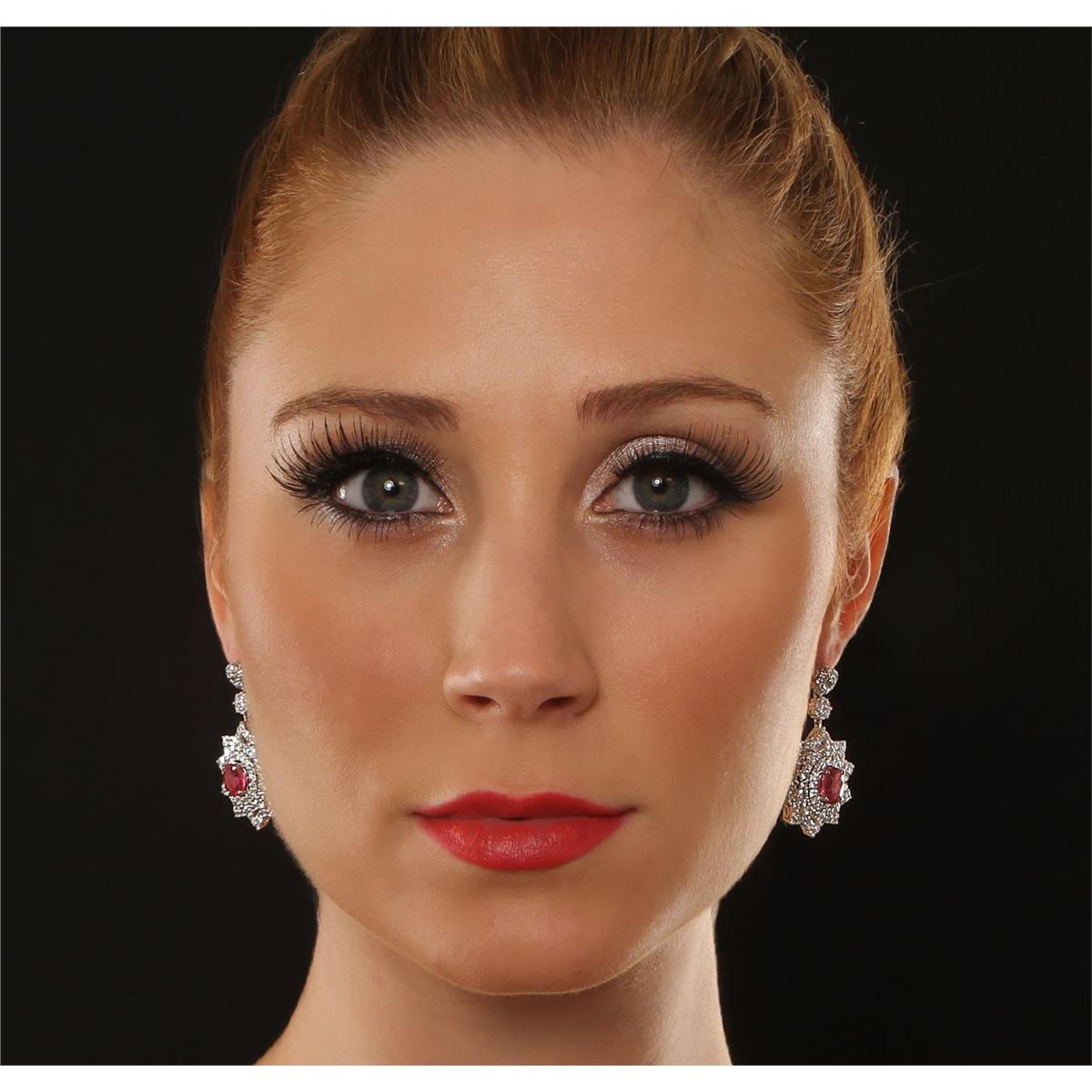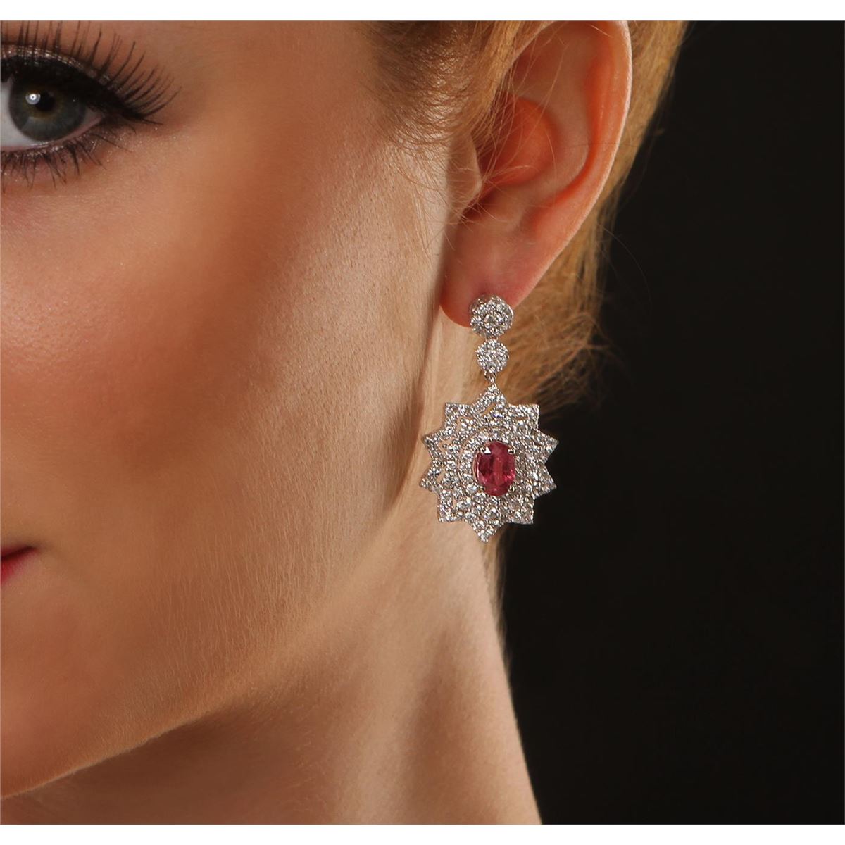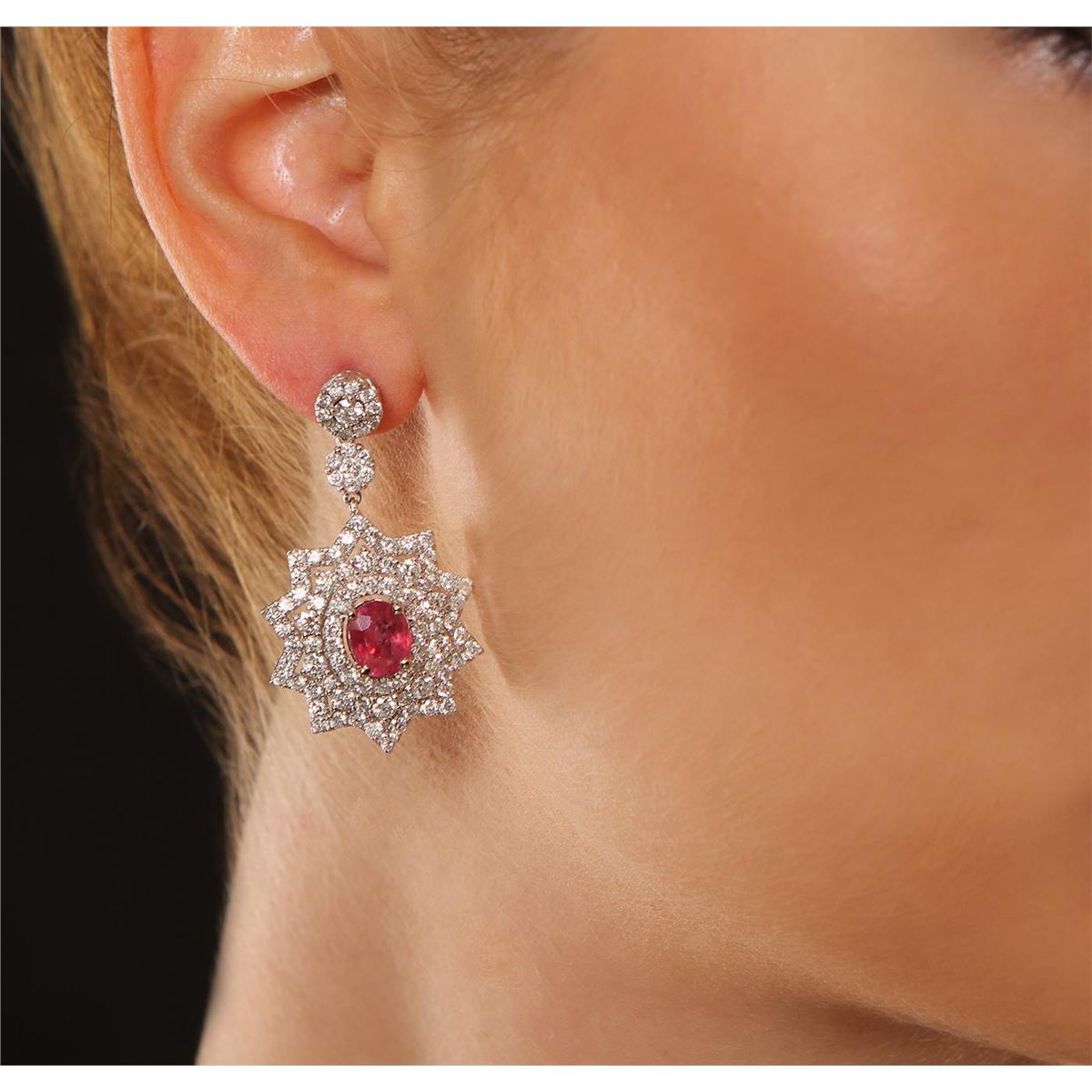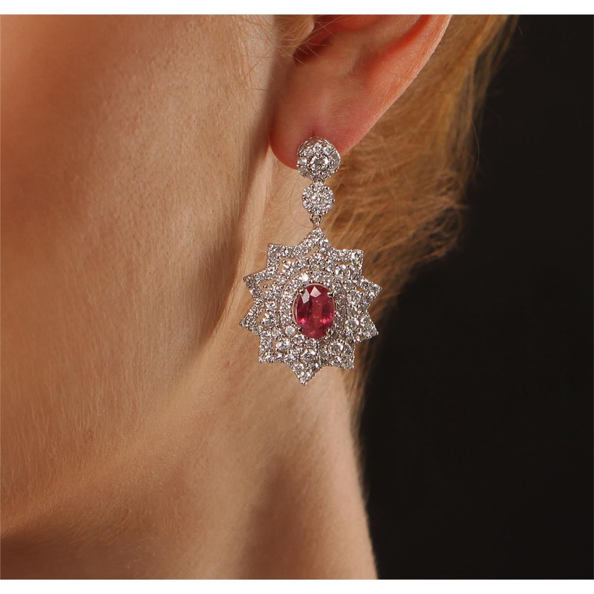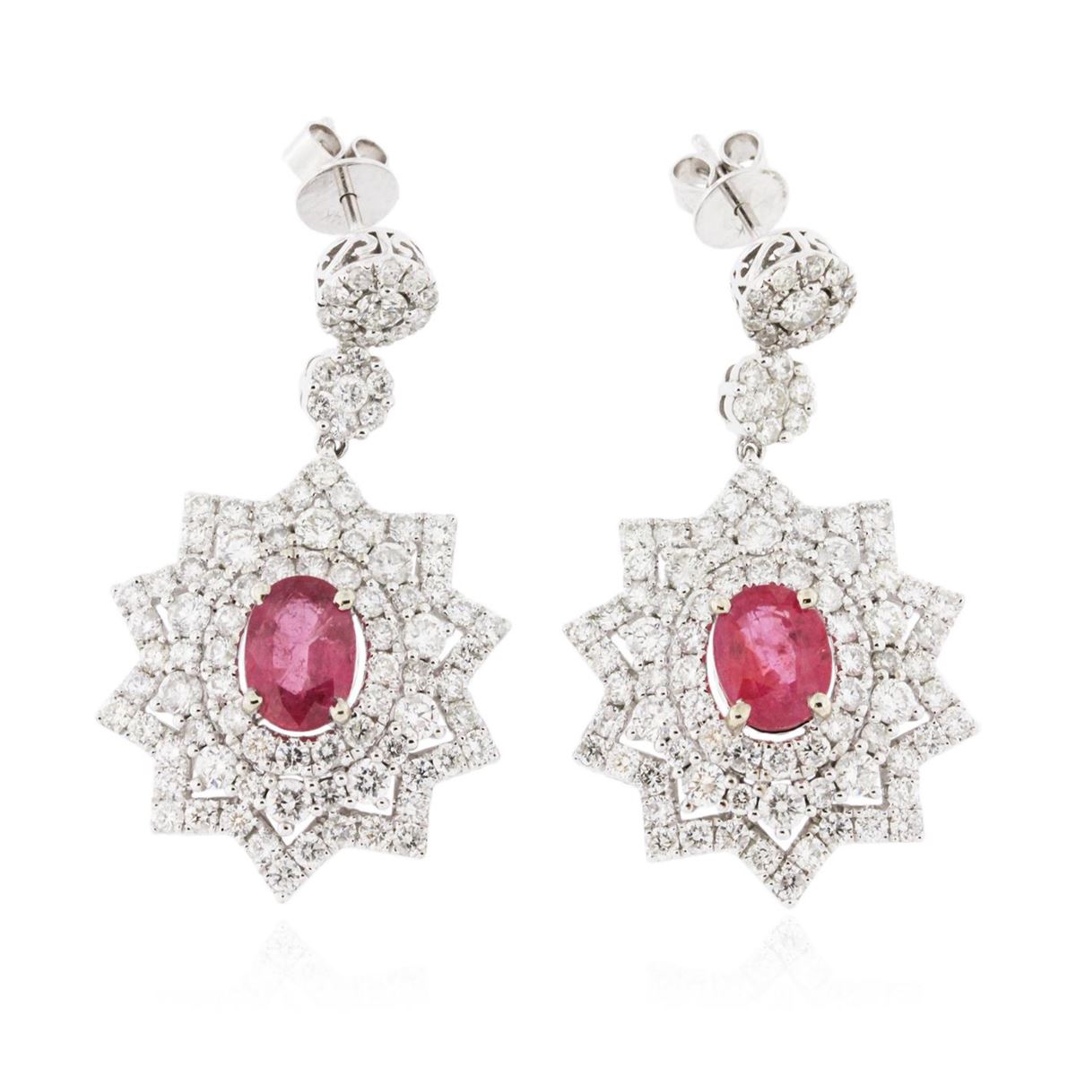 One pair electronically tested 14KT white gold ladies cast & assembled ruby and diamond earrings with standard backs. Condition is new, good workmanship. Each earring features a ruby set within an elaborate tiered diamond set stylized star burst design, completed by double diamond set cluster drops. Bright polish finish. Identified with markings of "14K". Containing: Two prong set oval mixed cut natural rubies, measuring 9.00 x 6.00 x 4.30mm, 10% bulge factor, approximate total weight of 4.32ct., clarity is heavily included, type II, medium, very slightly brownish, slightly purplish red color, (GIA slpR 5/3), cut is good. Transmitting light somewhat diffusely, transparent to translucent. Naturally occurring internal & external characteristics are present. Indications of laboratory high temperature heat treatment, with flux additives. Measurements & the color grade are an average for the pair. Graded in the setting. Ruby has a low tolerance to rhodium plating, repolishing the surface, & ultrasonic cleaning. One hundred eighty-eight prong set round brilliant cut diamonds, measuring 2.60 - 1.90 x 1.35mm (depth est.) approximate total weight of 188 stones = 5.50ct. Graded in the setting. Clarity SI-1 to I-1. Color G-I. Total weight of Ruby 4.32ct. Total weight of Diamonds 5.50ct. Total weight of Earrings 14.67gm. AIG Appraised at $19,220.00.