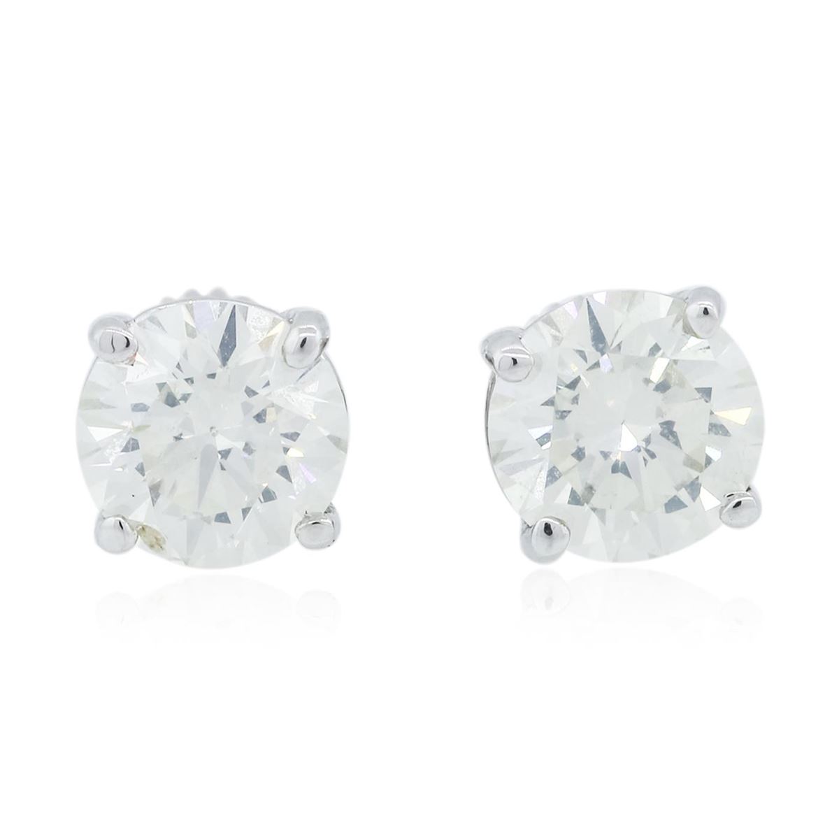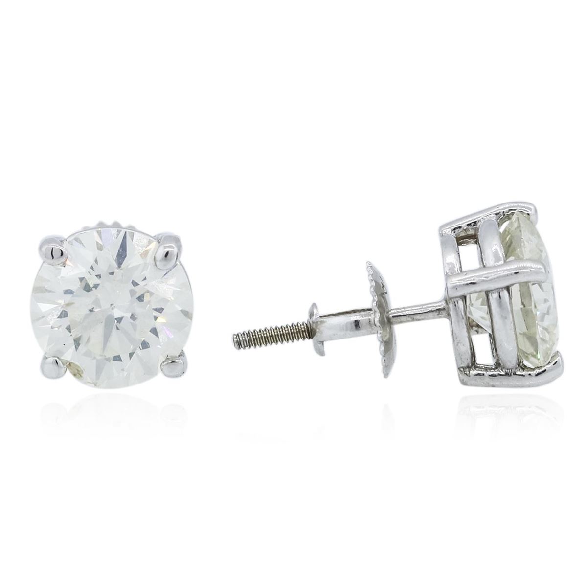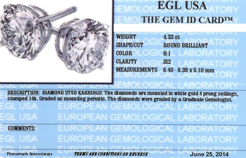 One pair electronically tested 14KT white gold Ladies cast stud earrings with screw backs with a bright polish finish. Condition is new. Identified with markings of "14K". Containing: One prong set round brilliant cut diamond, measuring 8.27 - 8.34 x 5.05mm (depth est.) approximate weight of 2.16ct. Clarity: SI-2. Color: H, Cut is Good. One prong set round brilliant cut diamond, measuring 8.40 - 8.33 x 5.02mm (depth est.) approximate weight of 2.17ct. Clarity: SI-2. Color: I, Cut is Good. EGL USA GEM ID# US 911348441D. All diamonds are graded in the mounting, unless otherwise stated. Total Weight of Diamonds 4.33ct. Total Weight of Earrings 3.10 grams. GGL Appraised at $103,735.00.
