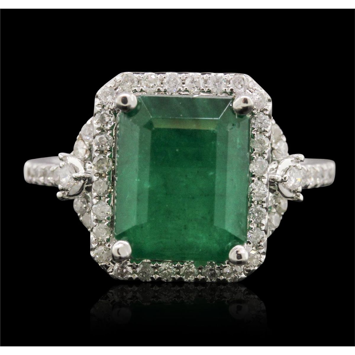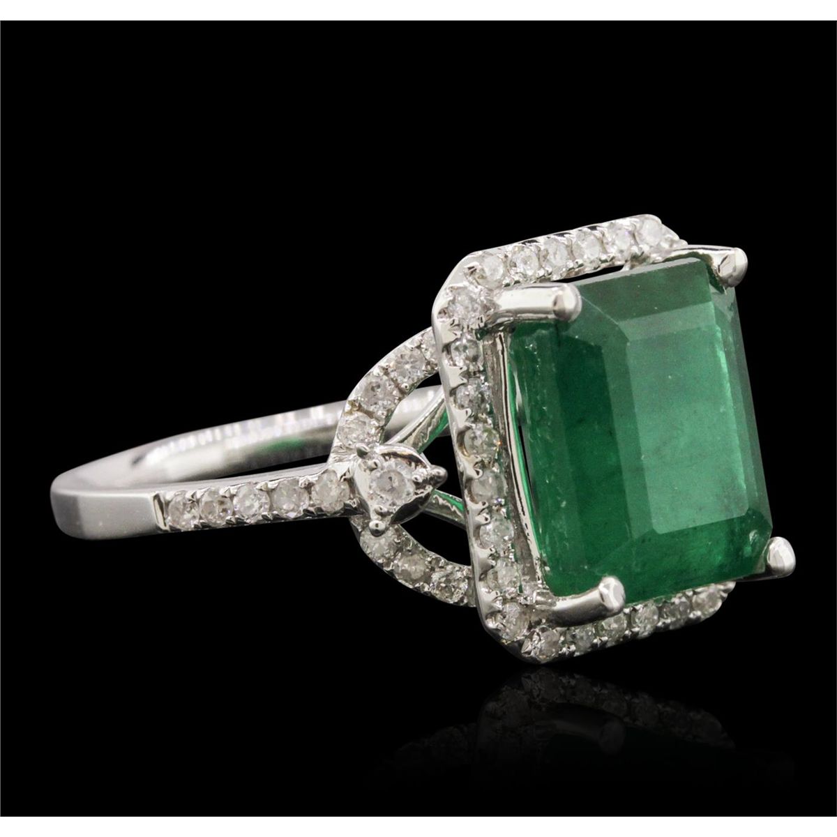 One electronically tested 14KT white gold ladies cast emerald and diamond ring with a bright polish finish. The featured emerald is set within a diamond bezel supported by diamond set shoulders, completed by a one and one-half millimeter wide band. Trademark is PMI. Identified with markings of "14K". Condition is new, good workmanship. Containing: One prong set rectangular step cut natural emerald, measuring 10.55 x 8.40 x 5.55mm, 8%. bulge factor, approximate weight of 4.33ct., clarity is heavily included, type III, medium dark, moderately strong, very slightly bluish green color, (GIA vslbG 6/4), cut is good. Transmitting light somewhat diffusely, transparent to translucent. Naturally occurring internal & external characteristics are present. Indications of oil residue. Graded in the setting. Fifty-Six prong set round brilliant cut diamonds, measuring 1.40 - 1.30 x 0.81mm (depth est.) approximate total weight of 56 Stones = 0.60ct. Graded in the setting. Clarity: I-1 to I-3. Color: H - J. Total Weight of Colored Stones 4.33ct. Total Weight of Diamonds 0.60ct. Total Weight of Ring 4.57 grams. AIG Appraised at $8,445.00.