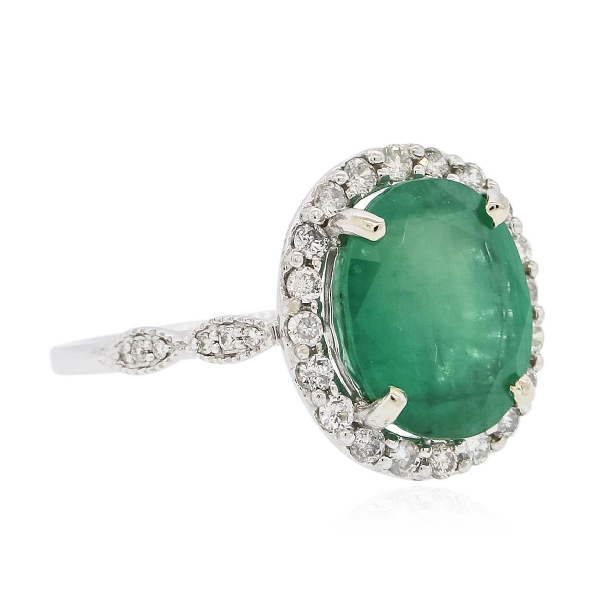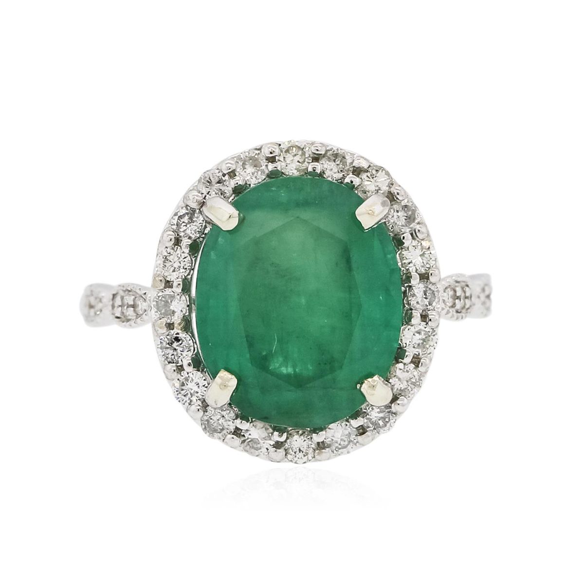 One electronically tested 14KT white gold ladies cast emerald and diamond ring. The featured emerald is set within a diamond bezel supported by a lattice under gallery and diamond set shoulders, completed by a one and one-half millimeter wide band. Bright polish finish with milgrain detailing. Trademark is PMI. Identified with markings of "14K". Condition is new, good workmanship. Containing: One prong set oval mixed cut natural emerald, measuring 12.60 x 10.35 x 5.60mm, 8% bulge factor, approximate weight of 4.33ct., clarity is heavily included, type III, medium dark, very slightly grayish, very slightly bluish green color, (GIA vslbG 6/3), cut is good. Transmitting light somewhat diffusely, transparent to translucent. Naturally occurring internal & external characteristics are present. Indications of oil residue. Graded in the setting. Twenty prong set round brilliant cut diamonds, measuring 1.80 - 1.70 x 1.05mm (depth est.) approximate total weight of 20 Stones = 0.49ct. Graded in the setting. Clarity: I-1 to I-2. Color: G - I Twelve bead set round brilliant cut diamonds, measuring 1.20 - 1.10 x 0.69mm (depth est.) approximate total weight of 12 Stones = 0.10ct. Graded in the setting. Clarity: SI-2 to I-1. Color: G - I. Total Weight of Colored Stones 4.33ct. Total Weight of Diamonds 0.59ct. Total Weight of Ring 5.43 grams. AIG Appraised at $9,460.00.