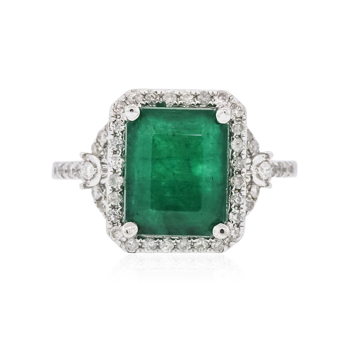 One electronically tested 14KT white gold ladies cast emerald and diamond ring with a bright polish finish. The featured emerald is set within a diamond bezel supported by diamond set shoulders, completed by a one and one-half millimeter wide band. Trademark is PMI. Identified with markings of "14K". Condition is new, good workmanship. Containing: One prong set rectangular step cut natural emerald, measuring 10.55 x 8.40 x 5.55mm, 8%. bulge factor, approximate weight of 4.33ct., clarity is heavily included, type III, medium dark, moderately strong, very slightly bluish green color, (GIA vslbG 6/4), cut is good. Transmitting light somewhat diffusely, transparent to translucent. Naturally occurring internal & external characteristics are present. Indications of oil residue. Graded in the setting. Fifty-Six prong set round brilliant cut diamonds, measuring 1.40 - 1.30 x 0.81mm (depth est.) approximate total weight of 56 Stones = 0.60ct. Graded in the setting. Clarity: I-1 to I-3. Color: H - J. Total Weight of Colored Stones 4.33ct. Total Weight of Diamonds 0.60ct. Total Weight of Ring 4.57 grams. AIG Appraised at $8,445.00.