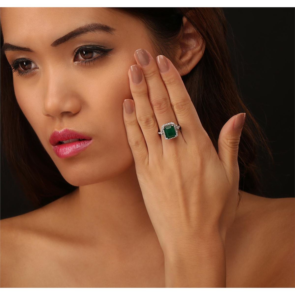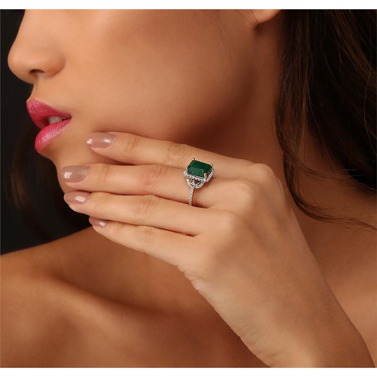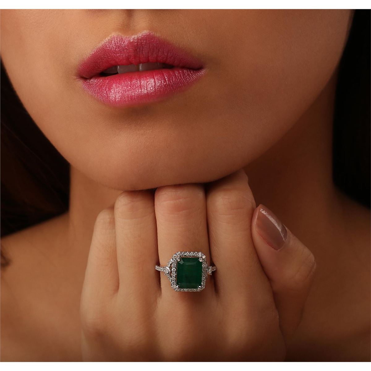 One electronically tested 14KT white gold ladies cast emerald and diamond ring with a bright polish finish. The featured emerald is set within a diamond bezel supported by diamond set shoulders, completed by a one and one-half millimeter wide band. Trademark is PMI. Identified with markings of "14K". Condition is new, good workmanship. Containing: One prong set rectangular step cut natural emerald, measuring 10.55 x 8.40 x 5.55mm, 8%. bulge factor, approximate weight of 4.33ct., clarity is heavily included, type III, medium dark, moderately strong, very slightly bluish green color, (GIA vslbG 6/4), cut is good. Transmitting light somewhat diffusely, transparent to translucent. Naturally occurring internal & external characteristics are present. Indications of oil residue. Graded in the setting. Fifty-Six prong set round brilliant cut diamonds, measuring 1.40 - 1.30 x 0.81mm (depth est.) approximate total weight of 56 Stones = 0.60ct. Graded in the setting. Clarity: I-1 to I-3. Color: H - J. Total Weight of Colored Stones 4.33ct. Total Weight of Diamonds 0.60ct. Total Weight of Ring 4.57 grams. AIG Appraised at $8,445.00.