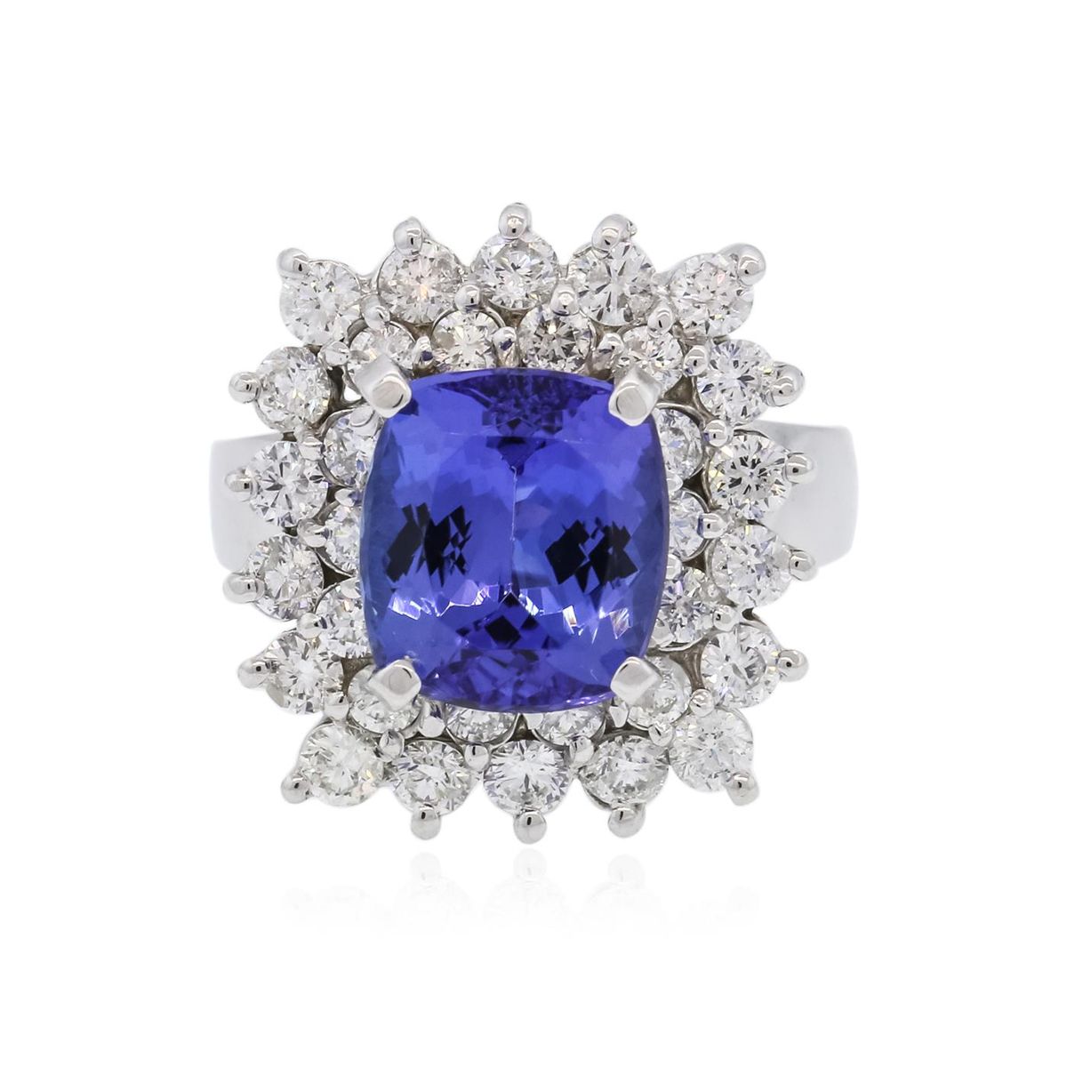One electronically tested 14KT white gold ladies combination cast & assembled ring with a bright polish finish. Identified with markings of "K14". Condition is new. Containing: One prong set rectangular cushion modified brilliant cut natural tanzanite, measuring 10.00 x 9.20 x 5.98mm, approximate weight of 4.33ct., clarity is eye clean, type I, medium light, moderately strong, bluish violet color, (GIA bV 4/4), cut is good. Thirty-Four prong set round brilliant cut diamonds, measuring 2.50 - 2.00 x 1.35mm (depth est.) approximate total weight of 34 Stones = 1.41ct. Clarity: I-1 to I-2. Color: I - J, Cut is Good. Colored gemstones are presumed to have been subjected to commonly used enhancement processes. All diamonds and colored gemstones are graded in the mounting, unless otherwise stated. Total Weight of Colored Stones 4.33ct. Total Weight of Diamonds 1.41ct. Total Weight of Ring 9.40 grams. GGL Appraised at $11,675.00.