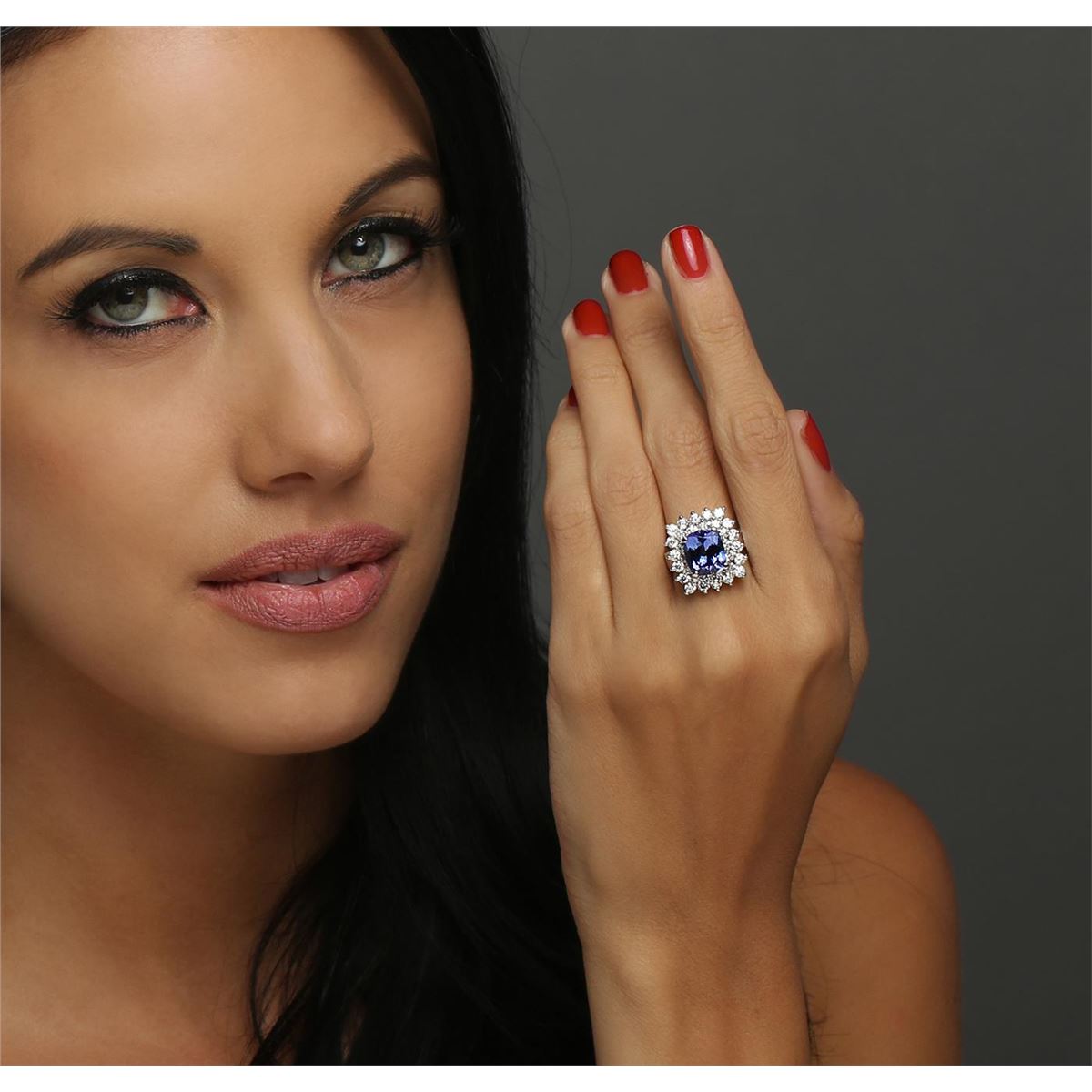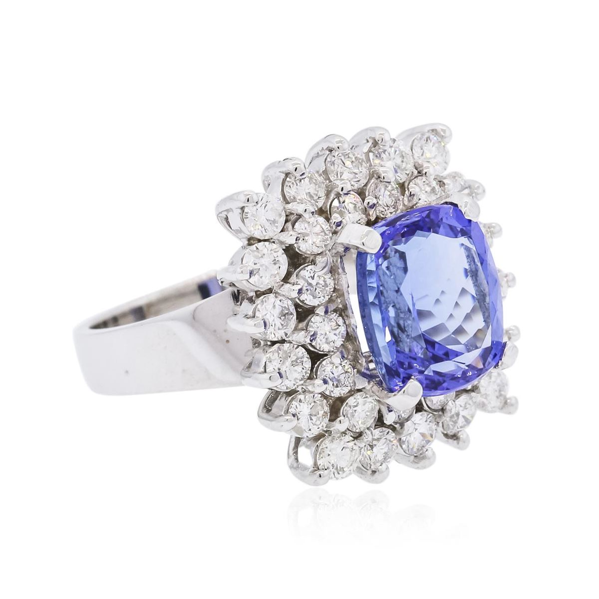 One electronically tested 14KT white gold ladies combination cast & assembled ring with a bright polish finish. Identified with markings of "K14". Condition is new. Containing: One prong set rectangular cushion modified brilliant cut natural tanzanite, measuring 10.00 x 9.20 x 5.98mm, approximate weight of 4.33ct., clarity is eye clean, type I, medium light, moderately strong, bluish violet color, (GIA bV 4/4), cut is good. Thirty-Four prong set round brilliant cut diamonds, measuring 2.50 - 2.00 x 1.35mm (depth est.) approximate total weight of 34 Stones = 1.41ct. Clarity: I-1 to I-2. Color: I - J, Cut is Good. Colored gemstones are presumed to have been subjected to commonly used enhancement processes. All diamonds and colored gemstones are graded in the mounting, unless otherwise stated. Total Weight of Colored Stones 4.33ct. Total Weight of Diamonds 1.41ct. Total Weight of Ring 9.40 grams. GGL Appraised at $11,675.00.